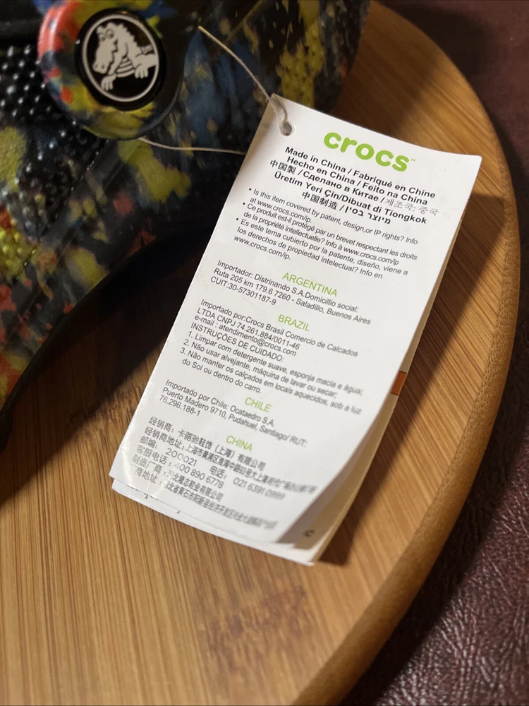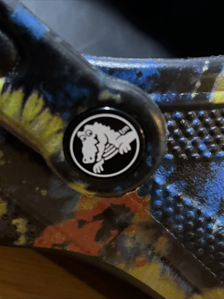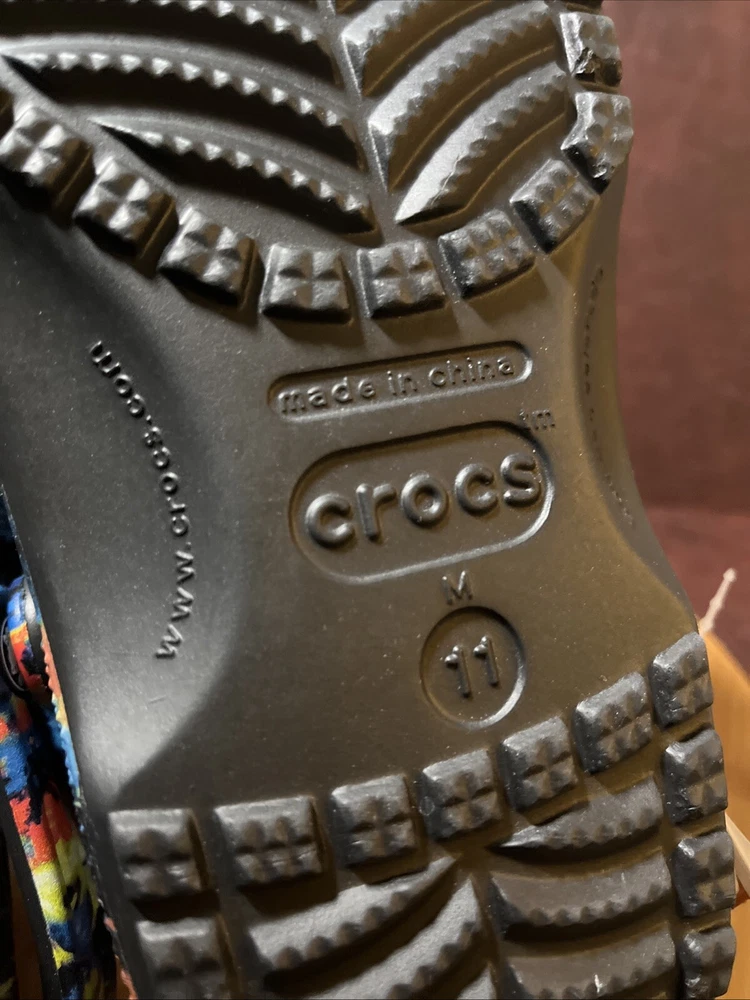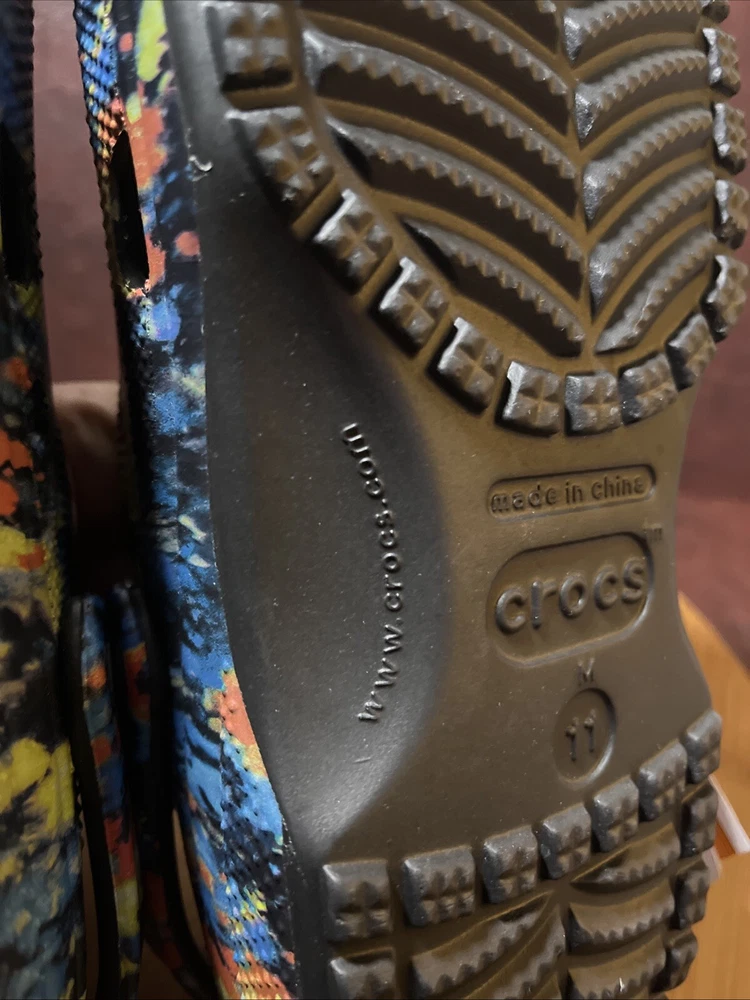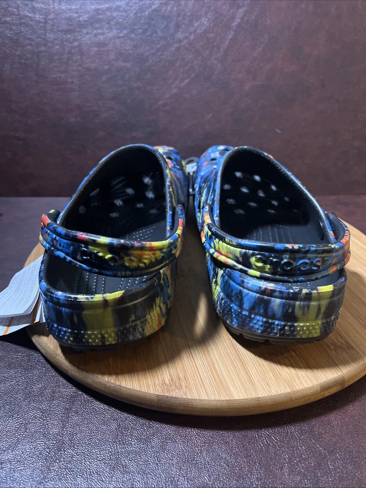 The NWT Crocs Classic Cyber Beach Clog in black multicolor splash is a unisex shoe designed for both men and women in size Mens 11 / Womens 13. This slip-on clog features a closed toe design with a paint splash pattern, accented with the Crocs logo, making it a stylish and comfortable choice for casual wear, travel, or activewear. The shoe is lightweight, breathable, and features an ankle strap for added comfort and support, suitable for outdoor activities and everyday wear in any season.