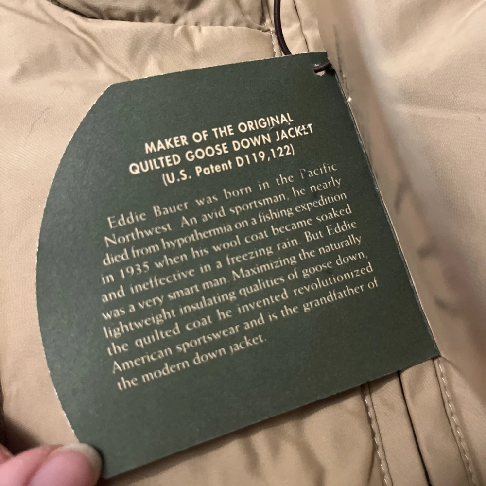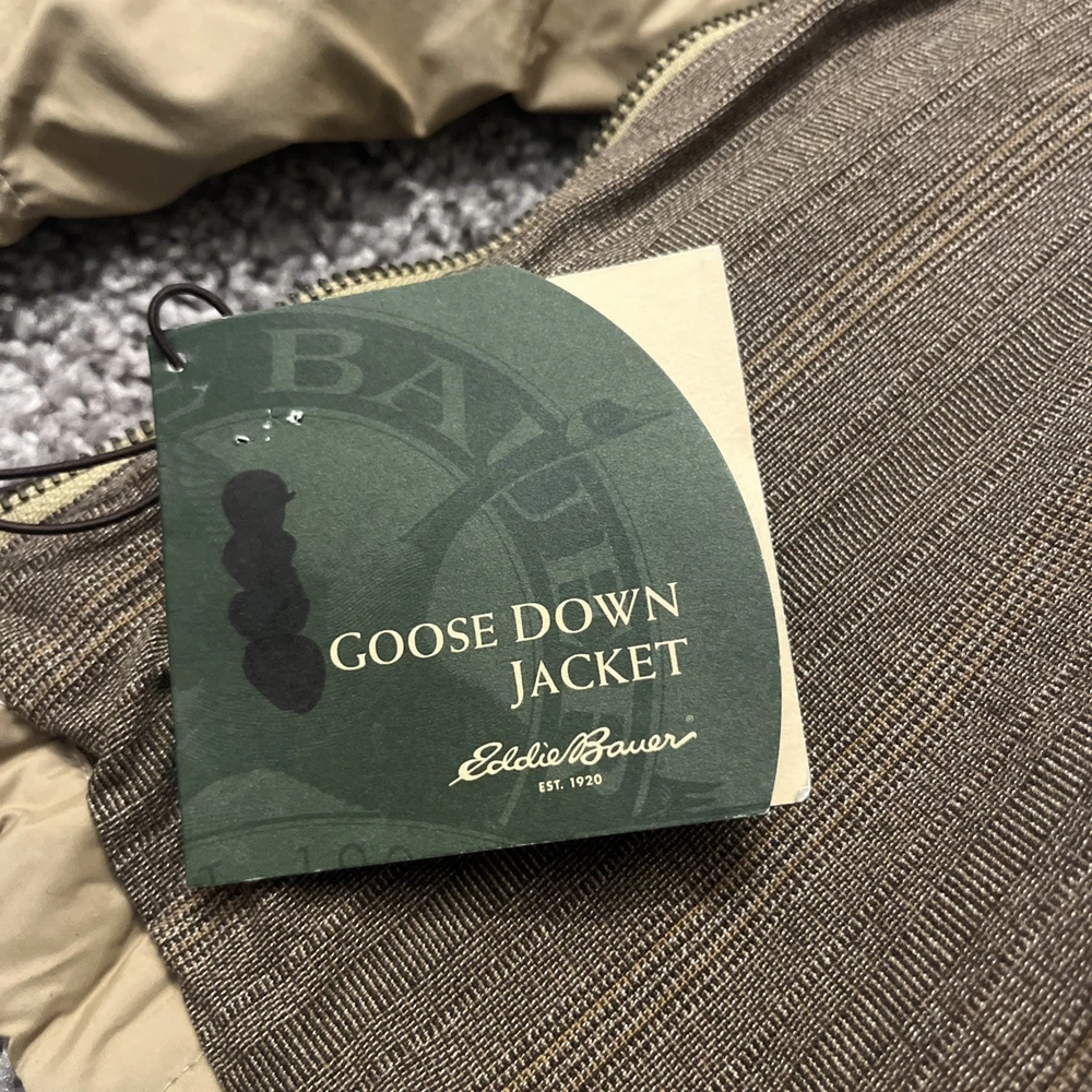 Excellent condition jacket new with tags! Comes from a smoke free home and will be packed with care. Eddie Bauer Goose Down Quilted Puffer Jacket in Adult size Large is a stylish and practical outerwear option for men. Made with a polyester outer shell and lined with soft polyester, this jacket features a solid beige color with quilted accents, giving it a retro and outdoor-inspired look. It is a short-length jacket with a full zip closure and pockets for added convenience. Perfect for casual occasions in the winter, fall, and spring seasons, this jacket is designed for regular fit and features insulated protection for added warmth. With the Eddie Bauer brand known for quality and durability, this jacket is a reliable choice for outdoor activities.