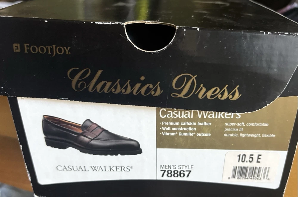 Brand new in box FOOTJOY Black Brown Size 10.5 E Style 78867 Described as feeling like "slippers" or walking on clouds. They are generally considered true to size with a comfortable, slightly wider toe box, ideal for long rounds. Features a versatile, spikeless DuraMax rubber outsole that offers surprisingly good grip for casual, dry, or dewy conditions. The leather uppers are generally durable, though some users report needing to treat them to maintain waterproofness over time. Offers an understated"lifestyle trainer" look, making them effective for both the course and casual, everyday 100% AUTHENTIC
