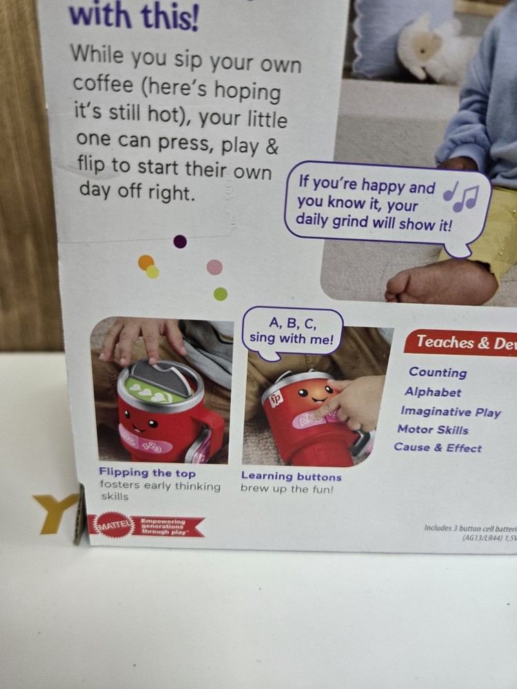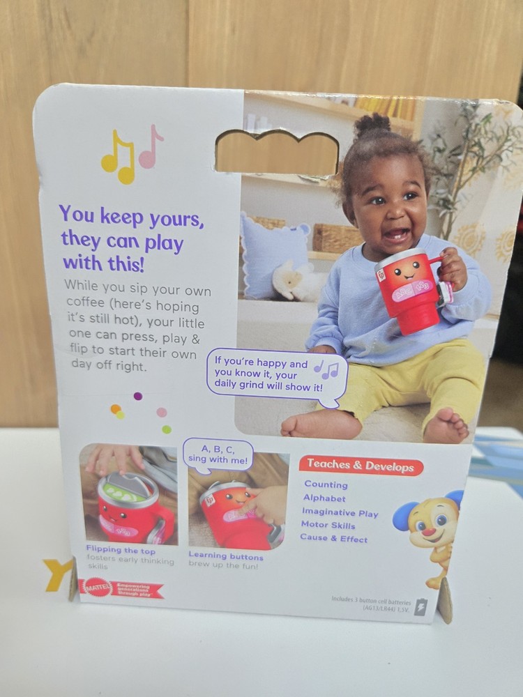 This is such a fun and clever toy! My little one loves pretending to drink coffee like mom. It arrived super fast, brand new in the box, and is even more adorable in person. A total hit!