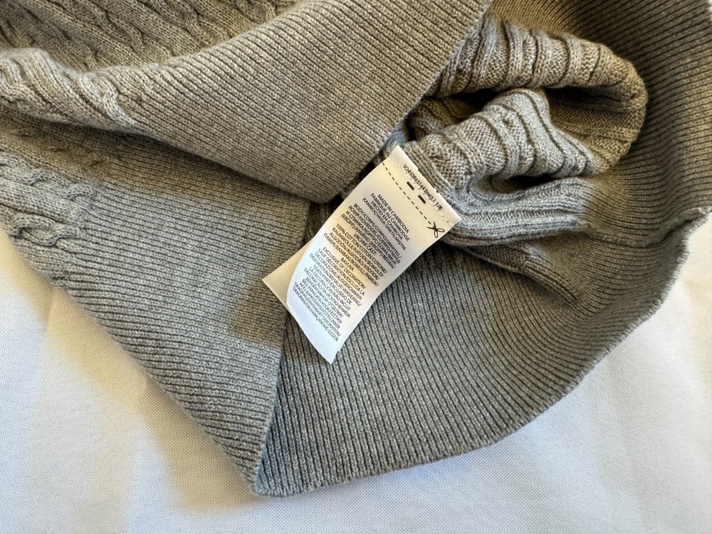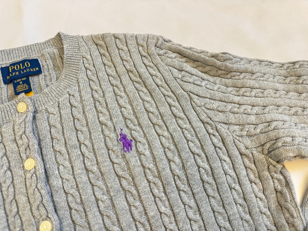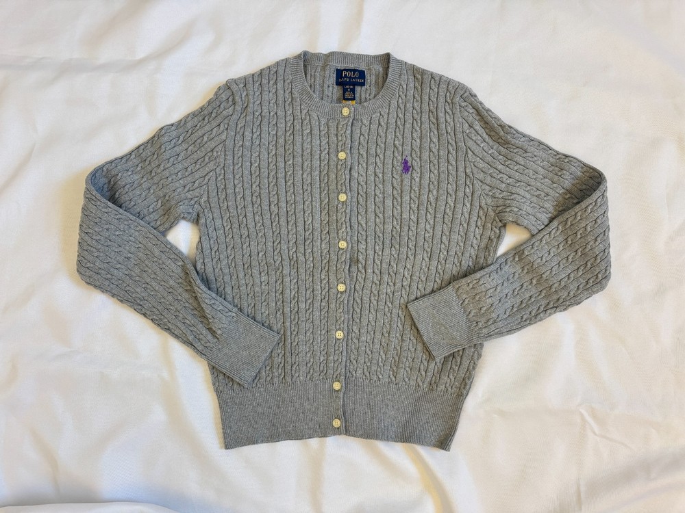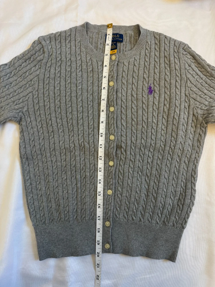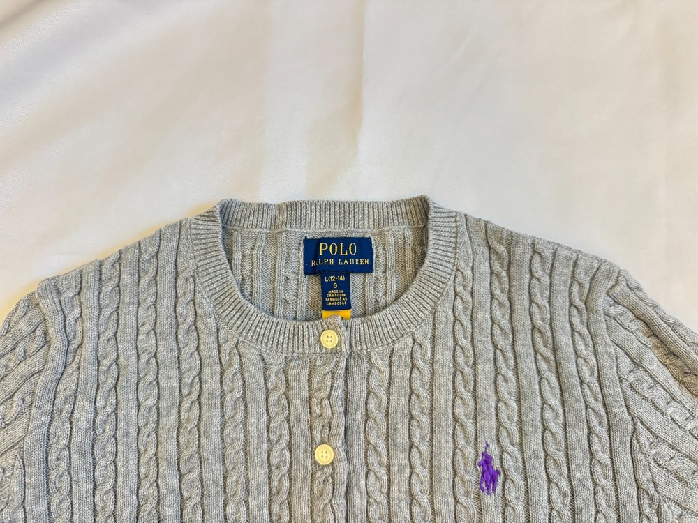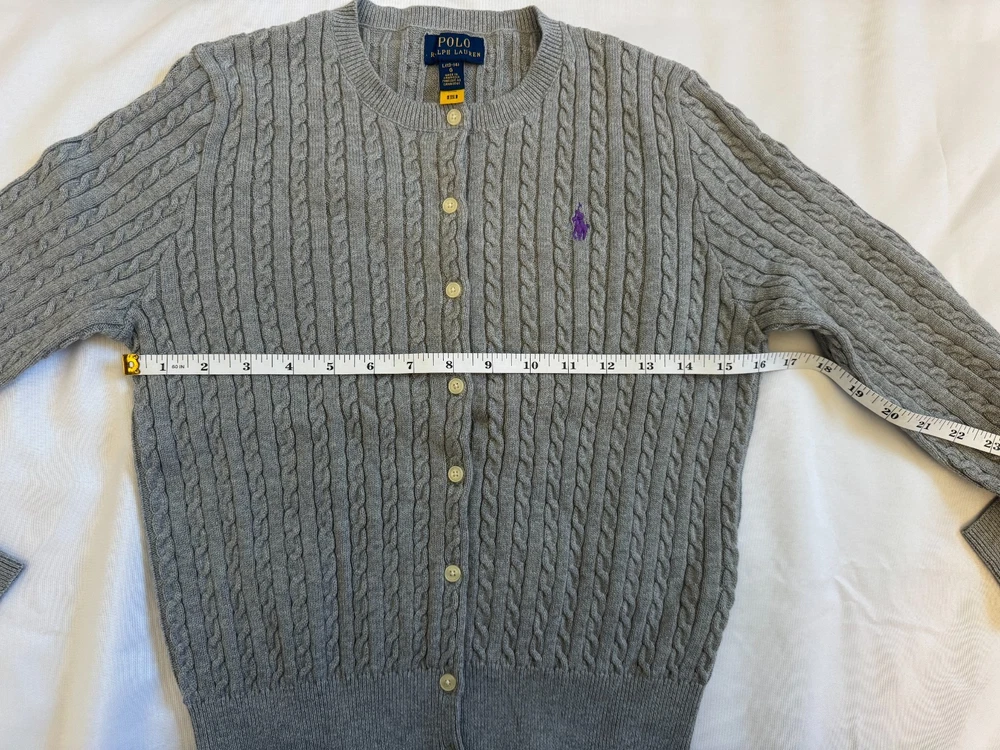The NWT Girls' Gray Size L Polo Ralph Lauren Cotton Cable Cardigan is a classic and stylish sweater perfect for casual occasions during the winter, fall, and spring seasons. Made from 100% cotton knit fabric, this long-sleeve cardigan features a solid gray color with a cable pattern and button closure. The cardigan is machine washable for easy care and has a logo accent, showcasing the signature Polo Ralph Lauren brand. Ideal for girls aged 12-14, this cardigan is a timeless wardrobe staple that can be personalized to their unique style.