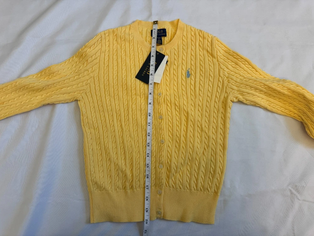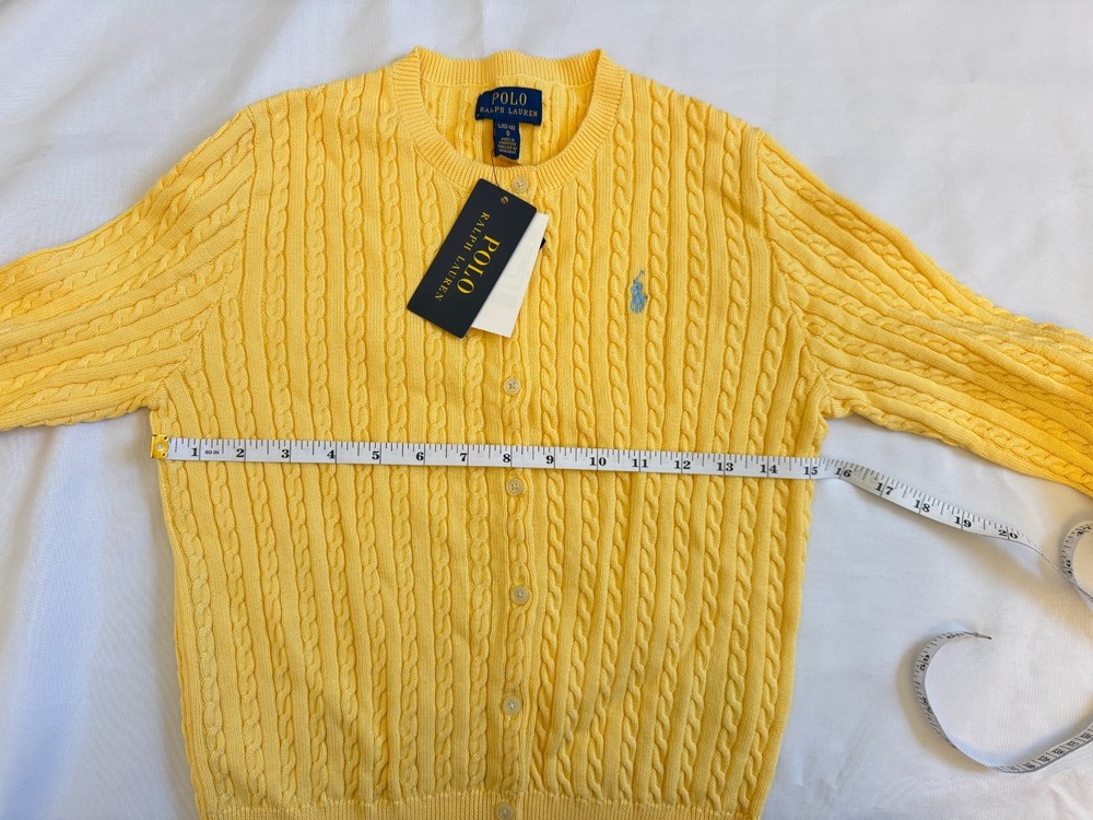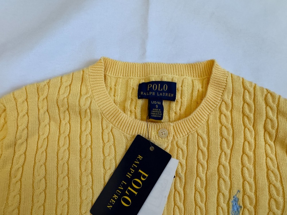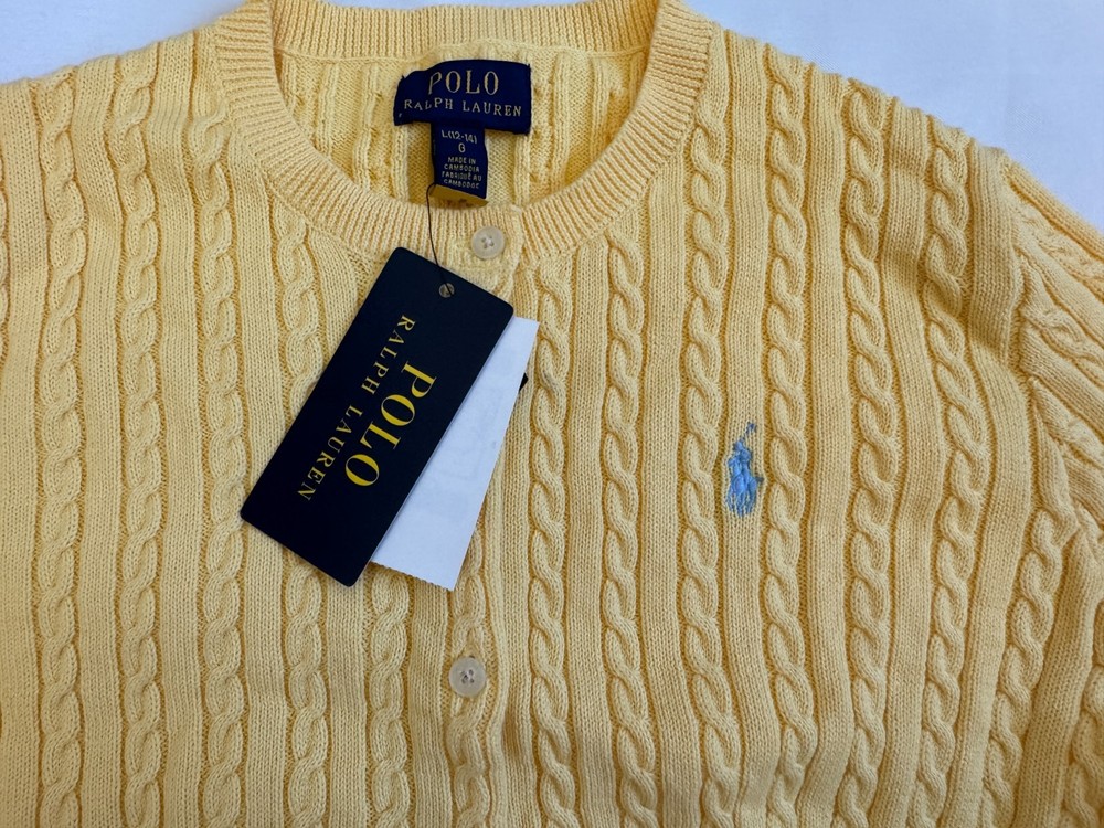 This NWT Girl's Size L (12-14) Polo Ralph Lauren Cotton Cable Cardigan in yellow is a stylish and classic sweater perfect for casual occasions. Made of 100% cotton with a knit fabric type, it features a crew neck and long sleeves with button closure. The cardigan is adorned with a logo accent, making it a versatile and timeless addition to any girl's wardrobe. Machine washable and suitable for winter, fall, and spring seasons, it offers both comfort and style for young fashionistas.