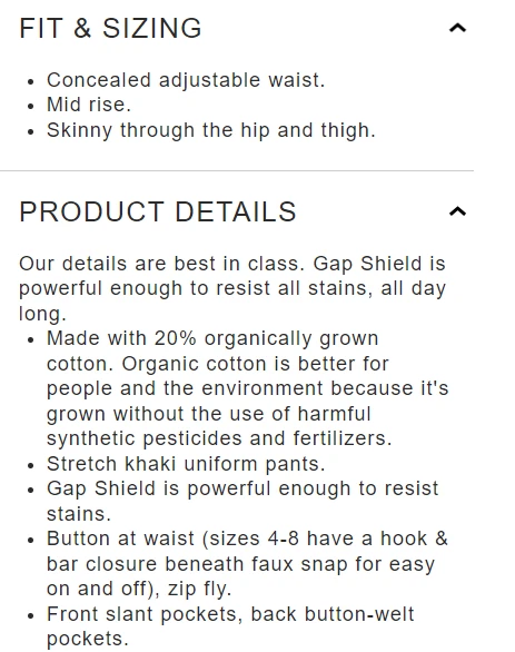 Inside adjustable waist 78% Cotton, 20% Organic Cotton, 2% Spandex. Machine wash, delicate cycle From a Gap retail store or gap.com and originally sold for $34.95