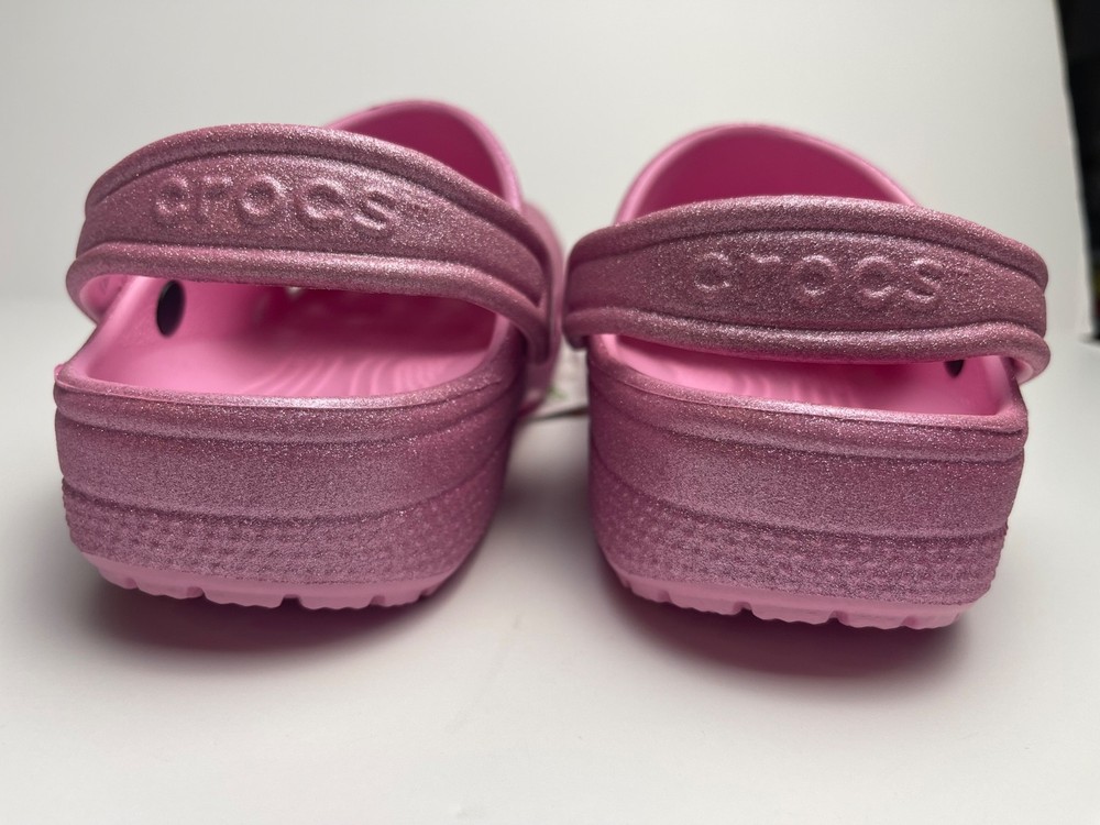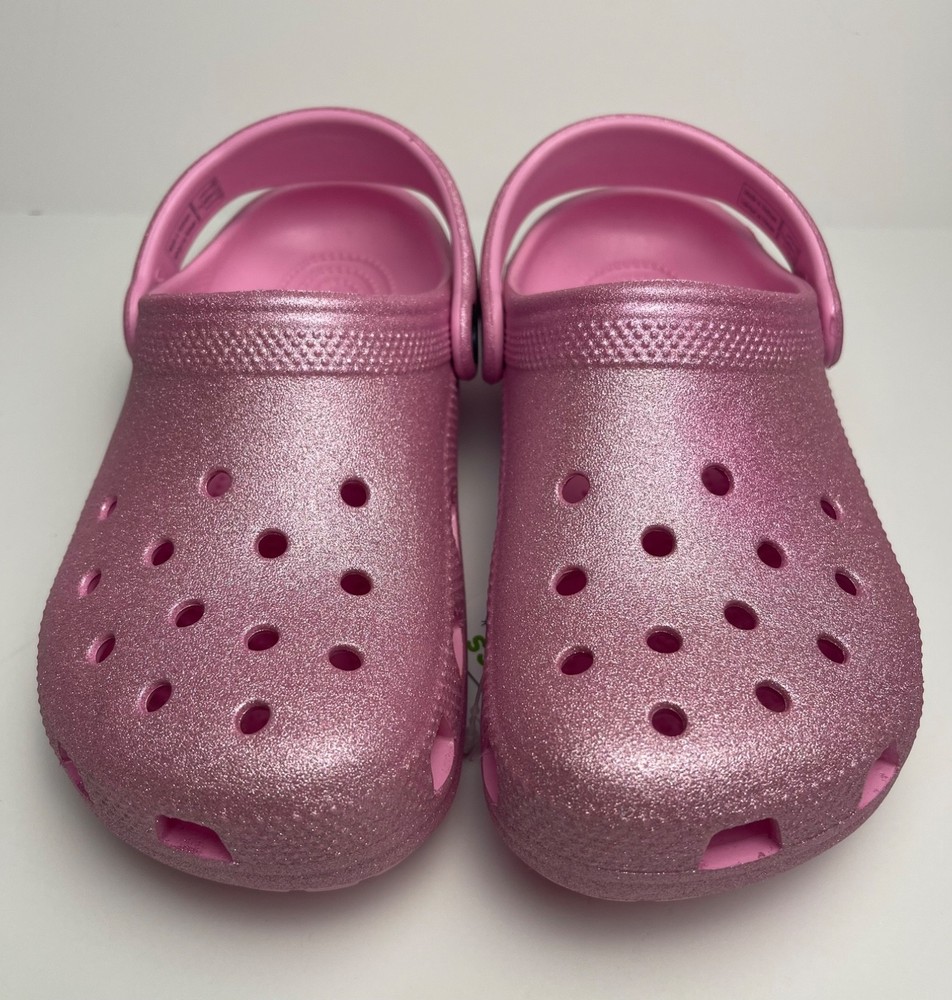 Girls Crocs Glitter sparkle light Pink clog shoe is a stylish and comfortable slip-on option for young girls. Featuring a sparkly glitter pink color with accents of the Crocs logo, these shoes are lightweight, breathable, and perfect for casual wear or travel. With a synthetic upper material, these Crocs are designed for comfort and durability. Whether for walking, at the beach, at the theme parks, on a cruise or for school, these Crocs are a versatile choice for all seasons. Multiple sizes available (C12, C13, J1, J2, J3, J4, J5) New with tags Retails new $44.99 Comes from a smoke free and pet free environment. Thank you for shopping Gracing Kids ! Please check out my many other listings to include adults and children’s clothing, shoes, Crocs for all ages, toys, Disney and Universal Park items and more.