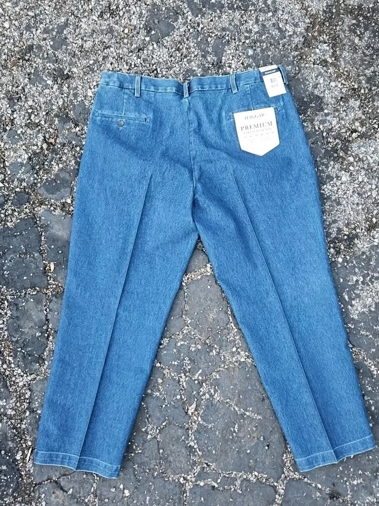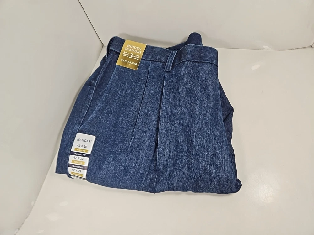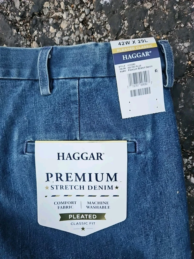 NWT HAGGAR Men’s PREMIUM STRETCH DENIM PANTS Jeans PLEATED CLASSIC FIT 42 x 29 Style: hc00280 Color: 422 med blue Premium stretch denim Product will be shipped timely and packaged with care. Offers are encouraged. Please feel free to reach out with questions. Please see pictures. Thank you. New old stock jeans. See pictures. These are NWT Haggar men's premium stretch denim pants in a classic fit size 42 x 29. The jeans are pleated with a straight leg style in a blue color. Made of denim fabric with added stretch for comfort. Sku: ghang