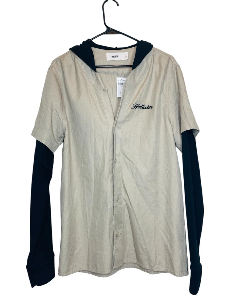 Elevate your wardrobe with the Hollister Men's Button-Up Shirt, combining comfort with a touch of casual sophistication. The shirt comes in a versatile beige hue, making it an easy match for a variety of outfits, whether you're aiming for a laid-back look or dressing up for a casual event. Its long sleeves and hooded design provide an extra layer of warmth, making it ideal for transitioning through seasons from fall to winter.Crafted from a soft blend of cotton and viscose, the shirt promises ease of movement and a breathable feel, perfect for everyday wear. The V-neckline adds a modern touch to the classic button-up closure, ensuring a flattering fit for a size small. With its solid pattern and subtle button accents, this piece is a staple for any occasion, from workwear to social gatherings.