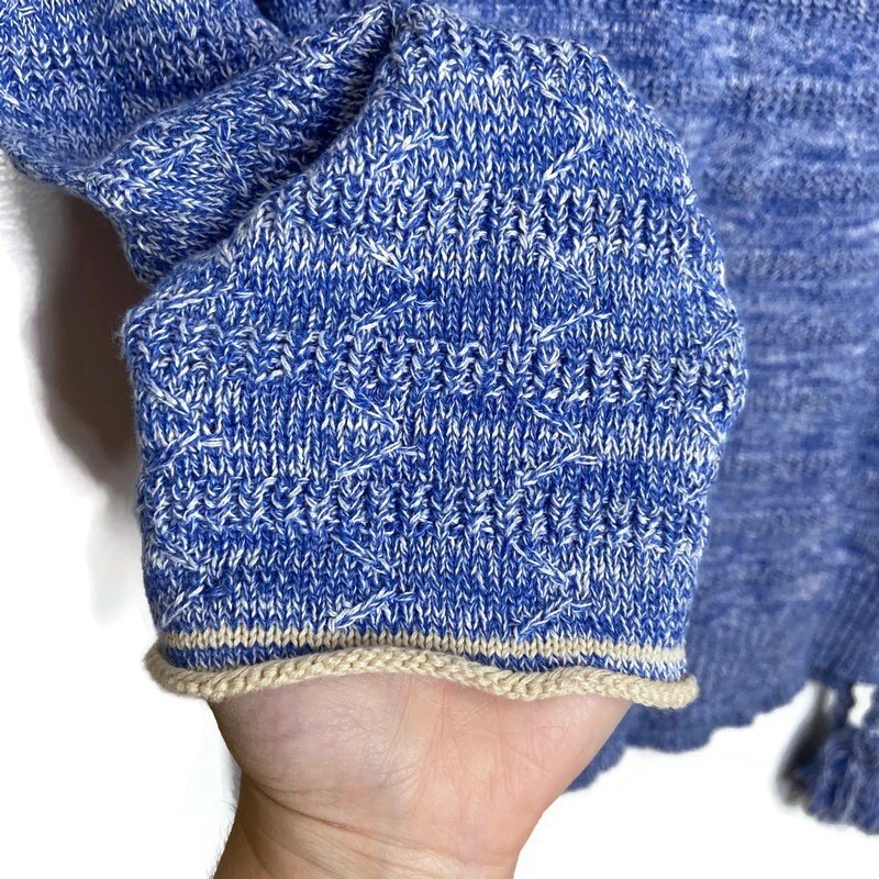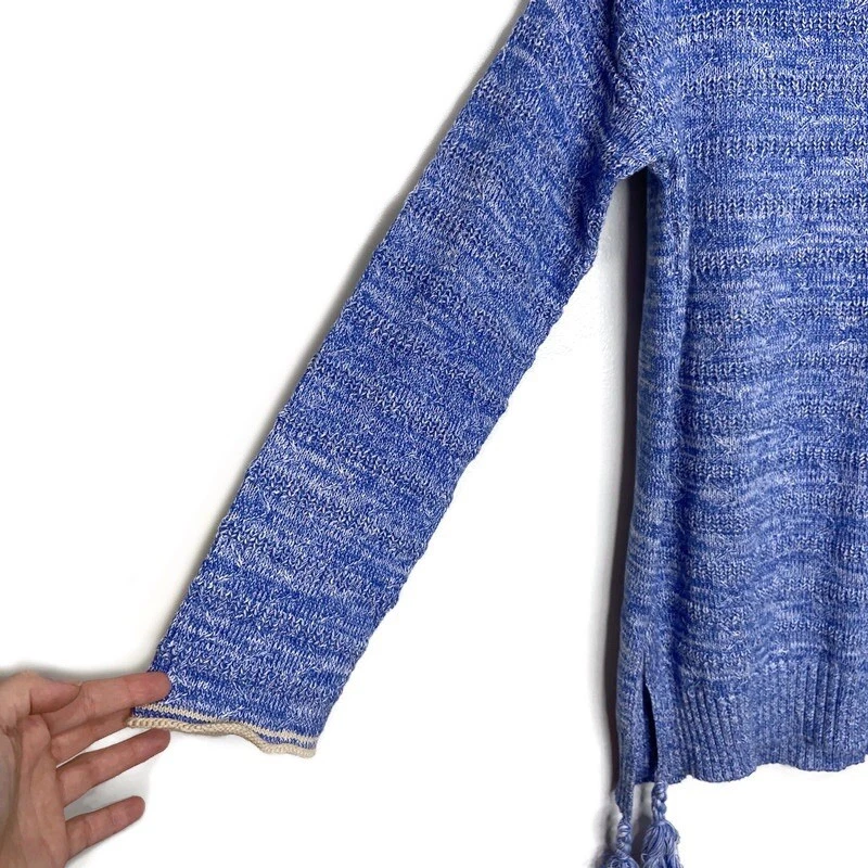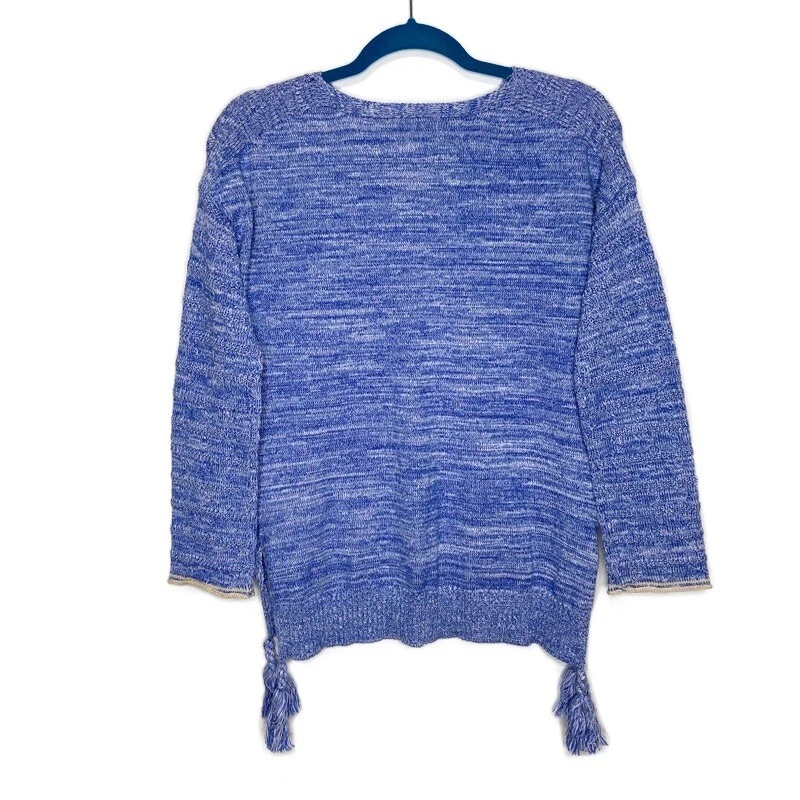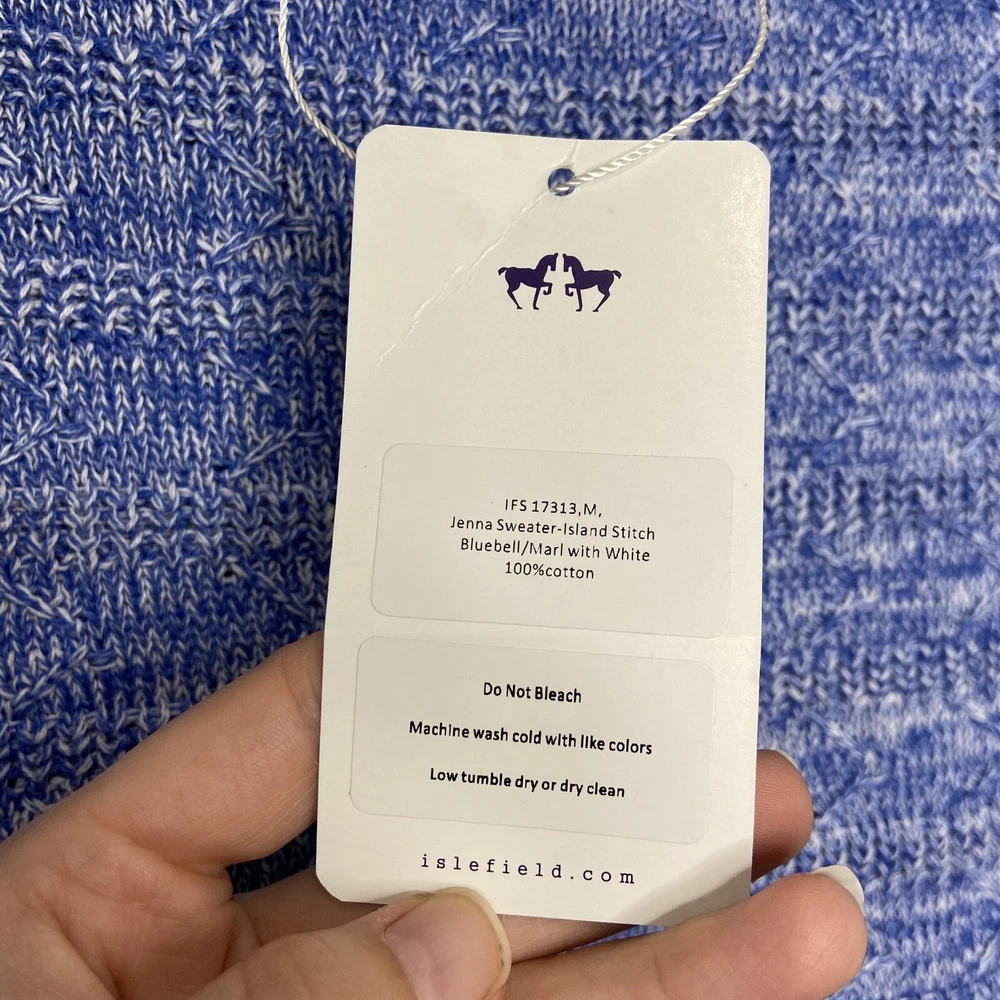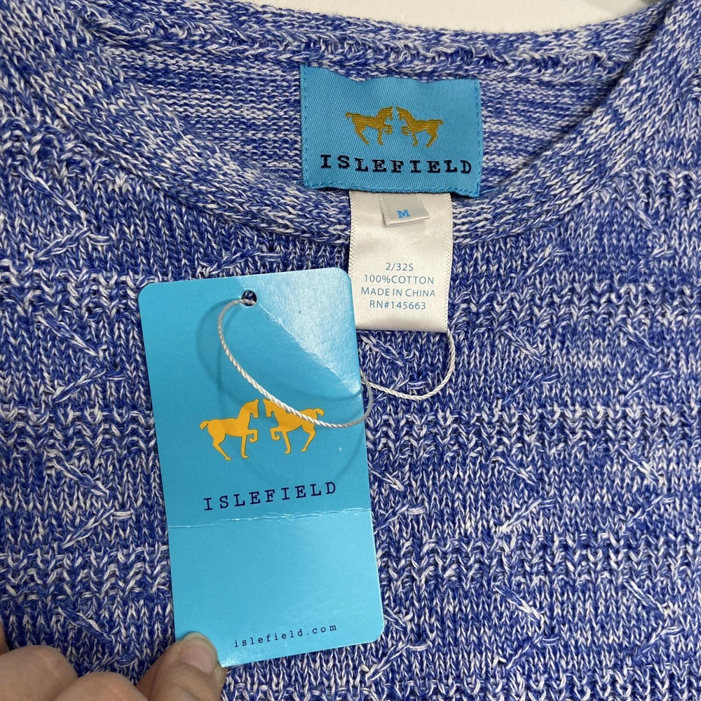 NWT Islefield Jenna Island Stitch Tassel Sweater. Size Medium and in excellent new condition. The Jenna Sweater in Island Stitch in Bluebell Marled color. Split side vents with tassels. 100% cotton knit. Pop of tan color at cuffs. Machine washable. Measurements laid flat -chest 19.5 inches -length 24.5 inches -sleeve 17 inches Bin U