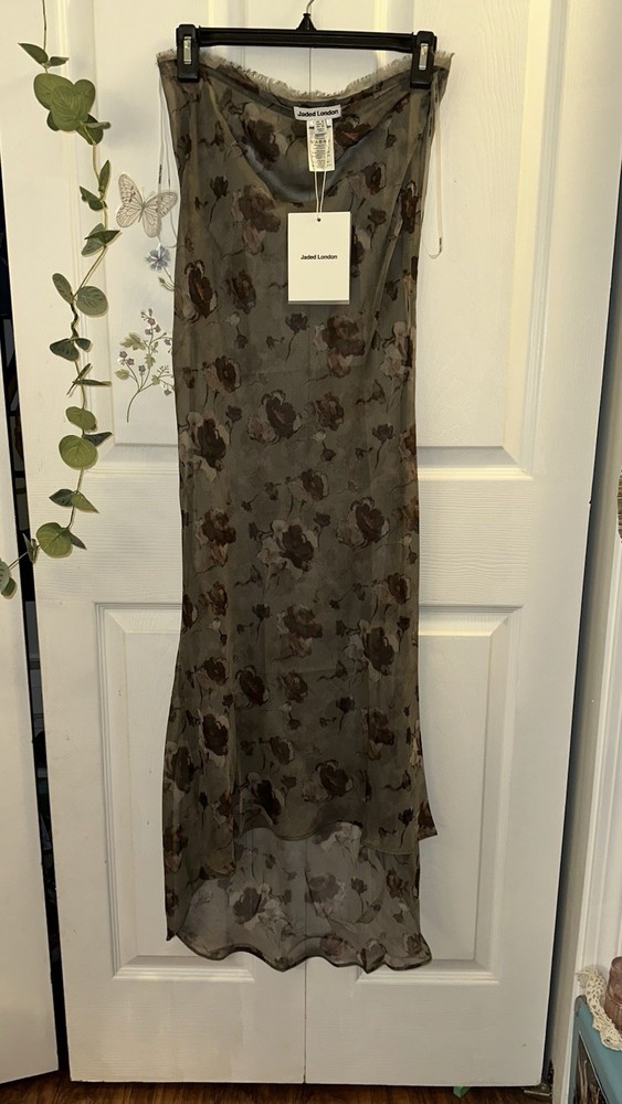 BRAND NEW with tags is this beautiful Jaded London skirt! Gorgeous frayed hem with floral design - very gothic and romantic 🥀 Originally listed for $130.00 Skirt is US 2, UK 6, EU 34 46” inseam from top to longest part of bottom small side zipper at waist Could also be worn as a maxi dress for a date or night out! From a smoke-free household. PM me with any questions~!