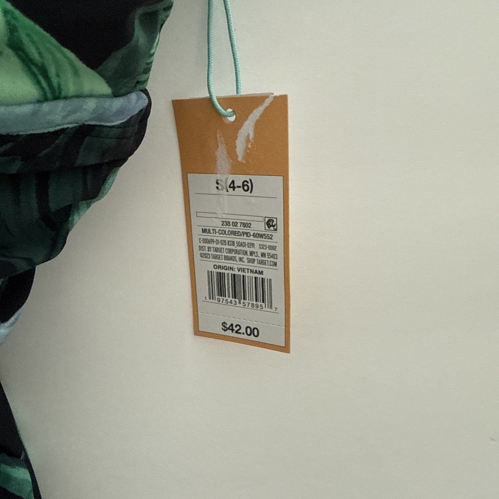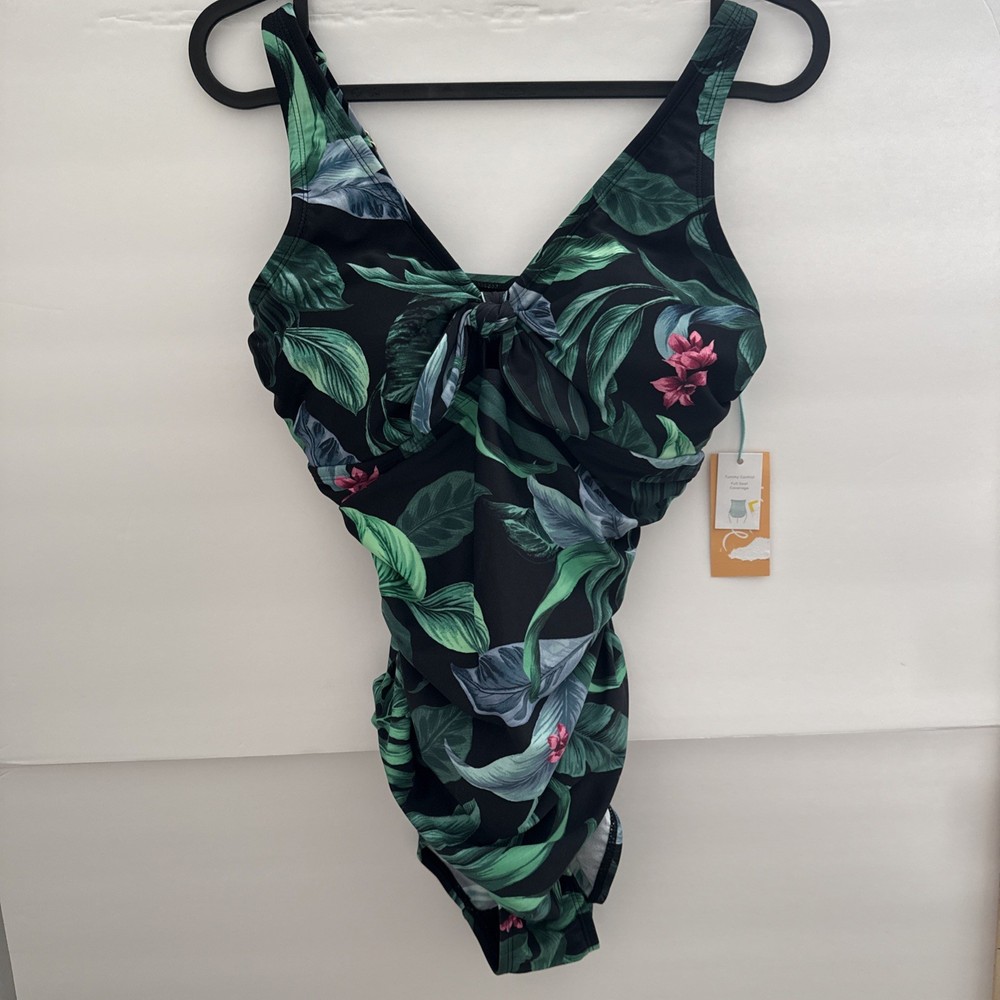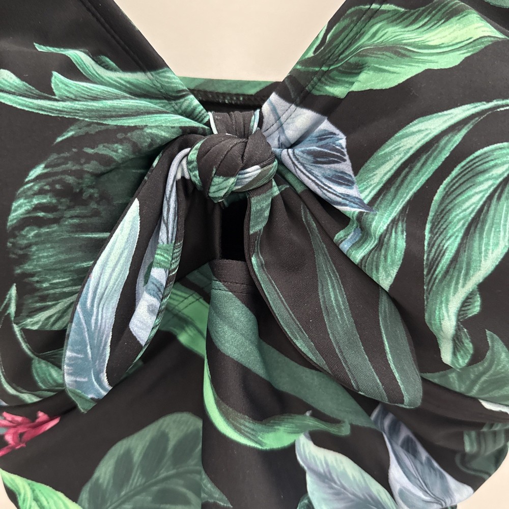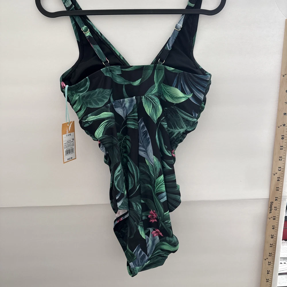 Welcome sunny days in style with this Full-Coverage Tummy Control Tie-Front One-Piece Swimsuit from Kona Sol™. Made of soft, stretchy fabric with comfy lining, this multicolored printed swimsuit is designed with a chic V-neckline, a keyhole cutout and a bow-tie accent on the front, along with camouflaging ruching design across the stomach that helps provide a slimming, flattering look. Adjustable shoulder straps complete the design with a customizable fit and allow for confident wear in and out of the water. Kona Sol™: Made for your day in the sun. The NWT Kona Sol Full Coverage Tummy Control 1 Piece Swimsuit in Women's Size Small (4-6) is a stylish and comfortable swimwear option perfect for the beach or pool. Made of a blend of nylon and spandex, this black swimsuit features a floral pattern, wide straps, and tummy control features for added confidence. With a beach and tropical theme, this one-piece is machine washable for easy care and is a great choice for women looking for a flattering and durable swimsuit.