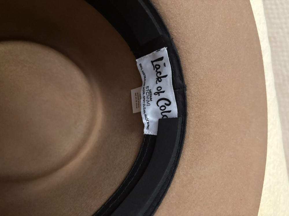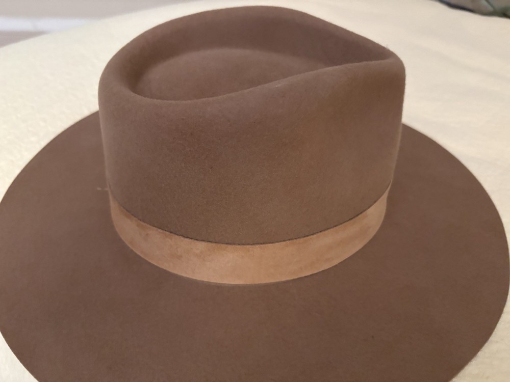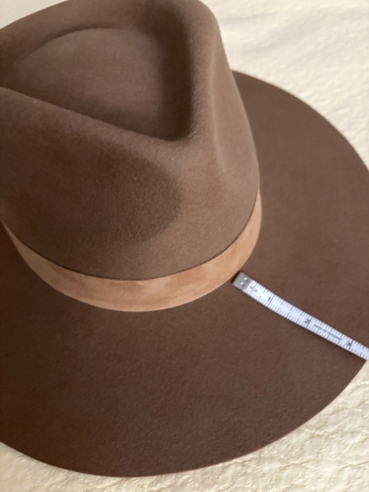 Crafted of Australian wool and sporting a 3 1/2 inch stiff brim, this chic and classic Fedora retailed for $149. Never worn, it is size M, or size 7 1/8. The band is suede, the interior is 57 centimeters (about 22 inches) in diameter. Shipping only to the lower 48 US states. No PO Boxes or APO please.