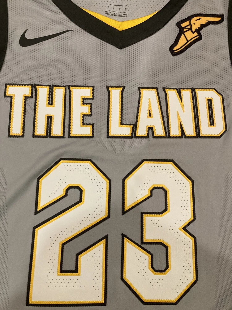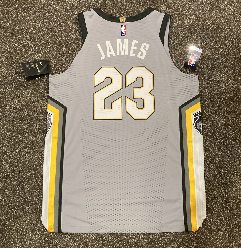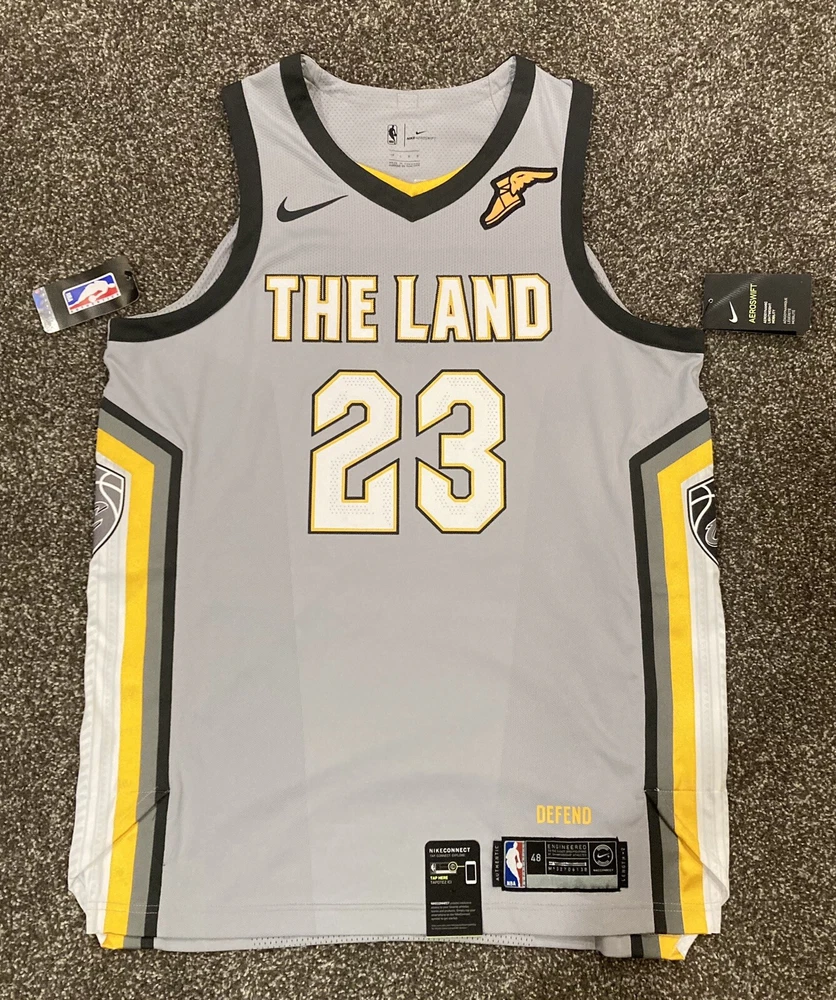 New with tags LeBron James 2017-18 Authentic Nike Aeroswift “The Land” City Jersey Size 48 Large. LeBron’s last year with the Cleveland Cavaliers and the first year Nike produced City jerseys. Goodyear sponsor patch.