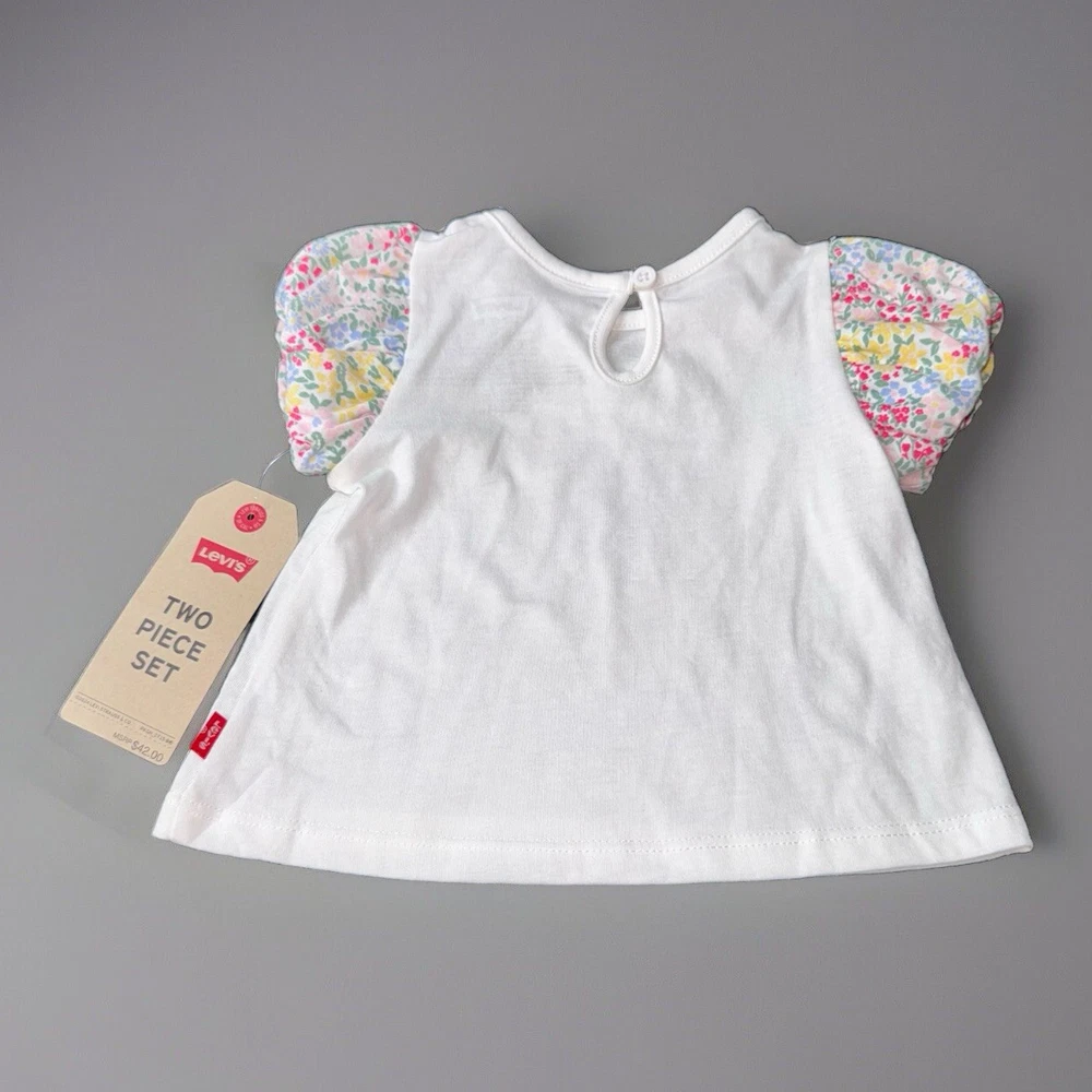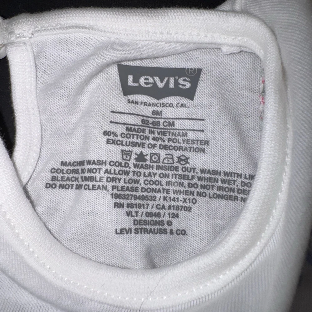NWT Levi’s Baby Size 6 Months White T-shirt Colorful Logo Bright Puffy Sleeves Ships next business day Smoke free home New with tags, no issues Originally came as a 2 piece but this is just the t-shirt This Levi's Baby T-shirt is size 6 months with a round neck and short, puffy sleeves. The shirt features a colorful logo on the front, adding a playful touch to the classic white design. Made from a blend of polyester and cotton, the fabric is lightweight and breathable, ensuring comfort for the little one. This easy-care T-shirt is ideal for everyday wear and is suitable for both baby boys and girls. Perfect for adding a pop of color to a baby's wardrobe.