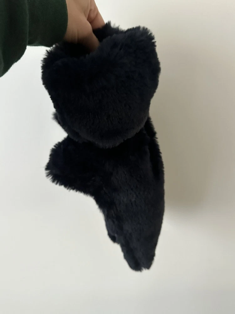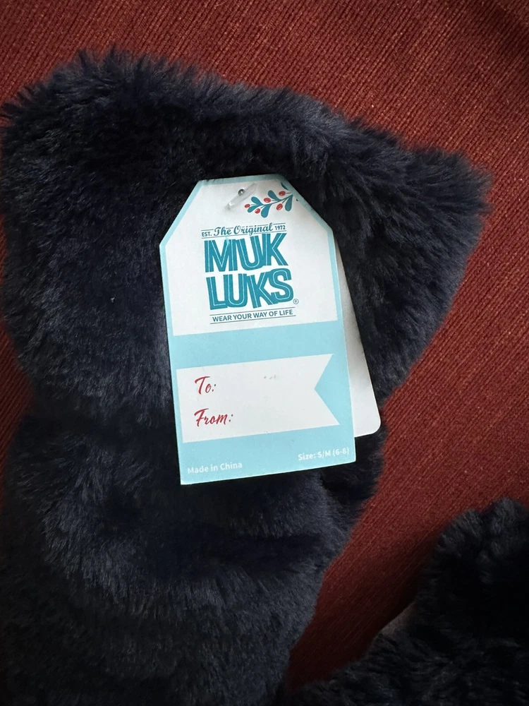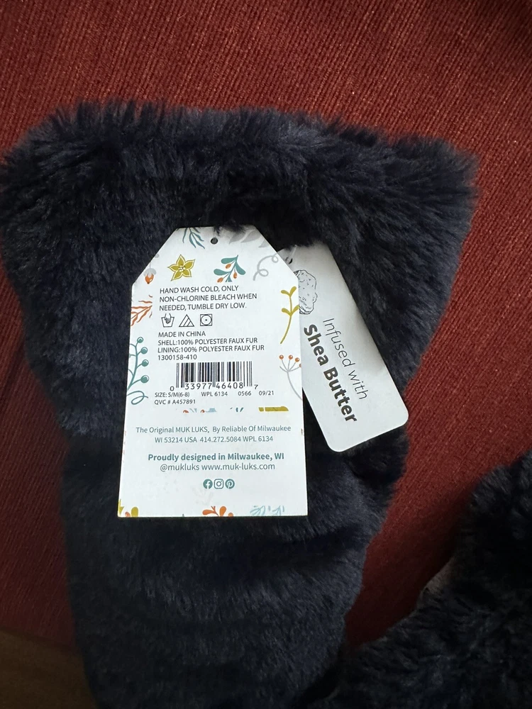 NWT MUK LUKS Infused with Shea Butter Cozy Booties Black Faux Fur Hand Wash Cold, Only Non-Chlorine Bleach when needed, tumble dry low Made in China Shell: 100% Polyester Faux Fur Lining: 100% Polyester Faux Fur Nonskid grips on the bottom Two/from gift tag for easy gift giving Size S/M 6-8 QVC: A457891