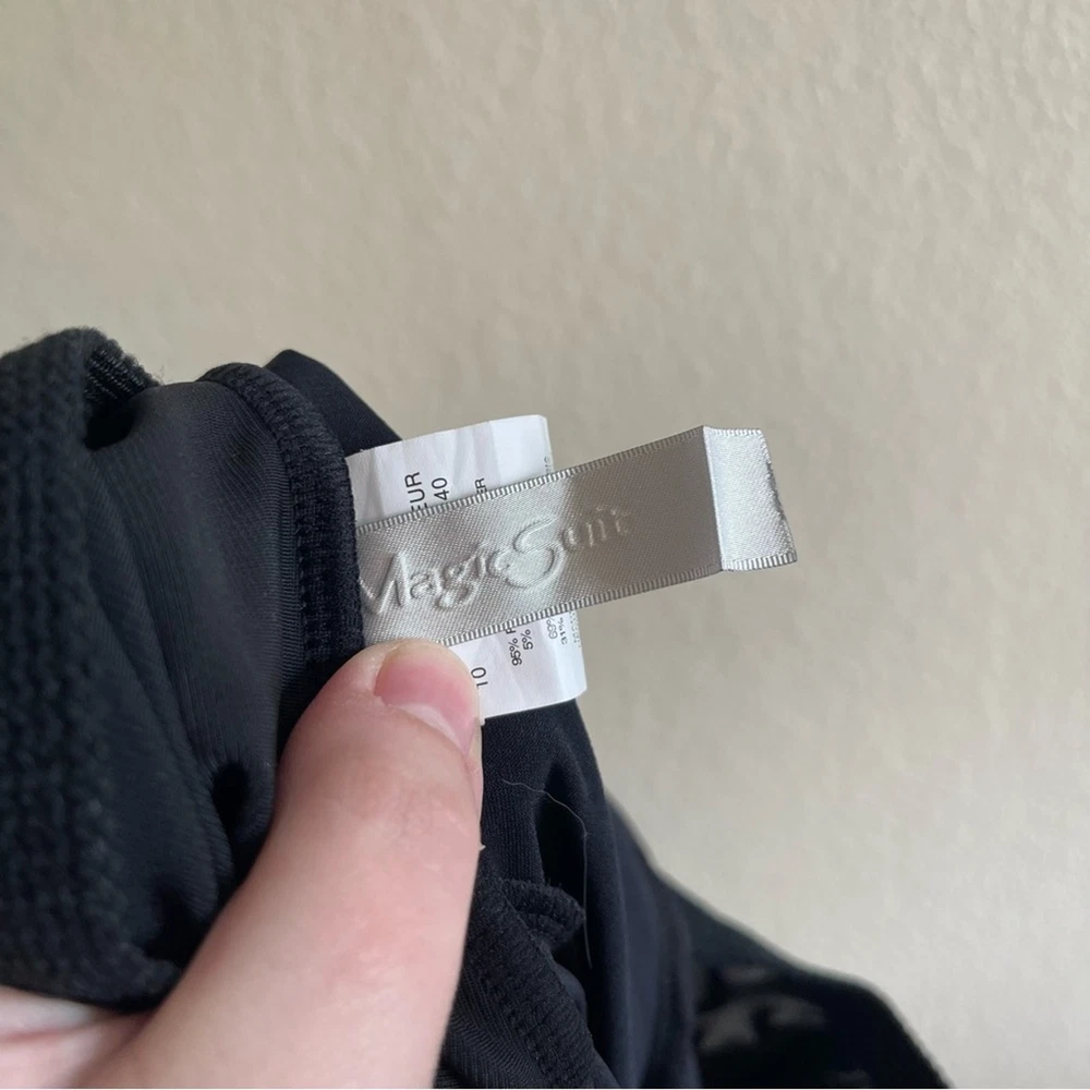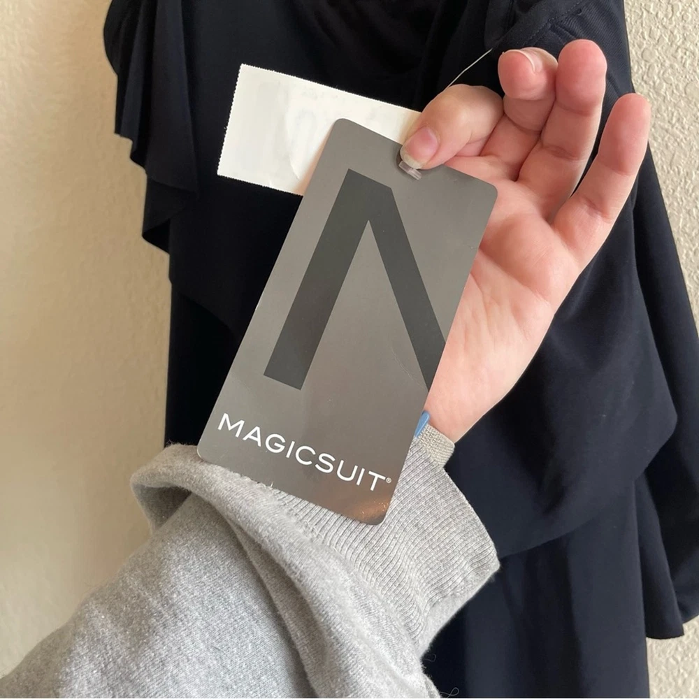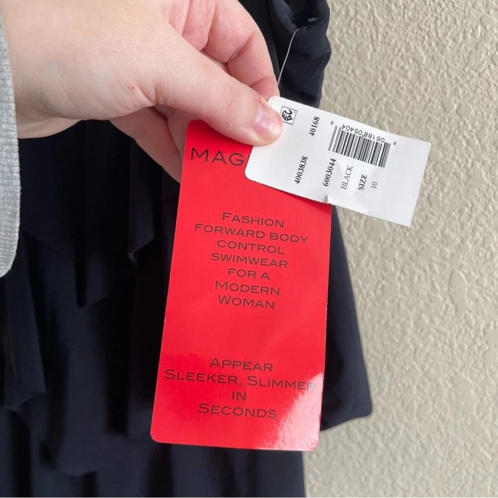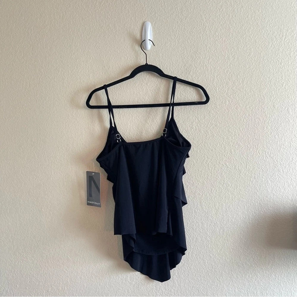 NWT Magicsuit Rita Tankini Top V Neck Tiered Black Swimwear Womens Size 10 This item is in new with tags condition, cute, trendy. • Wireless Bra Support With Soft Cup Padding • V-Neckline • Adjustable Straps • Full Straight Back • Back Control Lining Slims And Shapes The Body Women's Size 10 Approx Measurements: Pit to Pit: 16 in (stretches to 19 in) Length: 21 in
