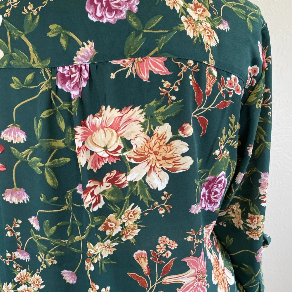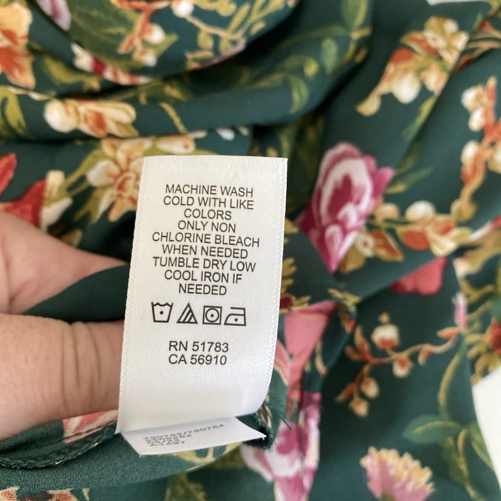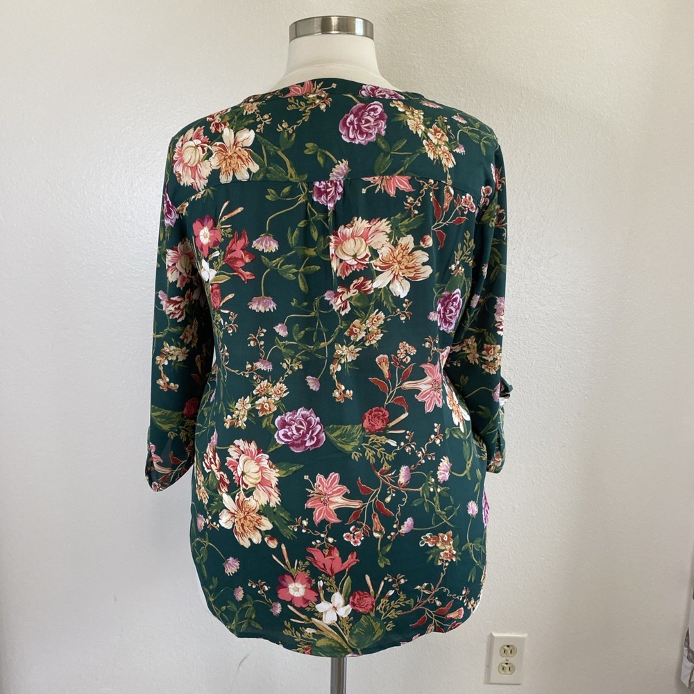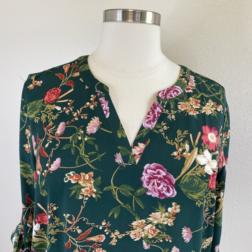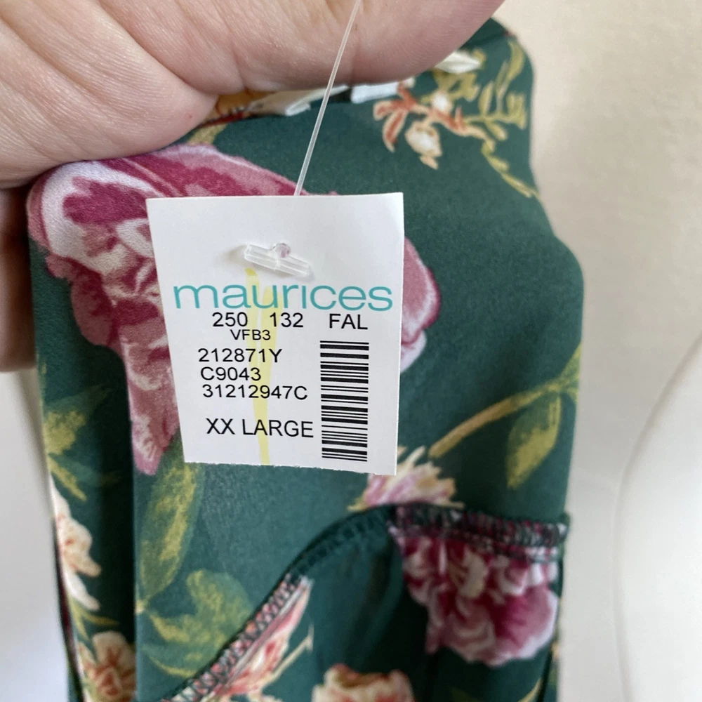 New With Tags! Very pretty hunter green blouse with floral pattern. Lightweight with roll tab sleeves. Women’s XXL. Displayed on a size 18/20 mannequin