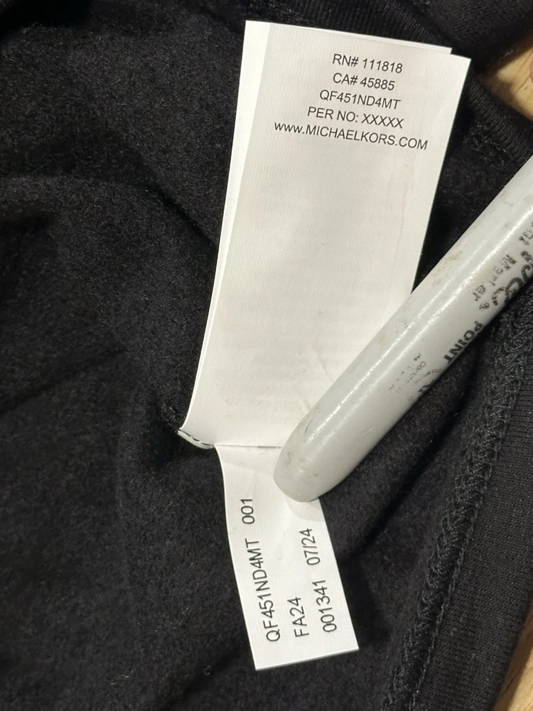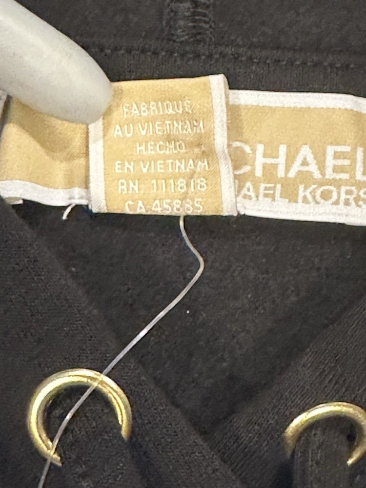 (1) Embrace the epitome of luxury and comfort with this Michael Kors women's hoodie, size large, a perfect blend of style and practicality for your casual outings. Crafted from a soft jersey fabric that combines cotton, polyester, and a hint of elastane, it promises a comfortable fit and easy movement. The hoodie features a round neckline, long sleeves, and a convenient pullover closure, making it an ideal choice for the transitioning seasons of fall, spring, and winter. The classic black hoodie is accentuated with a bold Michael Kors gold studs that exudes designer appeal, complements by subtle rhinestone/studded embellishments that add a touch of glamour to the casual ensemble. It's machine washable for easy care, ensuring that this garment remains a staple in your wardrobe for seasons to come. 07/24 brand new $98 value