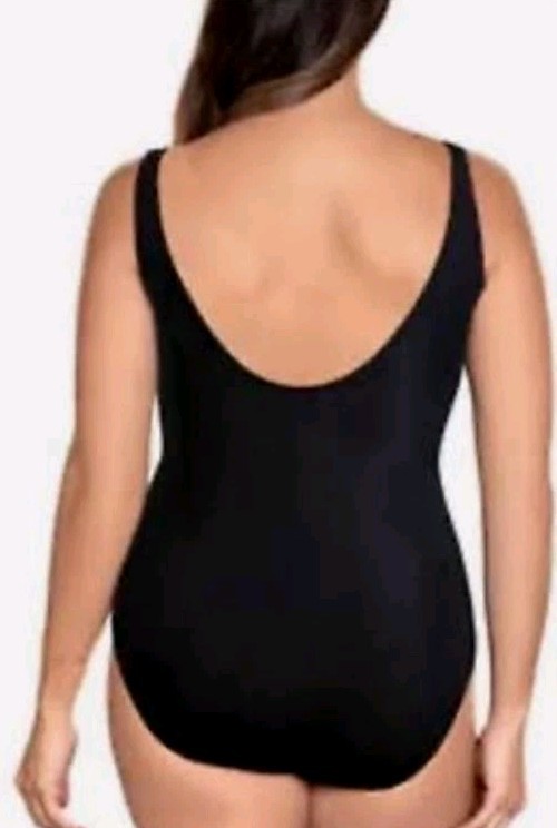 The *NWT* Miradonna by Miraclesuit Ladies One-Piece Swimsuit in Black size 16 is a stylish and comfortable swimwear option for women. This one-piece swimsuit features a tank top style with a wide strap for added support. Made from a blend of nylon and spandex, this swimsuit offers a padded and comfortable fit, perfect for a day at the beach or by the pool. The geometric and solid black pattern adds a modern touch to this classic one-piece, making it a versatile choice for any water activities.