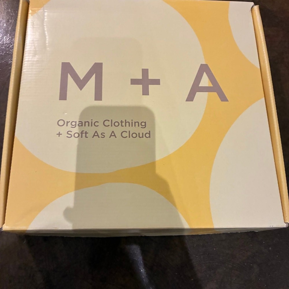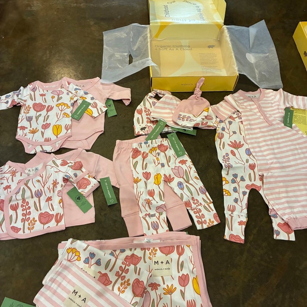 New in box Monica & Andy newborn gift set - contains layette, gown, 2 bodysuits, 2 tops, 2 leggings, 3 hats, 2 burp cloths, and a baby blanket. All clothes are size newborn (NB). Perfect gift for a baby shower or to prepare for your little one! The box in the photos has been opened to photograph, but you will receive a new box (only opened to check pattern).