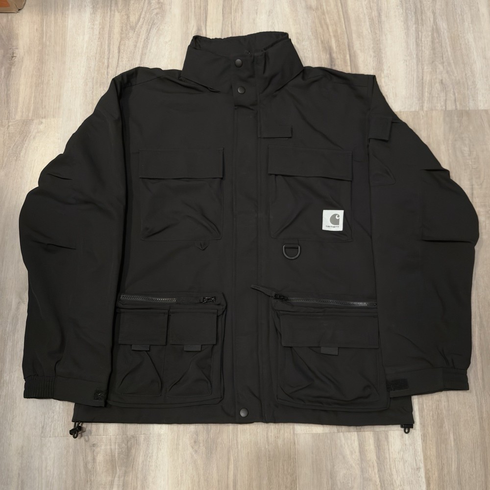 The NWT Carhartt WIP Elmwood Jacket in Black is a versatile and functional piece of outerwear designed for men. Made with durable nylon outer shell material and lined with cozy polyester, this mid-length jacket features a full zip design and is perfect for workwear or outdoor activities in the winter and fall seasons. With a regular fit and canvas fabric type, this overcoat from the Carhartt J97 line is both stylish and practical for everyday use. Whether you're walking or working, this jacket offers both protection and comfort with its solid black color and logo accents.