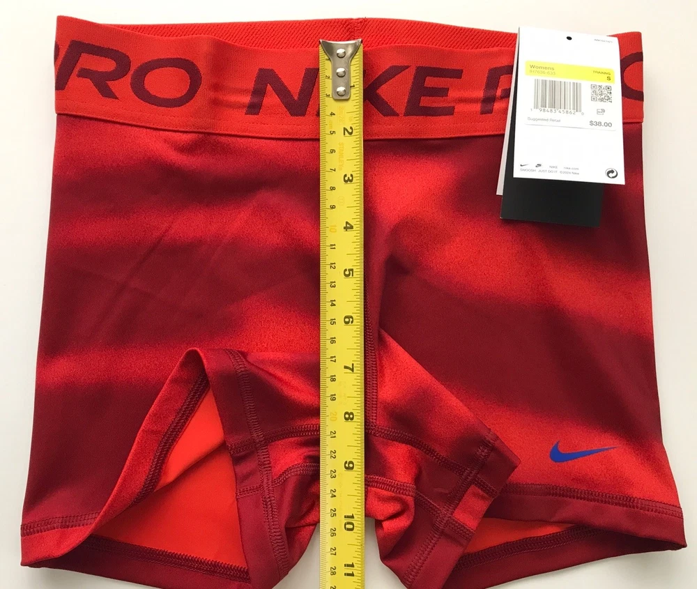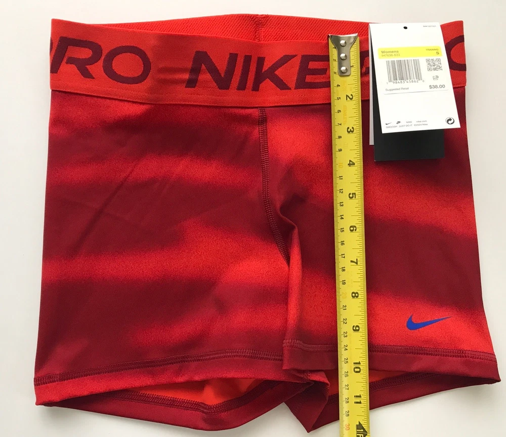 Nike Women's Pro 3” Shorts SUPPORTIVE AND STRETCHY. The Nike Pro Shorts are made with stretchy, sleek and supportive fabric that wicks sweat to help you stay dry and comfortable during your workout. Benefits Nike Dri-FIT technology helps you stay dry, comfortable and focused. A wide, mid-rise elastic waistband feels supportive around your core. Product Details New with tags. Color: Red Size: Women's S Medium support Tight fit for a body-hugging feel 83% polyester/17% spandex Machine wash Style: IH7636-633 Made in Vietnam