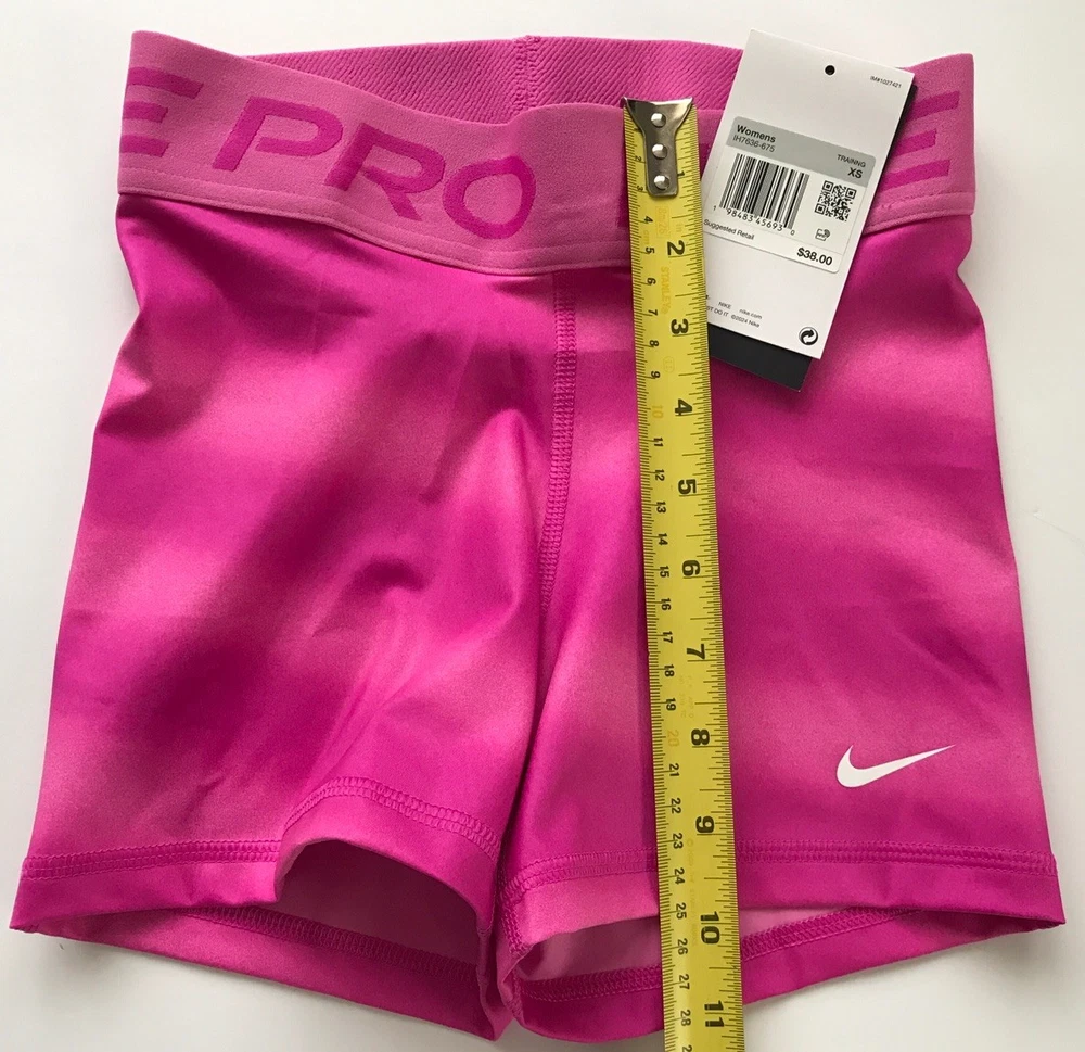 Nike Women's Pro 3” Shorts SUPPORTIVE AND STRETCHY. The Nike Pro Shorts are made with stretchy, sleek and supportive fabric that wicks sweat to help you stay dry and comfortable during your workout. Benefits Nike Dri-FIT technology helps you stay dry, comfortable and focused. A wide, mid-rise elastic waistband feels supportive around your core. Product Details New with tags. Color: Pink (The real color is in between those in stock photos and other photos taken on actual shorts. Darker pink than those in the first three pictures, and lighter than those in other pictures) Size: Women's XS Medium support Tight fit for a body-hugging feel 83% polyester/17% spandex Machine wash Style: IH7636-675 Made in Vietnam