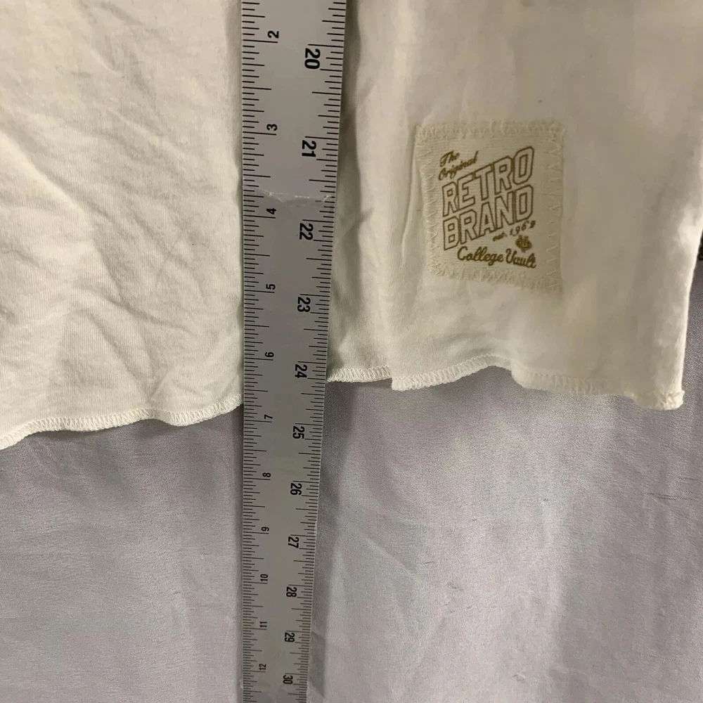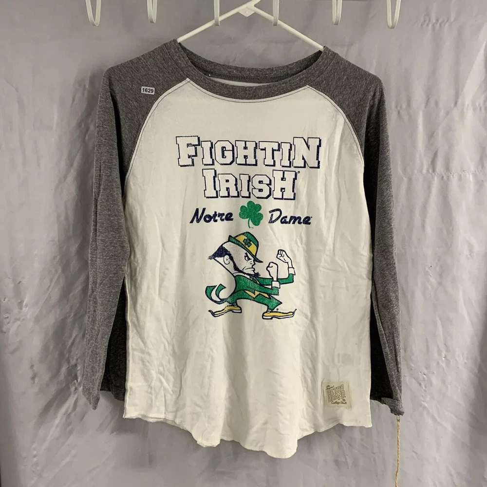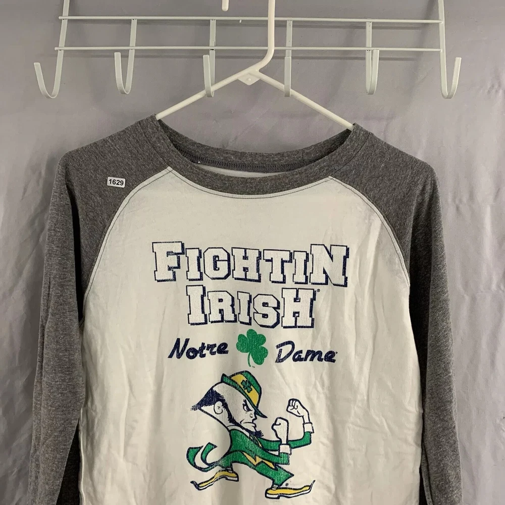 Show off your love for the Fighting Irish with this Norte Dame shirt from M & M. This retro-style t-shirt features a solid white color with blue accents, perfect for any fan of the team. The long sleeve crew neck shirt is made from a comfortable cotton and cotton blend fabric, with a knit texture and a lightweight feel. The shirt is designed with a variety of features, including a full zip hooded design, stretch and quick-dry capabilities, and a double-sided print. It's a limited edition item from the 1990s, perfect for collectors and fans alike. Whether you're wearing it to a game or just showing off your love for Norte Dame, this shirt is sure to be a hit.