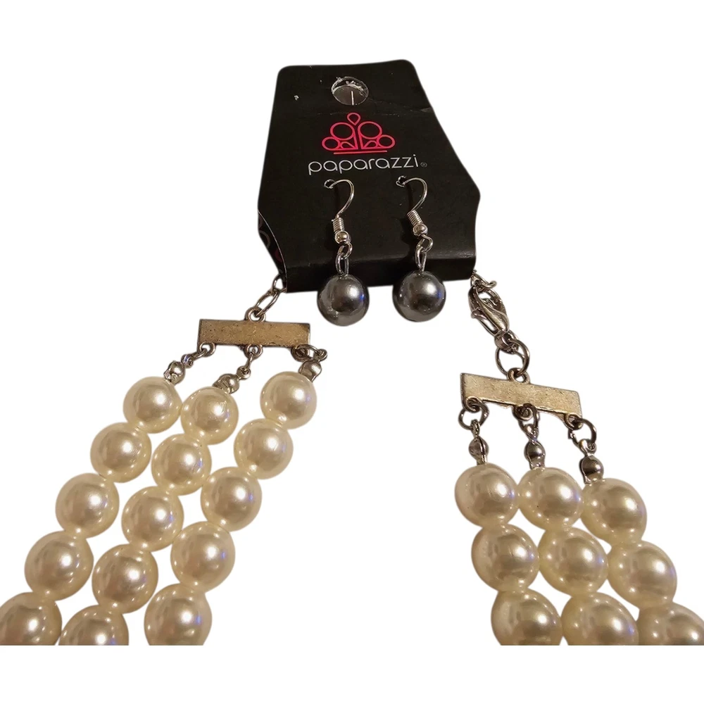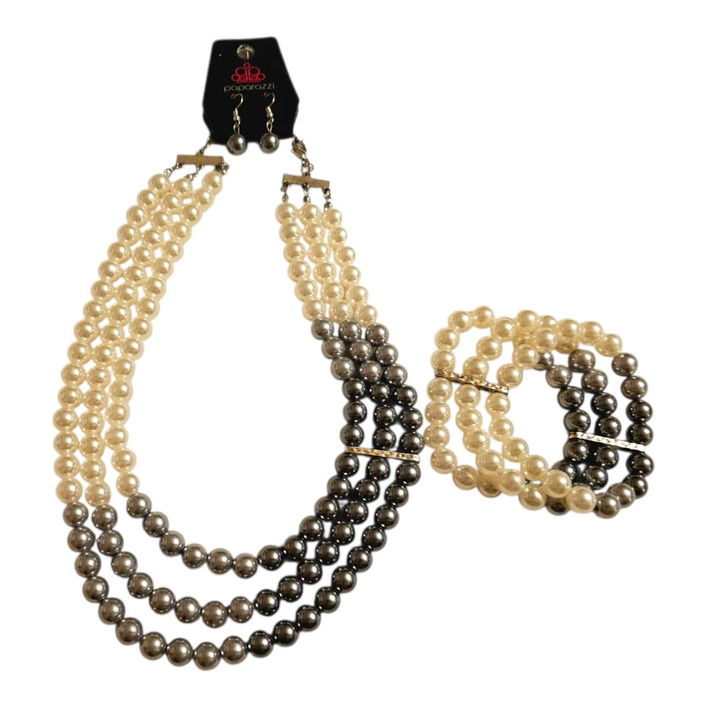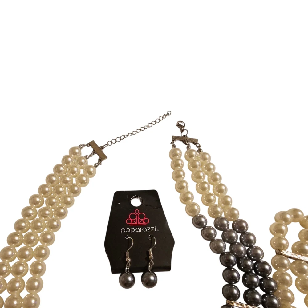 ✨️Paparazzi Faux Pearl Jewelry Set ✨️Includes: 3 strand adjustable necklace, 3 strand stretch bracelet, and earrings ✨️Times Square Starlet Necklace and Earrings Set: Joined together by a hammered silver fitting, strands of white, silver, and dark gray pearls cascade below the collar, creating an elegant ombre effect. Features an adjustable clasp closure. ✨️Central Park Celebrity Bracelet: Joined together by a hammered silver fitting, white, silver, and dark gray pearls are threaded along with stretchy bands, creating an elegant ombre effect around the wrist. ✨️Measurements shown in photo is from end to end with necklace open ✨️Beautiful white, gray, and black set ✨️New, never Worn but bracelet is missing tag ✨️Colors may appear different because of camera and/or screen quality ❤️From a smoke-free, pet-loving home but pets are kept away from my items. Please see all photos as this is the exact item(s) you will receive in the exact condition shown❤️