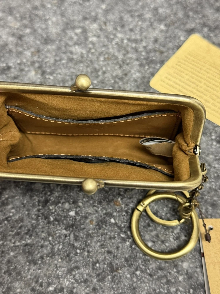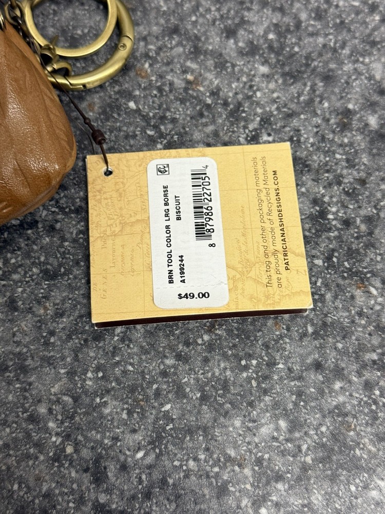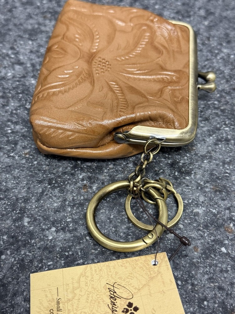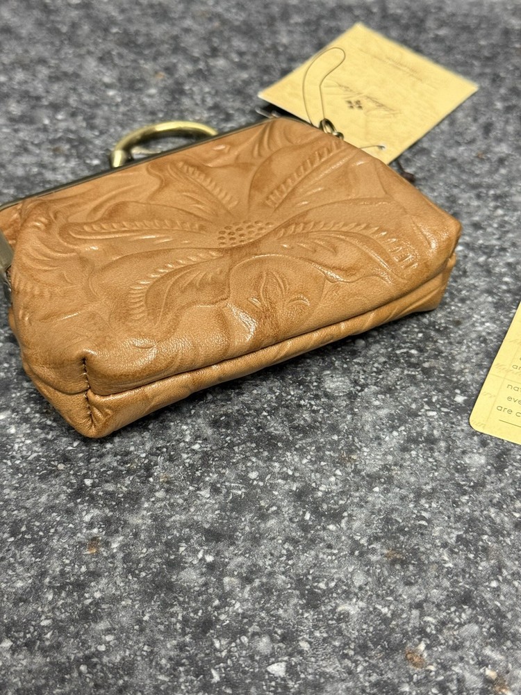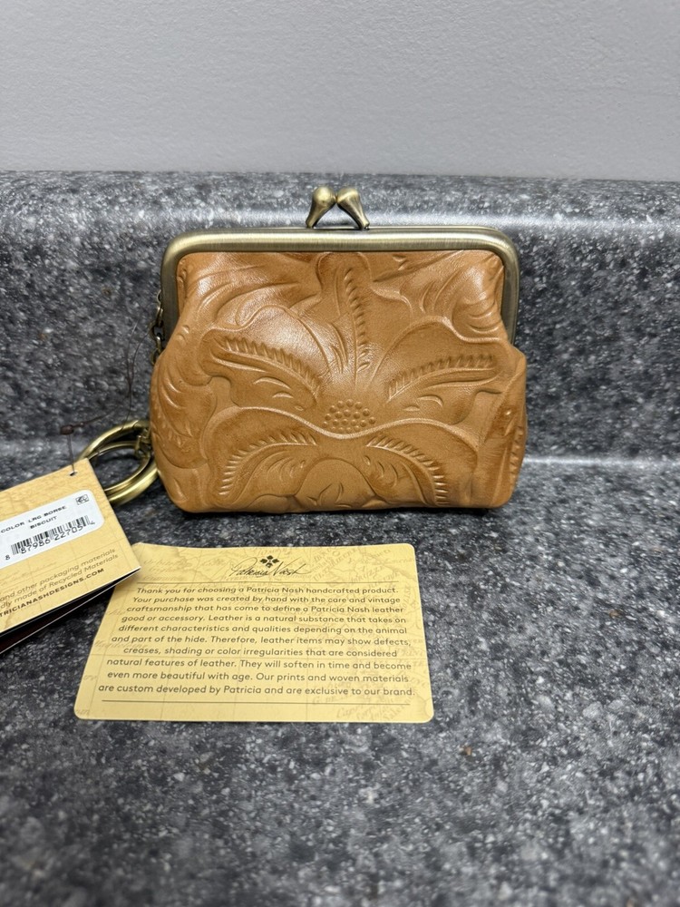 NWT Patricia Nash Borse Tooled Italian Leather Coin Purse Keychain Biscuit Brown This patricia nash kiss lock keychain coin pouch is brand new with the tags! It features two keychain rings, a kiss lock closure on the top, and two card slot pockets inside. Will ship the next day via usps! Please let me know if you have any questions or offers!