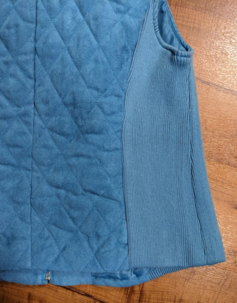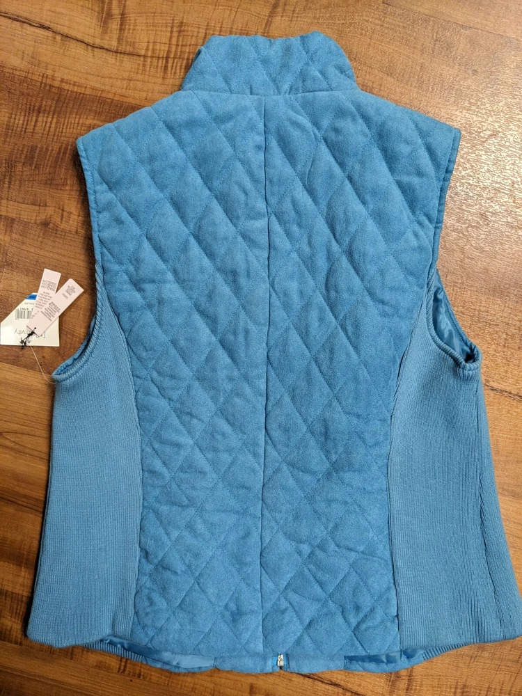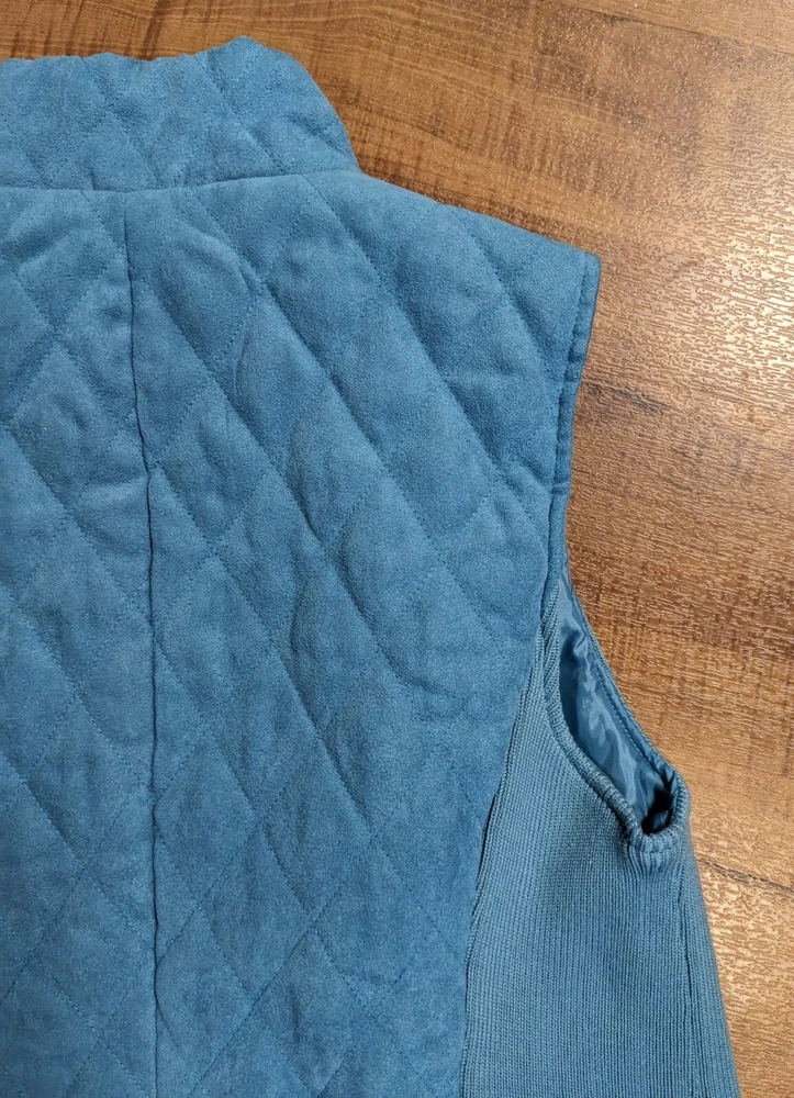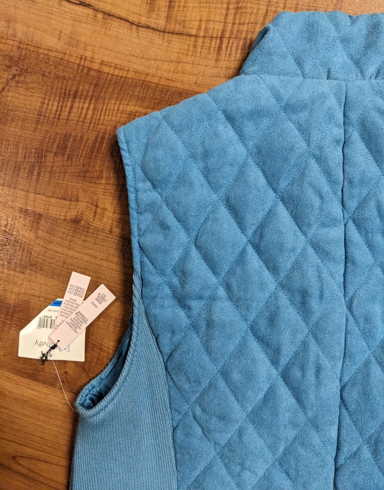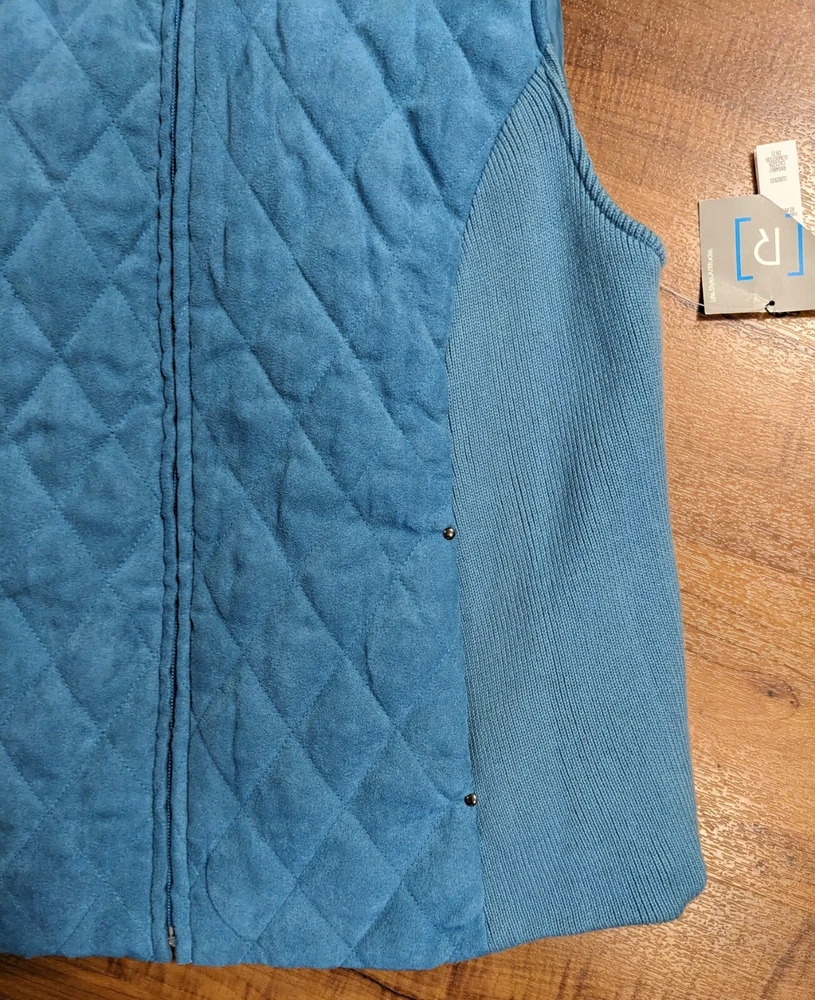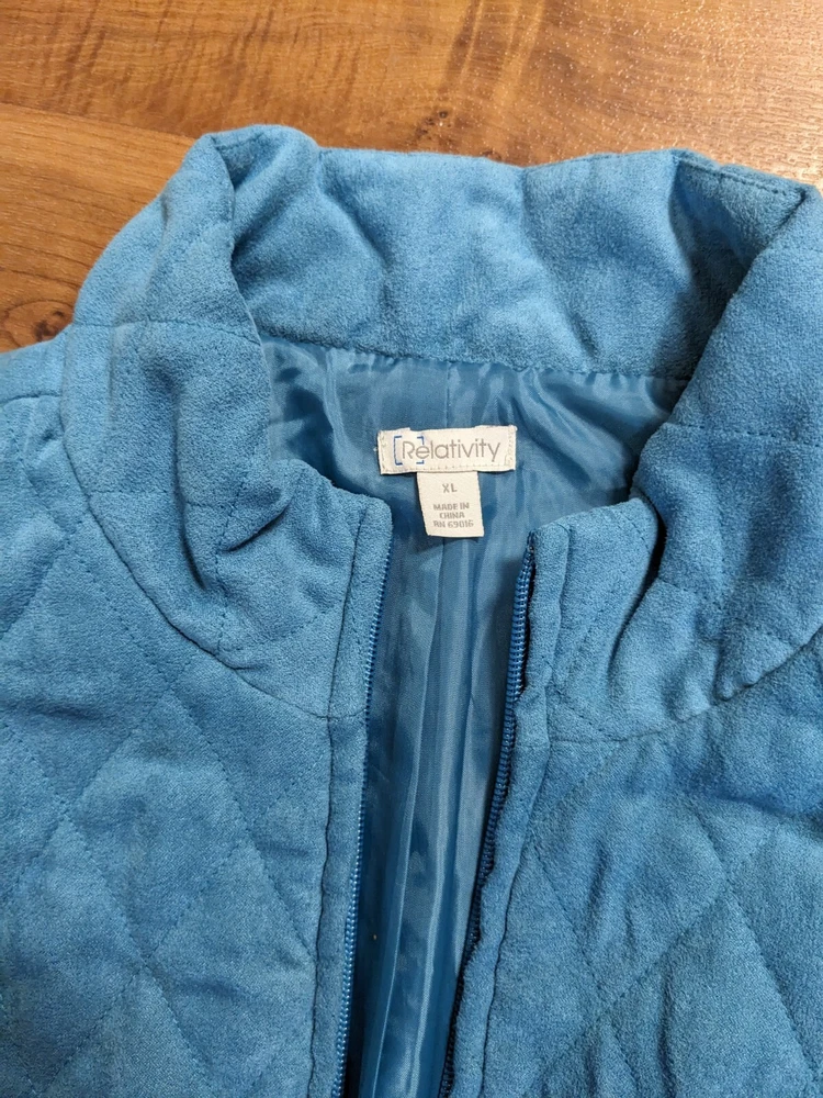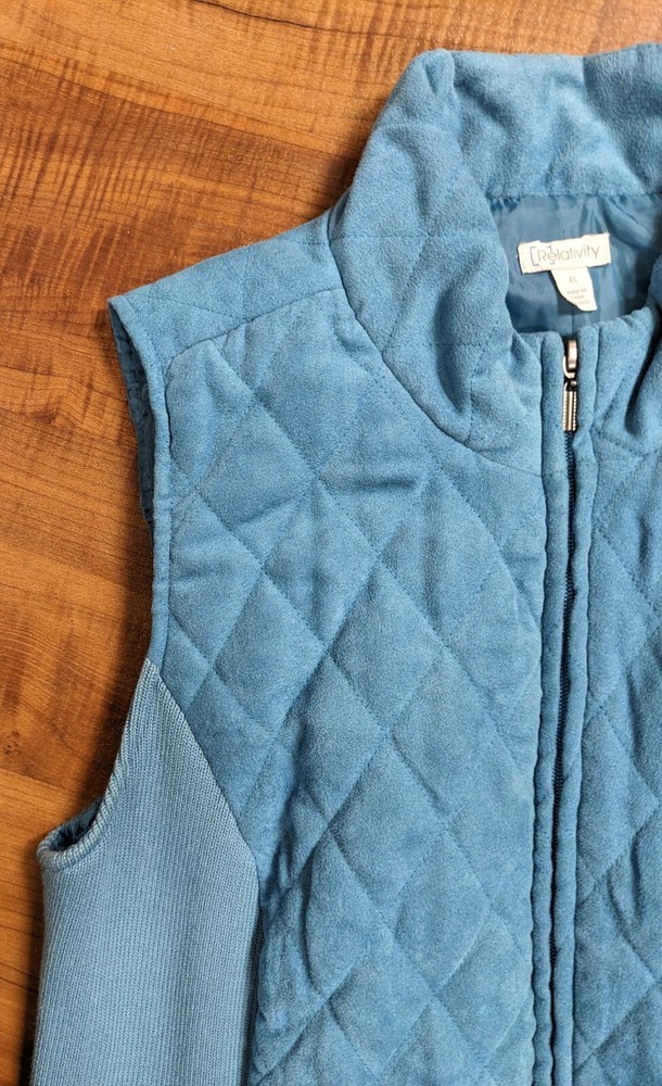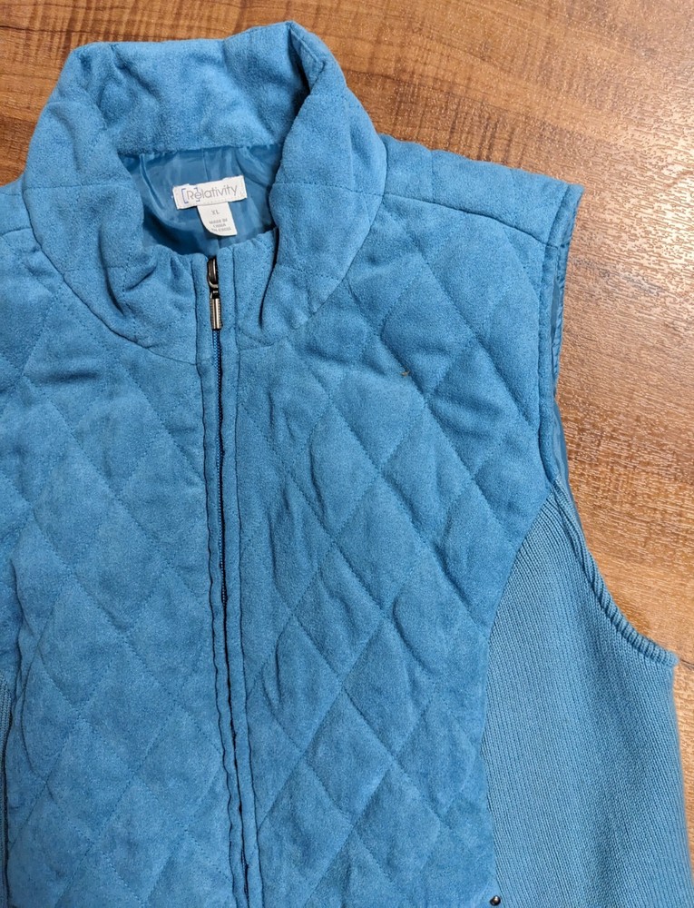 NWT: Relativity Quilted Fleece Knit Vest-Size XL, turquoise, zipper front closure, two hidden slant pockets, quilted front and back, stretchy knit sides, stand up collar, lined, buttery soft fabric. Shell - 100% polyester, fiberfill - 100% polyester, lining - 100% polyester, side panels - 55% acrylic, 45% cotton MSRP $64 Measurements: Pit to pit - 19 in Top of shoulder to bottom - 24 and 1/2 in