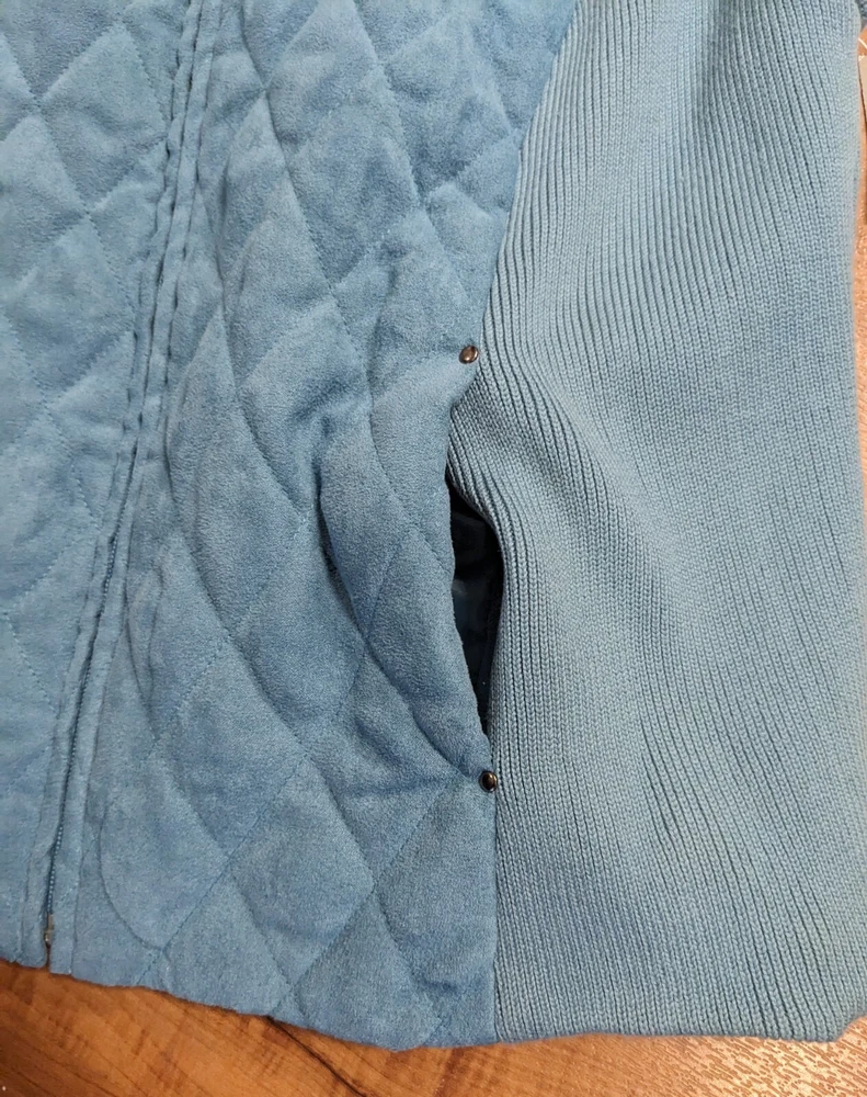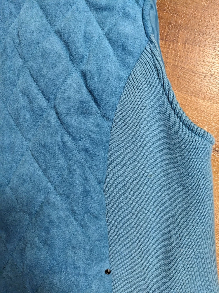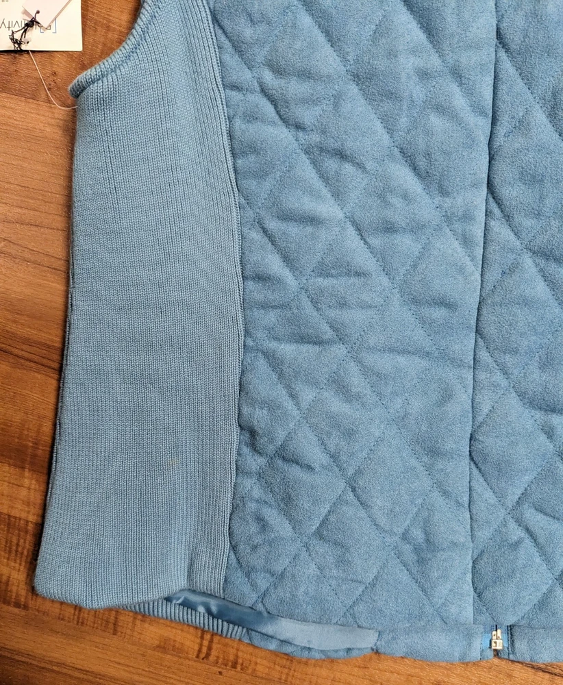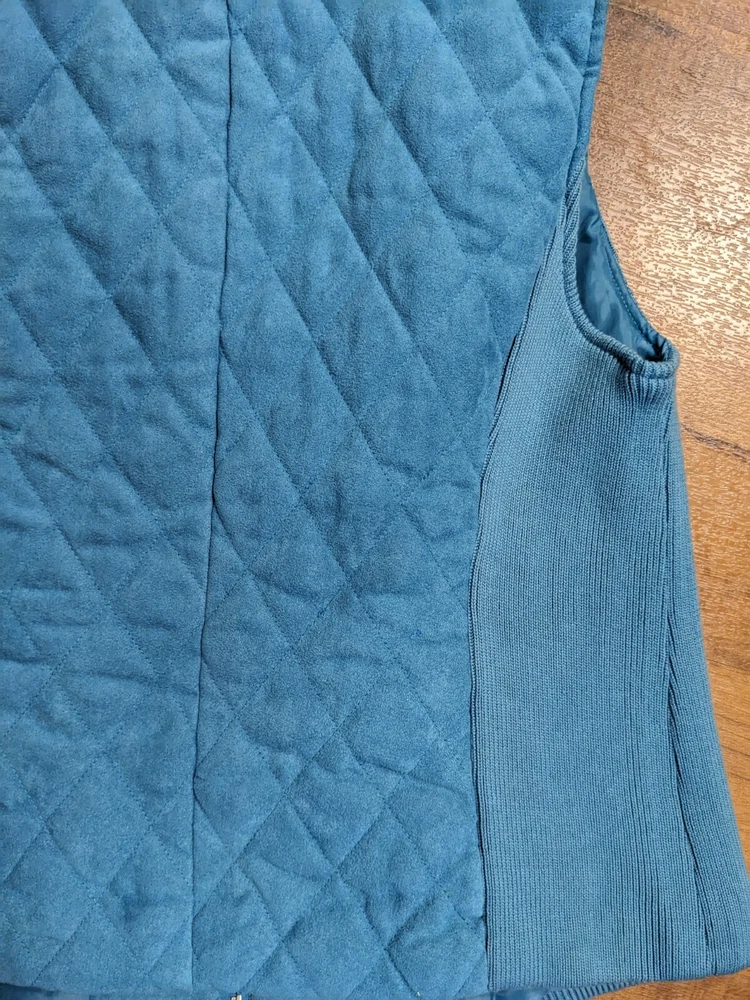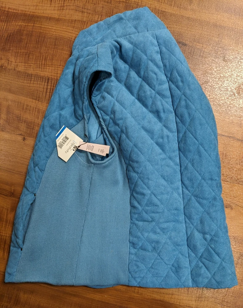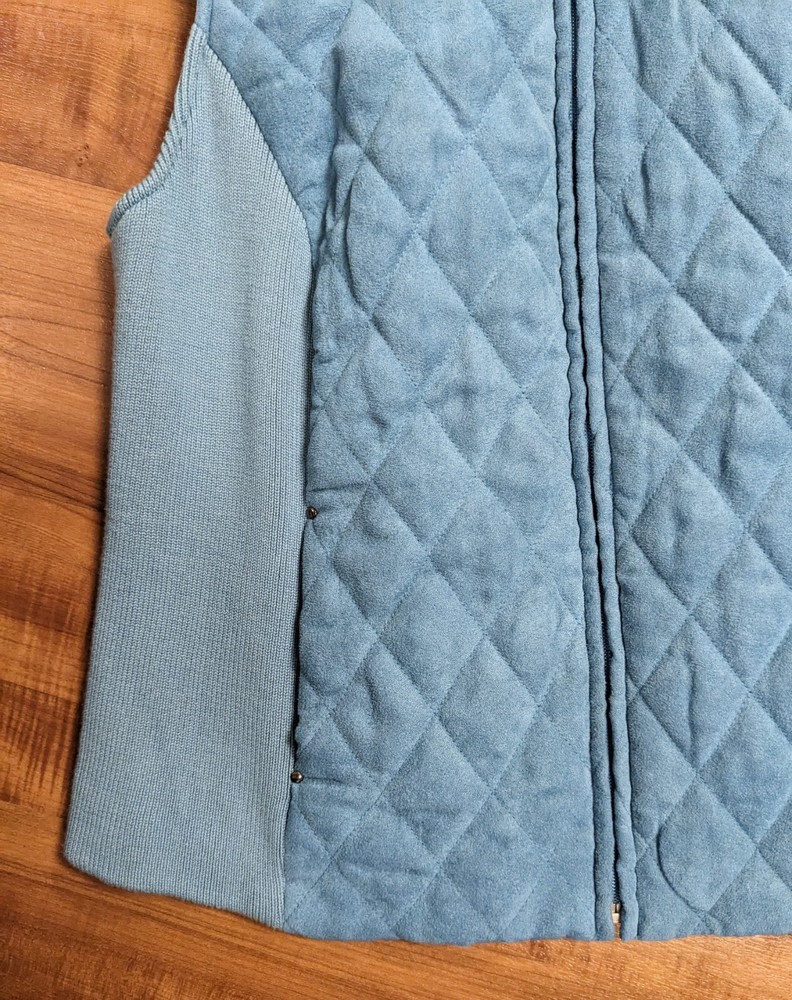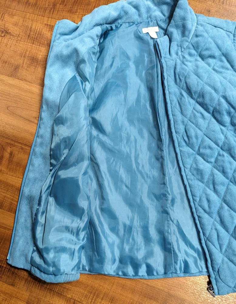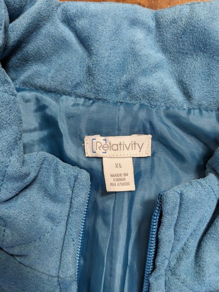 NWT: Relativity Quilted Fleece Knit Vest-Size XL, turquoise, zipper front closure, two hidden slant pockets, quilted front and back, stretchy knit sides, stand up collar, lined, buttery soft fabric. Shell - 100% polyester, fiberfill - 100% polyester, lining - 100% polyester, side panels - 55% acrylic, 45% cotton MSRP $64 Measurements: Pit to pit - 19 in Top of shoulder to bottom - 24 and 1/2 in