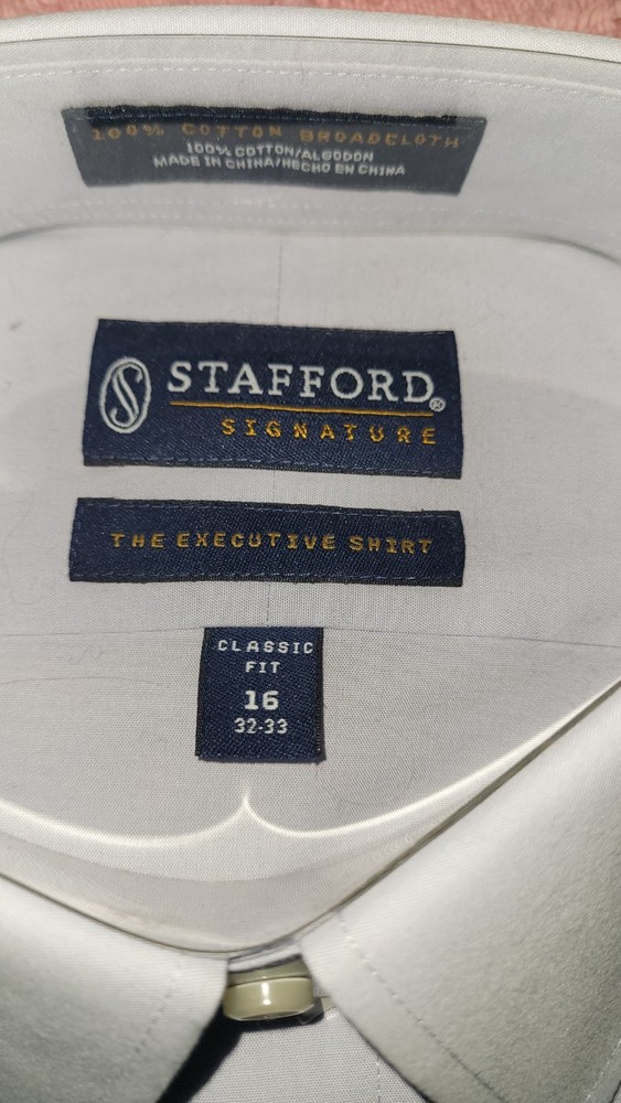 This NWT Stafford Signature long sleeve dress shirt is a classic and versatile option for men's business attire. Made from 100% cotton in a solid blue color, the shirt features a collared neckline with a button closure and regular fit. The 32/33 sleeve length and chest size 32 inches make it suitable for a comfortable and polished look. Easy to care for with a medium fabric wash, this shirt is machine washable for added convenience. Ideal for a timeless and professional style, this dress shirt is a staple piece for any man's wardrobe.