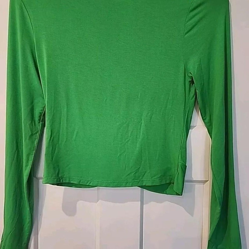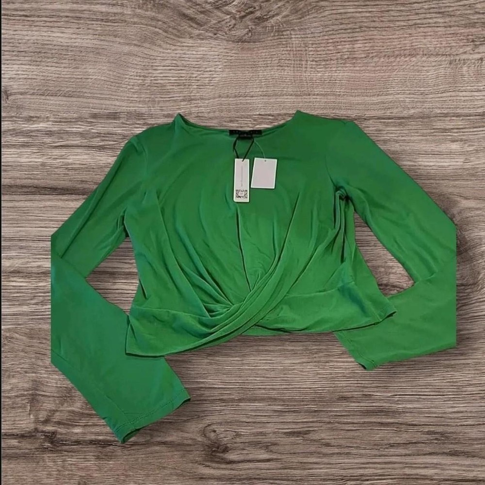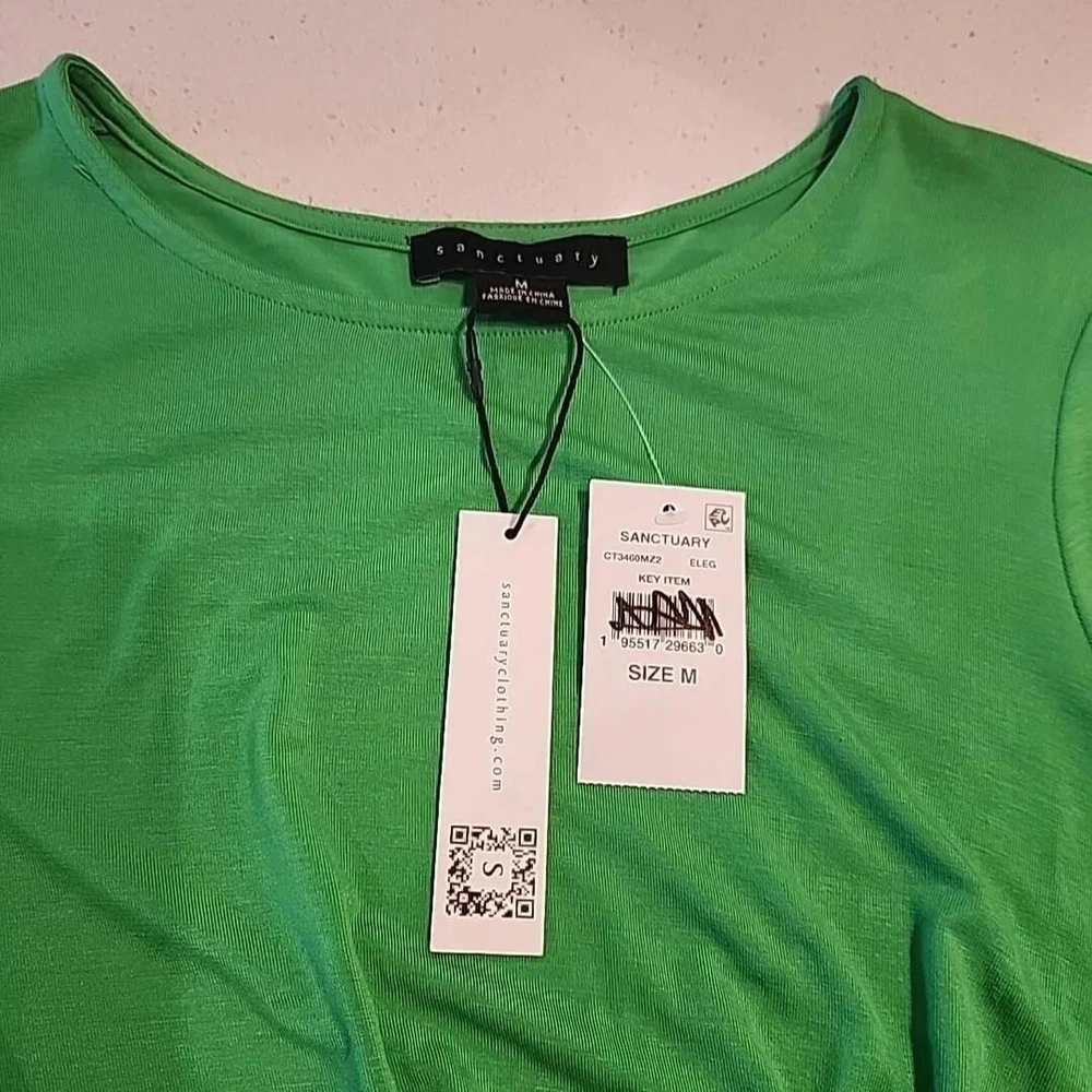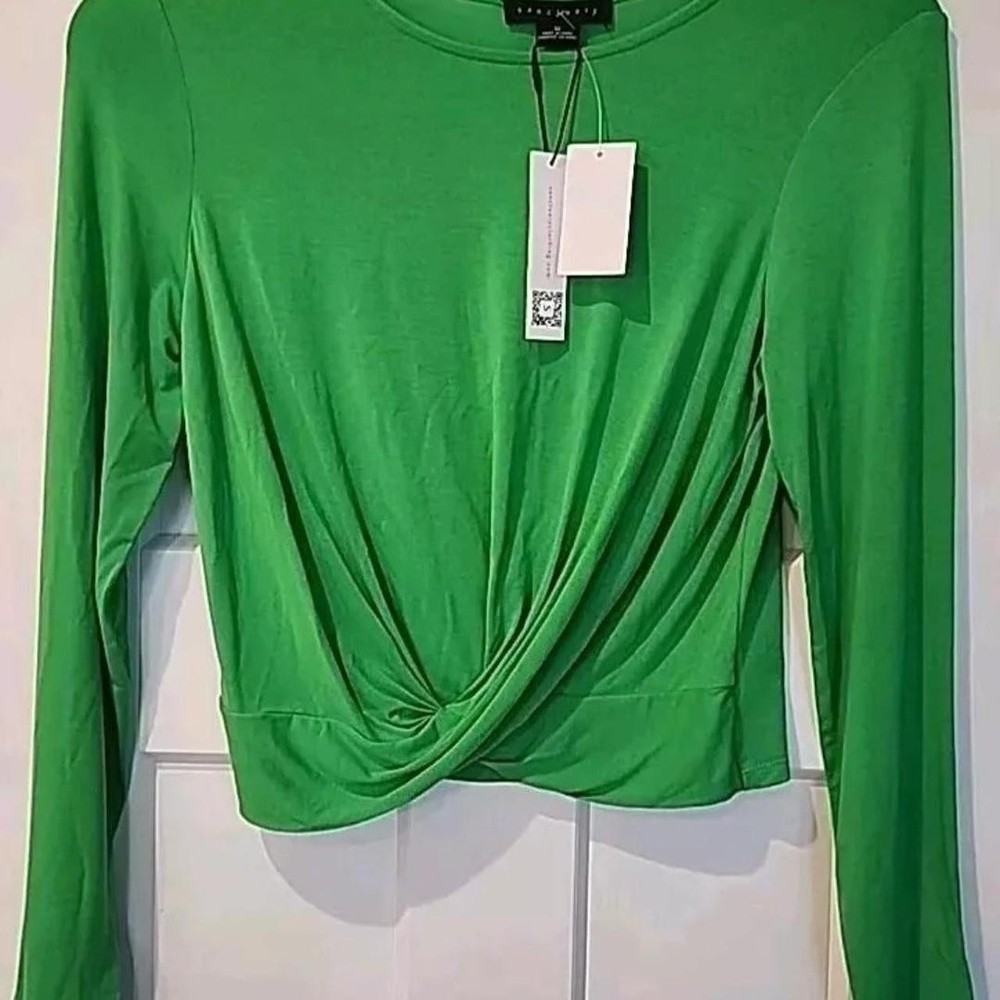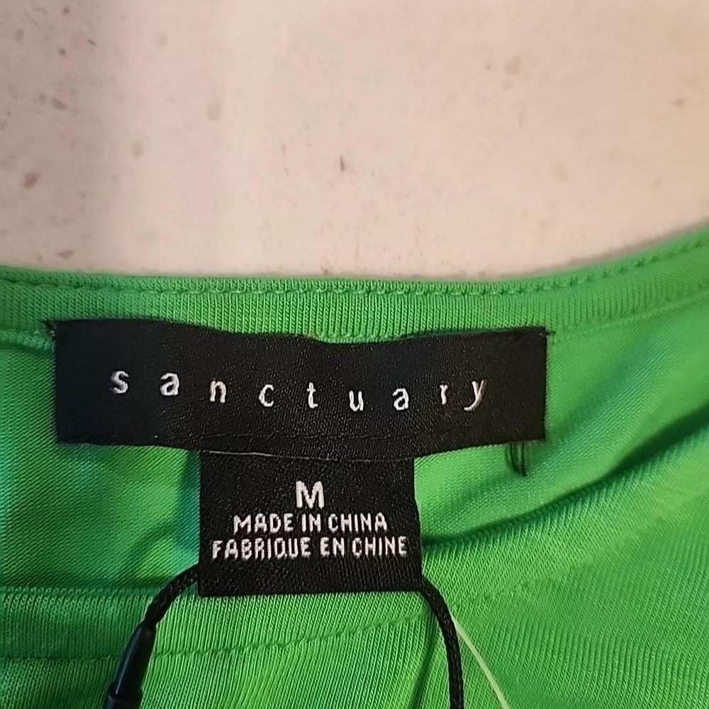 The NWT Sanctuary Women's Green Knot Front Long Sleeve Pullover is a stylish top perfect for back to school or casual outings. Made from a comfortable nylon blend fabric, this blouse features a unique knot detail at the front and a round neckline for a classic look. The long sleeves and raglan sleeves add a trendy touch, while the solid green color makes it versatile for various occasions. This pullover is machine washable and designed for a regular fit in size M, making it a practical and fashionable choice for women looking for a designer-inspired top for their wardrobe.
