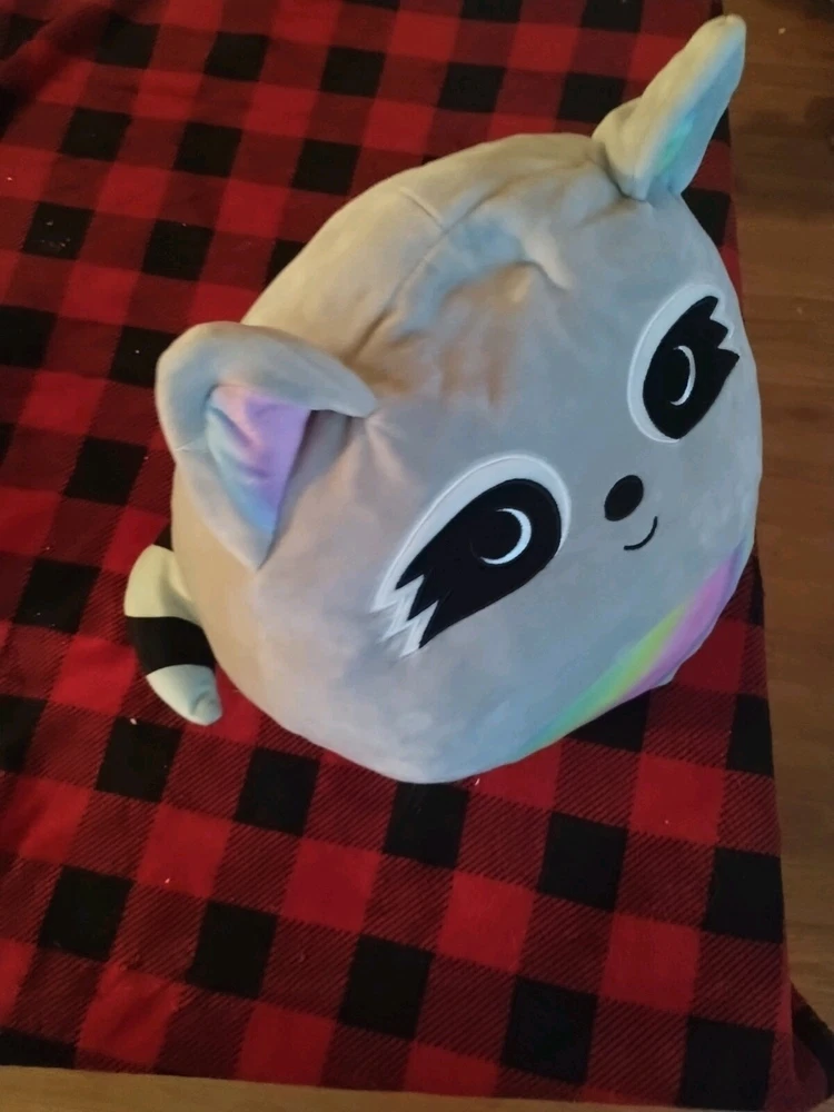 This is a 2021 Kellytoy Squishmallows plush of Max the Raccoon. Max is a medium-sized (16”) gray raccoon with a rainbow belly and ears. He is part of the Squishmallows character family and is recommended for ages 3 and up. Max is washable and suitable for various age levels, making him a cuddly and colorful addition to any collection.