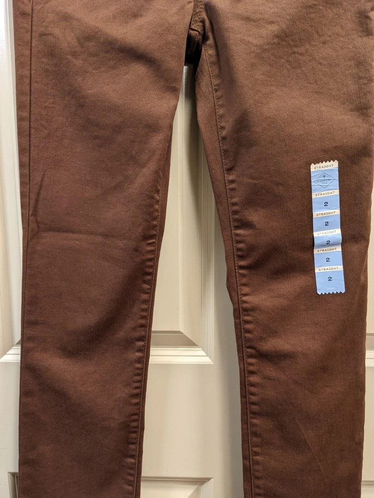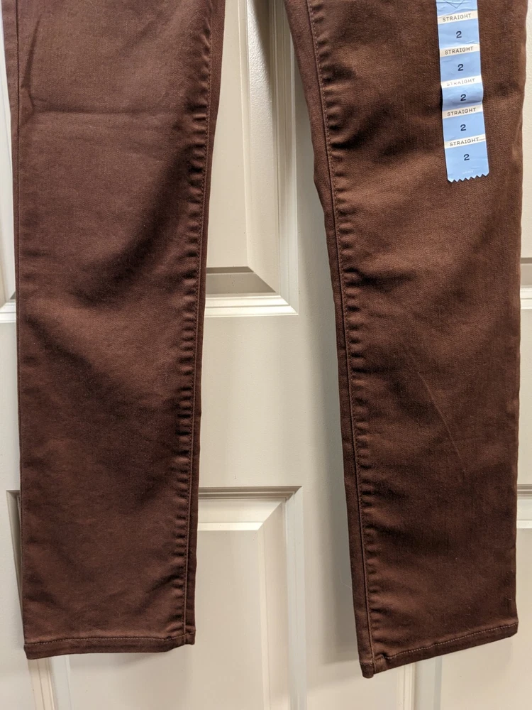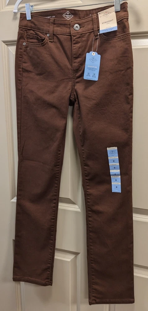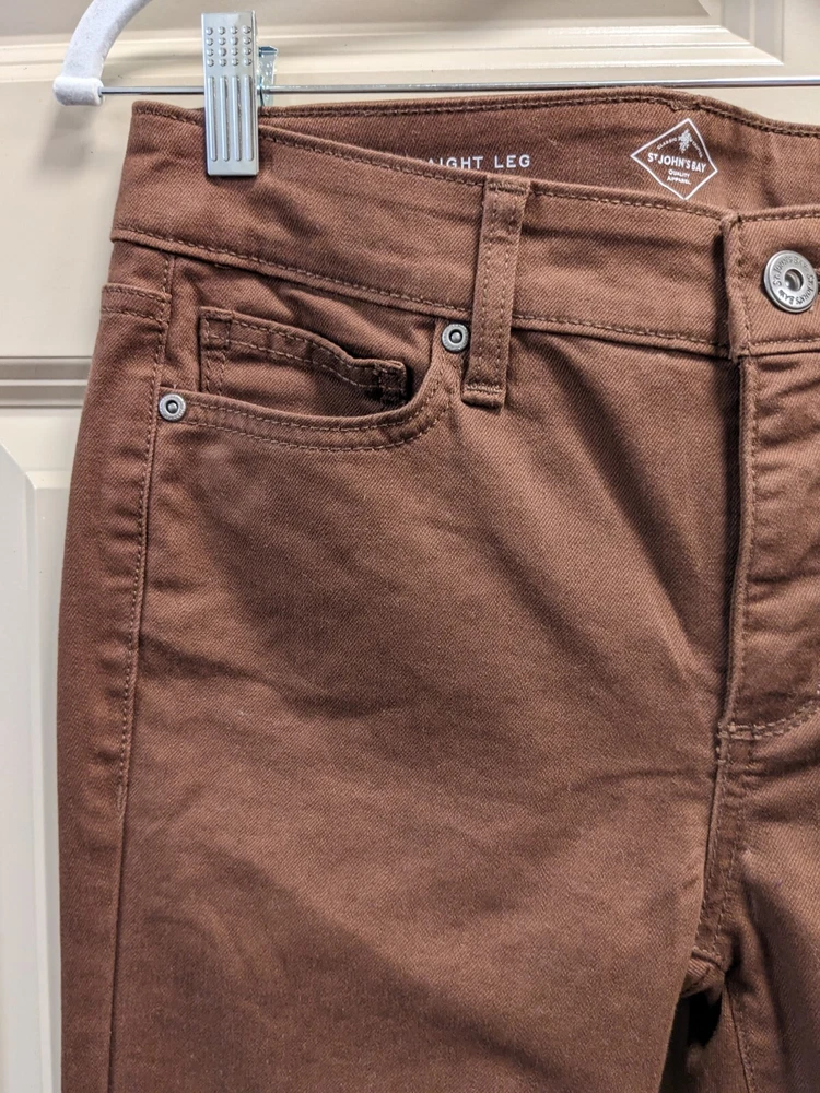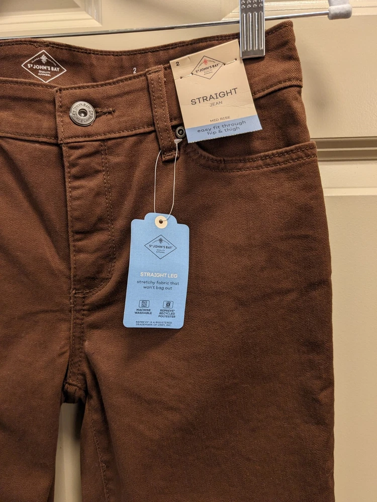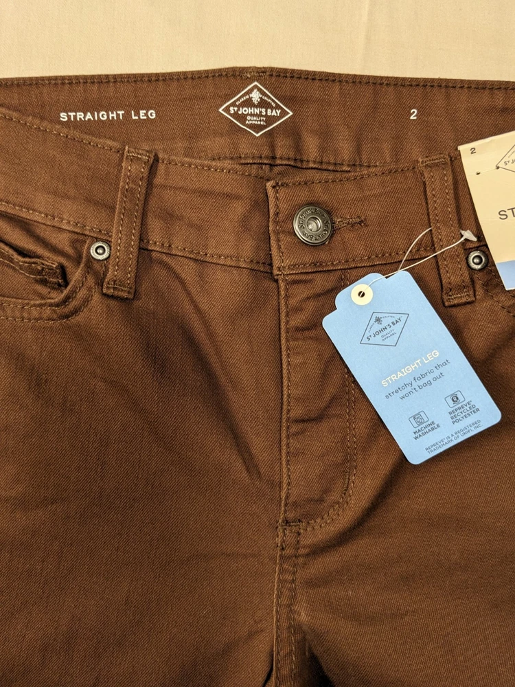 NWT: St. John's Bay Brown Straight Leg Jean Pants - Size 2, midrise, easy fit through hip and thigh wide comfortable waistband, hidden elastic waistband in back adds extra comfort with no gap, extended pockets and tummy control fabric and strategic seams are slimming, soft fine wale corduroy, five pocket design, button / zipper front closure. 75% cotton, 23% polyester, 2% spandex. MSRP $46 Measurements: Waist laid flat - 14 in Length-41 in Inseam - 31 in **Please note I have several other pairs of the same pants in different colors for sale. Message me if interested in combining for a discount on price and combined shipping.