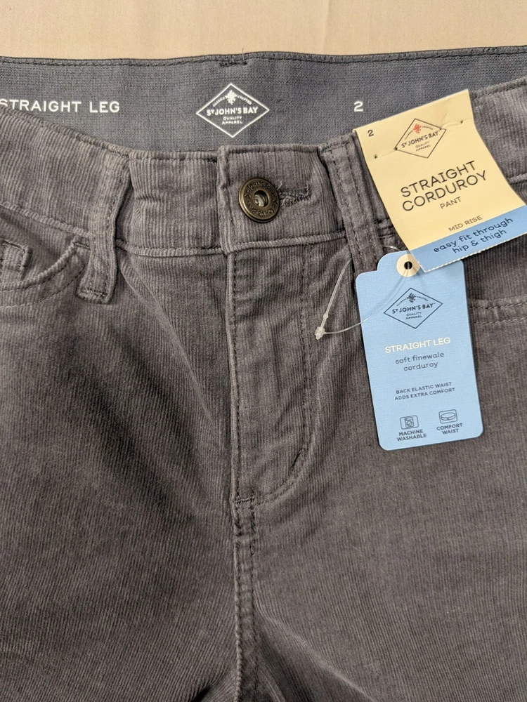 NWT: St. John's Bay Gray Straight Leg Corduroy Pants - Size 2, midrise, easy fit through hip and thigh wide comfortable waistband, hidden elastic waistband in back adds extra comfort with no gap, extended pockets and tummy control fabric and strategic seams are slimming, soft fine wale corduroy, five pocket design, button / zipper front closure. 75% cotton, 23% polyester, 2% spandex. MSRP $46 Measurements: Waist laid flat - 14 in Length-41 in Inseam - 31 in **Please note I have several other pairs of the same pants in different colors for sale. Message me if interested in combining for a discount on price and combined shipping.