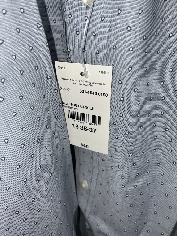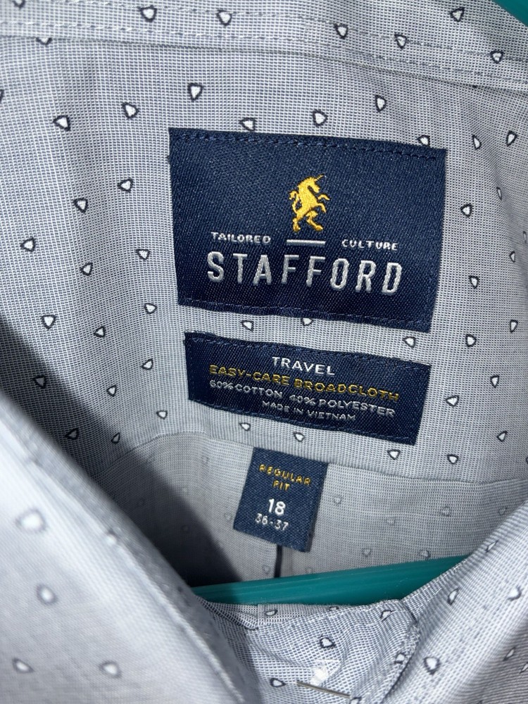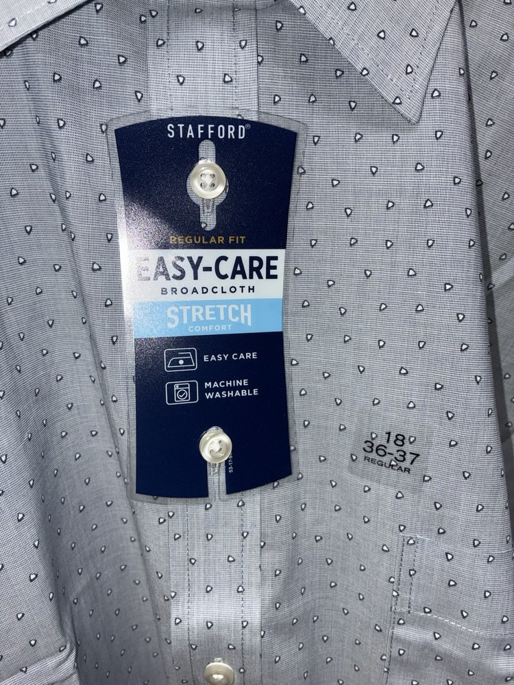 Brand: Stafford Collection: Easy Care Broadcloth / Stretch Comfort Size: 18" Neck, 36-37" Sleeve Length Color/Pattern: Light Blue "EOE Triangle" (Blue geometric triangle print) Material: 60% Cotton, 40% Polyester Features: Single front chest pocket, pointed collar, and a wrinkle-resistant finish for "easy care".
