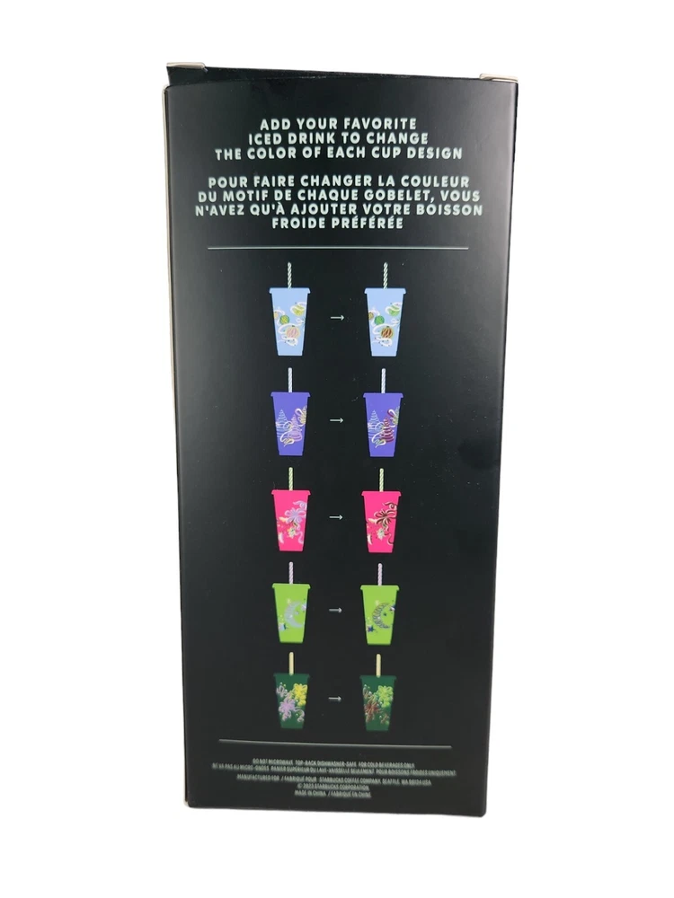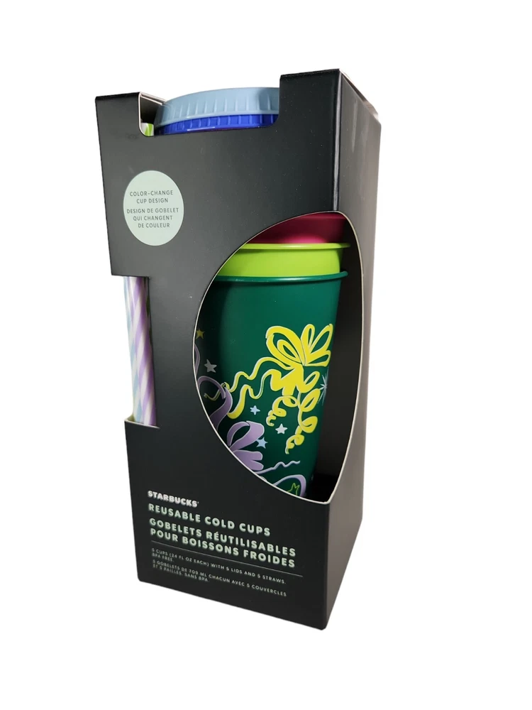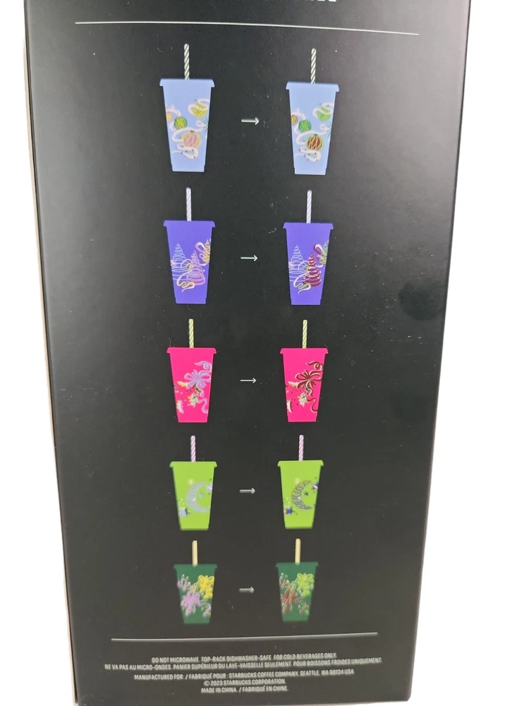 This pack of five Starbucks Holiday Reusable Cold Cups is perfect for any coffee or tea lover. The cups feature a color-changing design and come with lids and straws, making them convenient for on-the-go use. These cups are an original creation from Starbucks and were manufactured in 2023. The cups are part of a larger Starbucks collection and are perfect for adding to any coffee or tea-themed collection. They are also a great gift for anyone who loves Starbucks or coffee in general. Don't miss out on the chance to add these unique and festive cups to your collection!