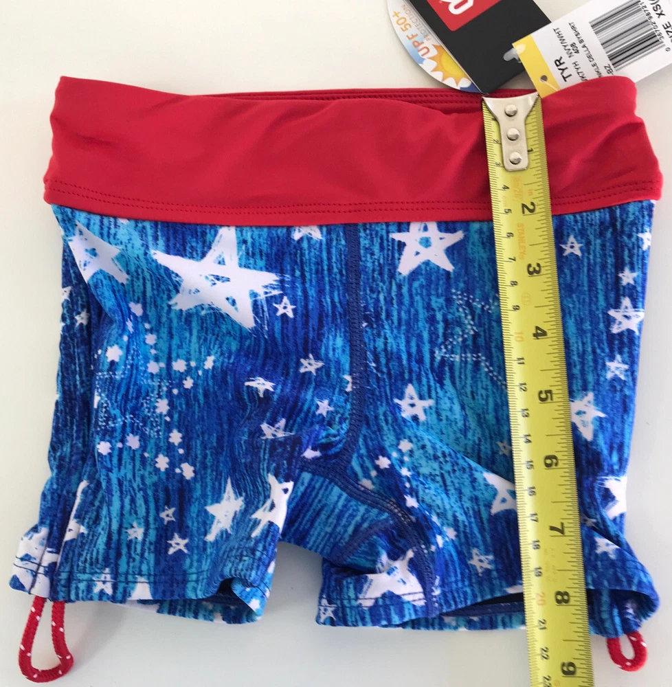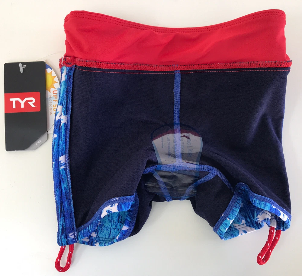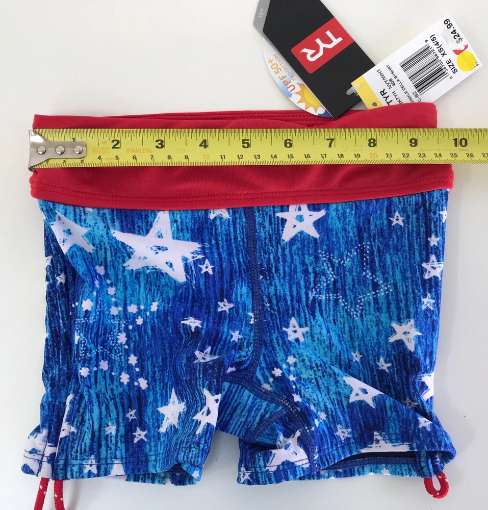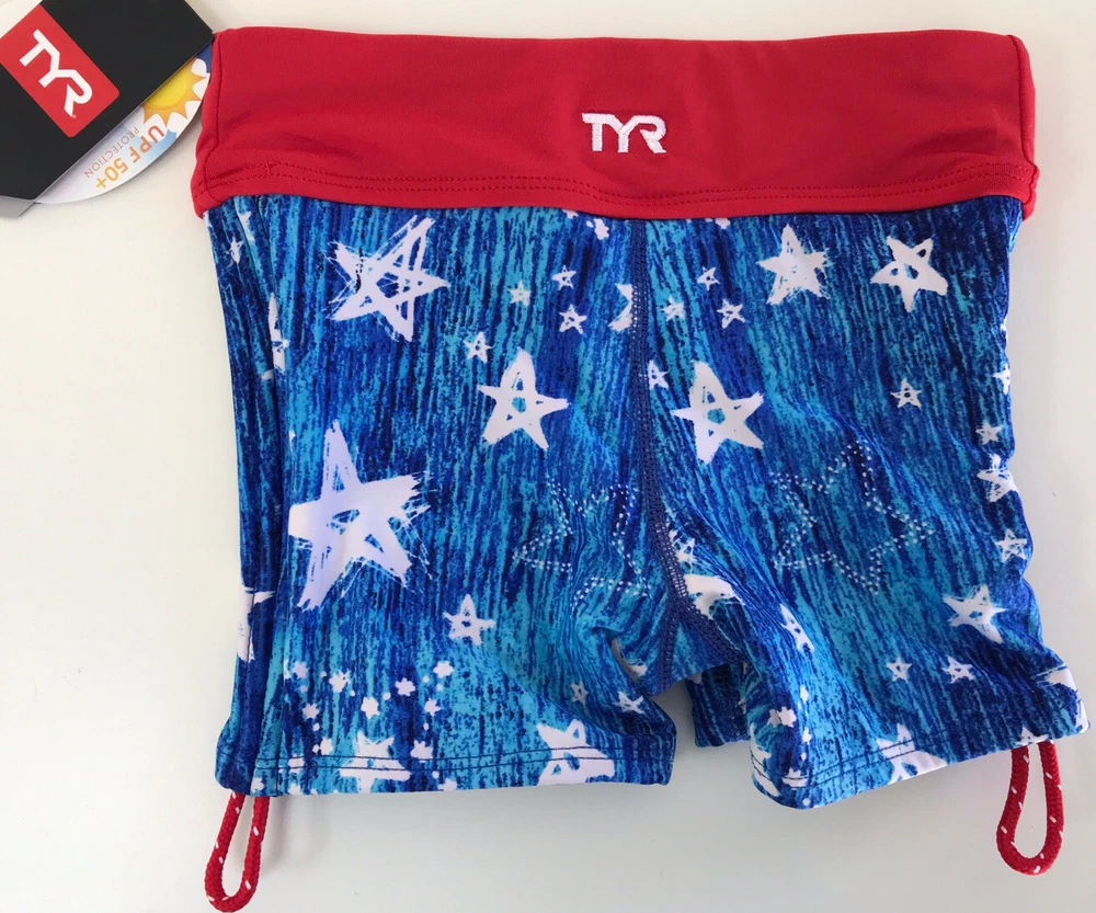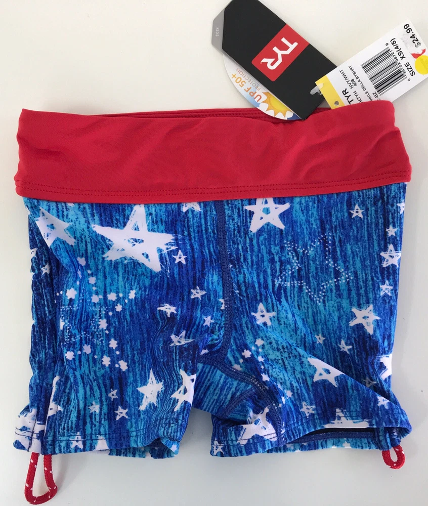 TYR Girls' Twinkle Della Boy Swim Shorts Please see matching top and/or other sizes in my store. New with tags Blue/White/Red Girl’s XS (4/5) (see pictures for detail measurements) Athletic fit boy shorts Durafast Lite® fabric offers 200+ hours of performance UPF 50+ provides sun damage protection 360 degree range of motion Power mesh control Fabric: 88% polyester/12% spandex
