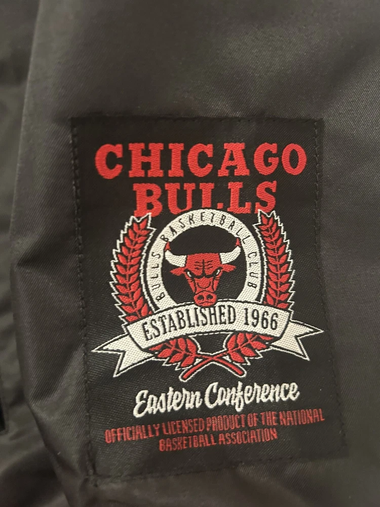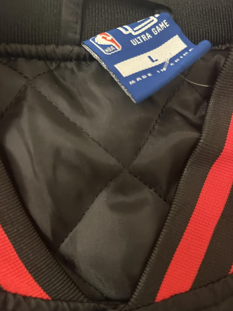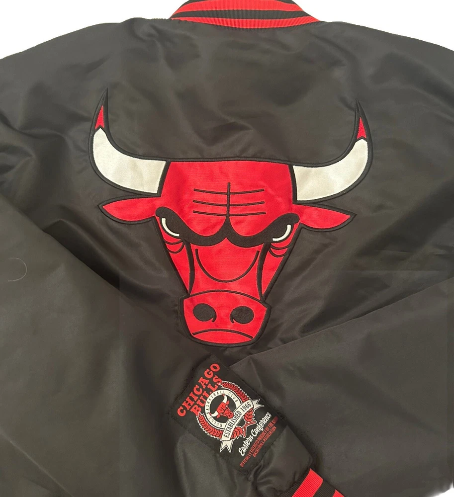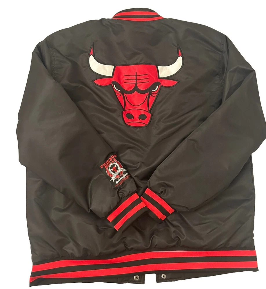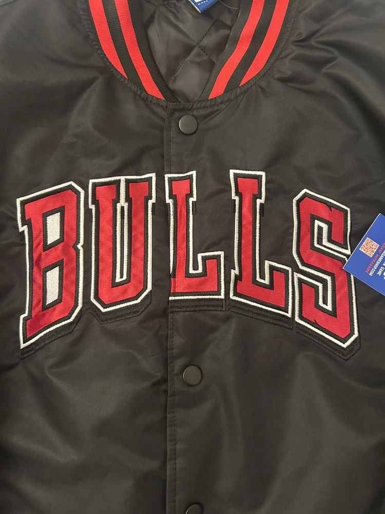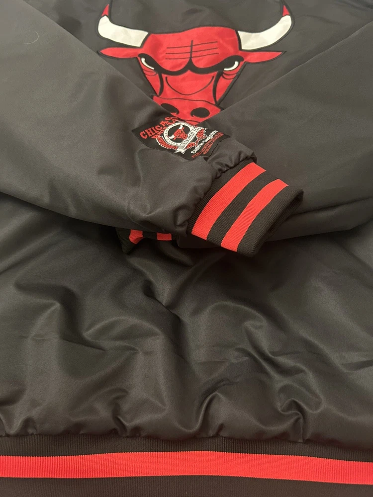 NWT UNK NBA Chicago Bulls Varsity Black Red Full-Snap Satin Jacket Men's Large L. Condition is New. Shipped with USPS Ground Advantage.