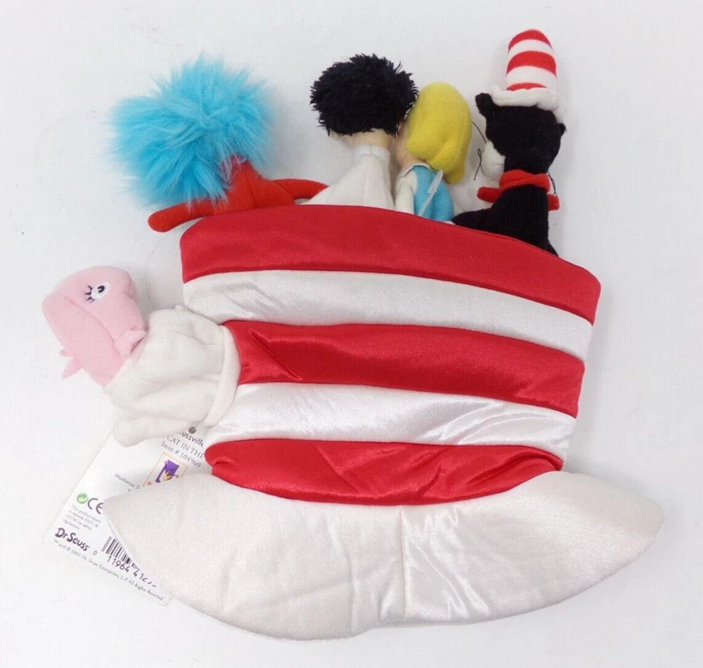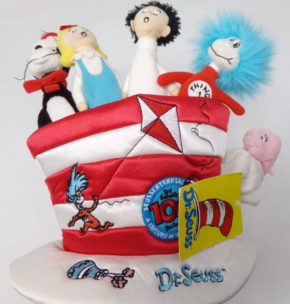 New hat shaped Hand/Finger puppet from Dr. Seuss's 100th Anniversary or as embroidered on the front: "Seussentennial - A century of Imagination! - Ted Geisel's 100th - Dr. Seuss". The plush finger puppets are the girl and boy, the Cat in the Hat, Thing 1; the thumb is the fish. The front has a embroidery of Thing with a kite, and on the rim of the hat is a hot air balloon and "Dr. Seuss". Tag is dated 2003 and is item #104960. Free shipping within the U.S. (inventory code B 3/3 )