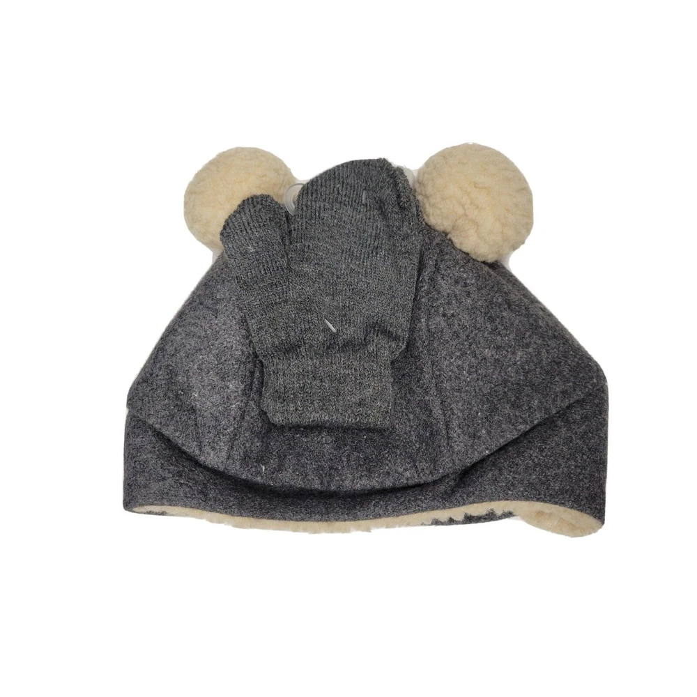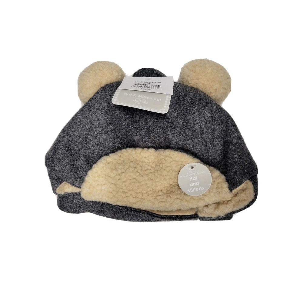 New with Tags. First Steps by Stepping Stones baby / toddler matching hat and mitten set. 60% polyester, 40% wool. Size 12-24 months. Cute gray winter hat has pom poms to look like bear ears. Warm cream color shearling-like lining, hook and loop closure chin strap. NWT.