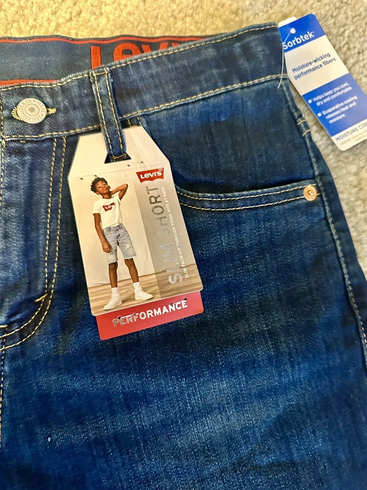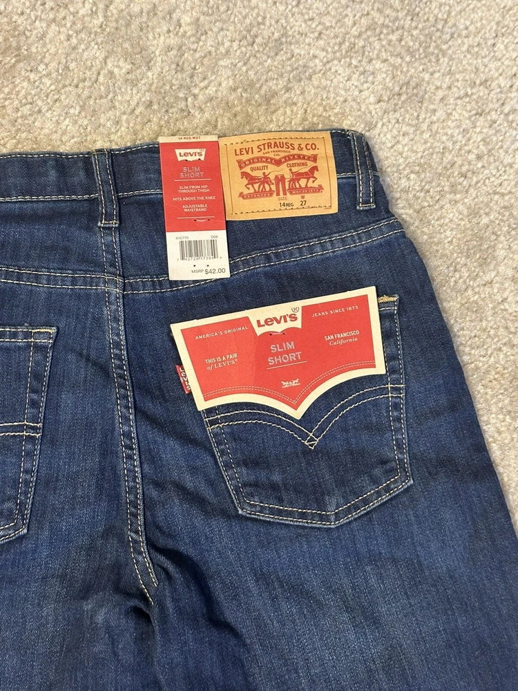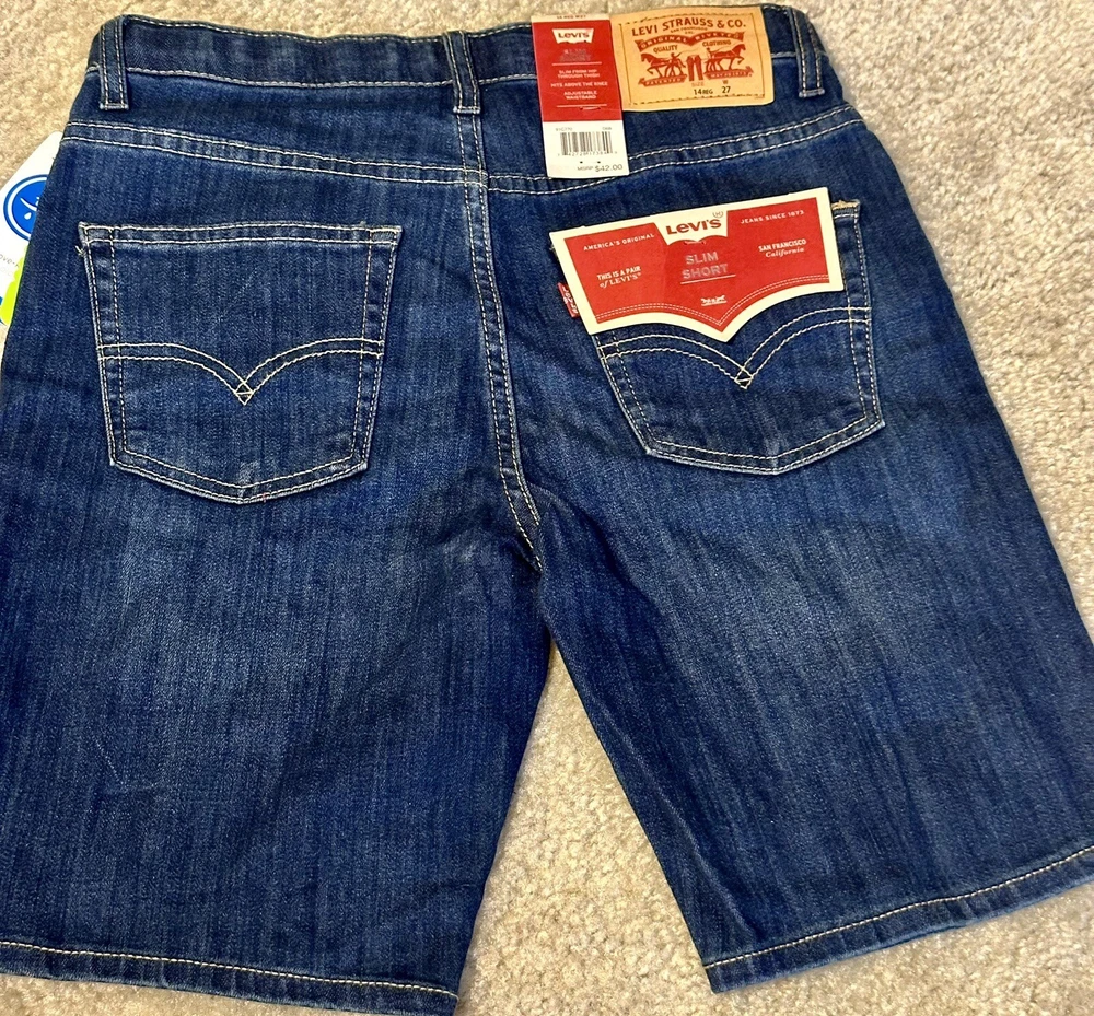 NWT YOUTH KIDS BOYS LEVI'S SHORTS DRY STRETCH SLIM PERFORMANCE SHORTS BRAND NEW WITH TAGS SIZE: 14 (27) COLOR: MEDIUM WASH SLIM SHORT SHORTS ZIP AND BUTTON CLOSURE FRONT & BACK SLIP POCKETS CATCH-MOVE-RELEASE MOISTURE CONTROL TECHNOLOGY SOIL RELEASE MOISTURE WICKING STRETCH MADE OF RECYCLED MATERIALS