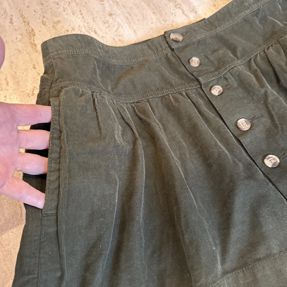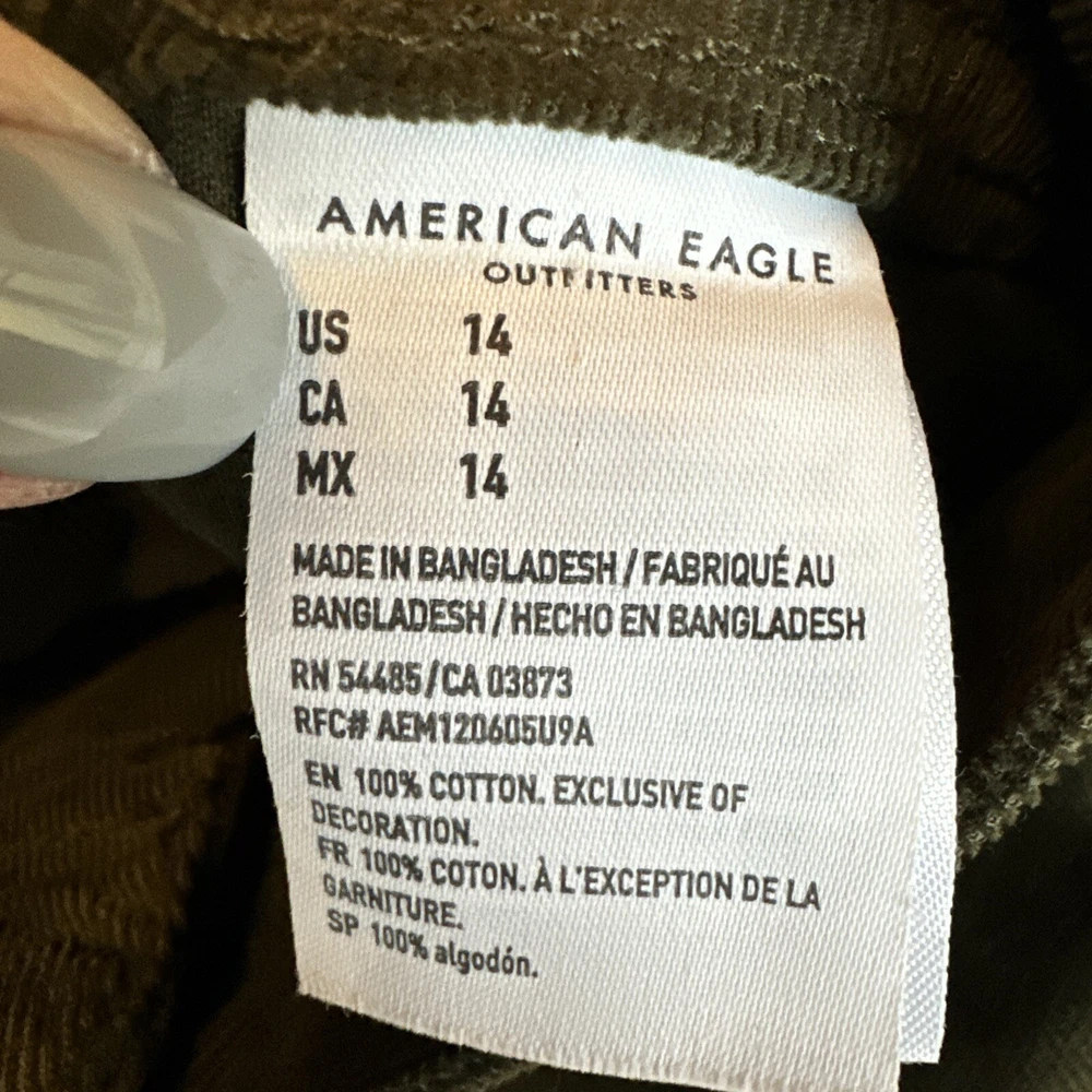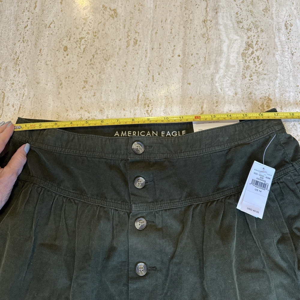 The American Eagle Super High Rise A-Line Corduroy Skirt in size 14 is a stylish and versatile addition to any wardrobe. This olive green skirt features a solid pattern with a button closure, crafted from comfortable corduroy fabric. The high rise and A-line silhouette offer a flattering fit, while the addition of pockets adds functionality to this fashionable piece. Perfect for casual or dressier occasions, this skirt from American Eagle Outfitters is a must-have for women looking for a chic and on-trend wardrobe staple.