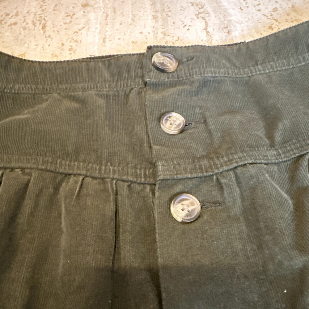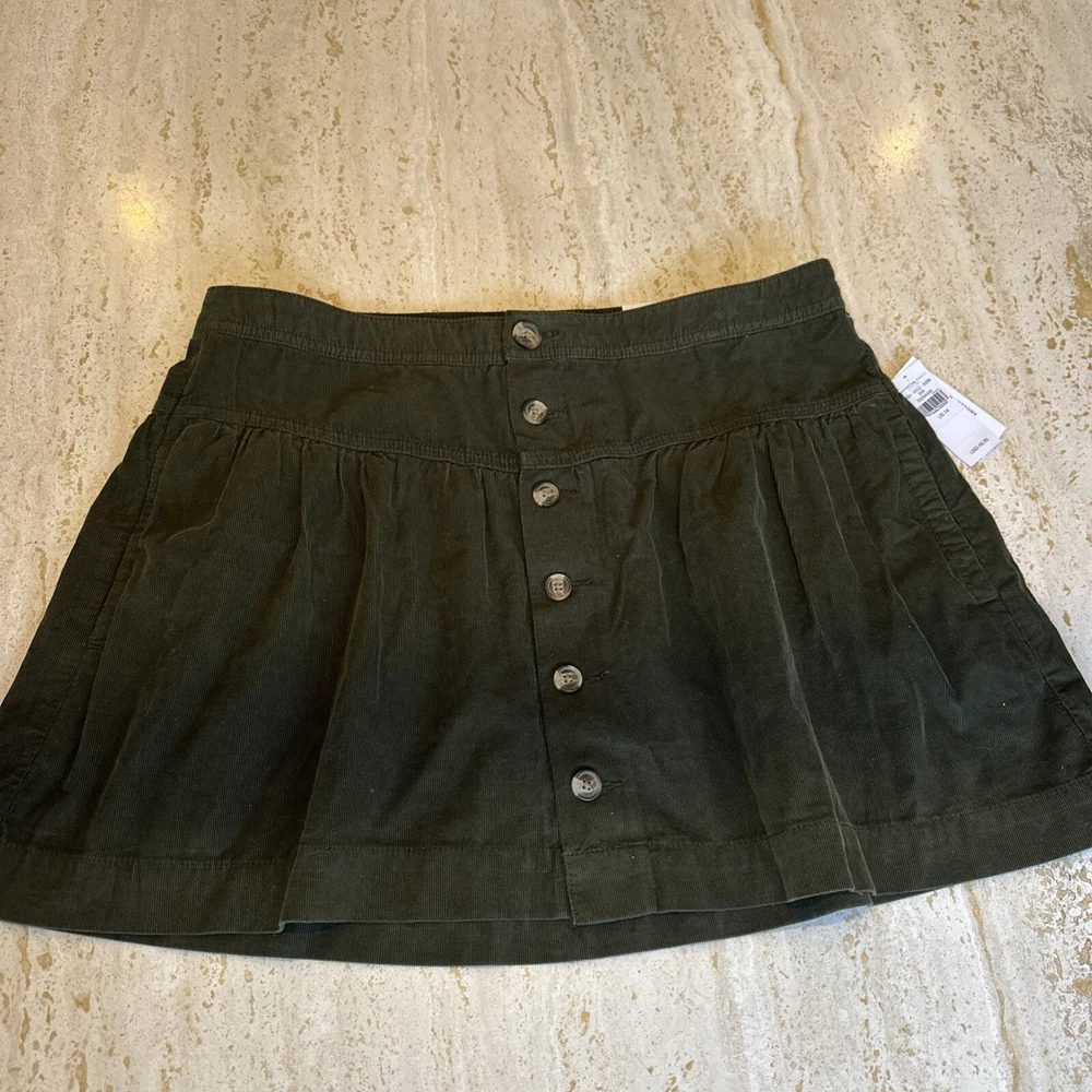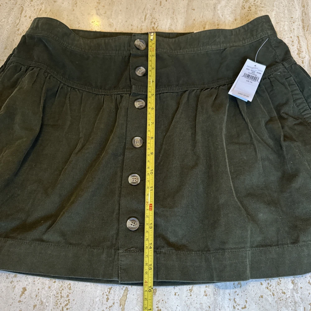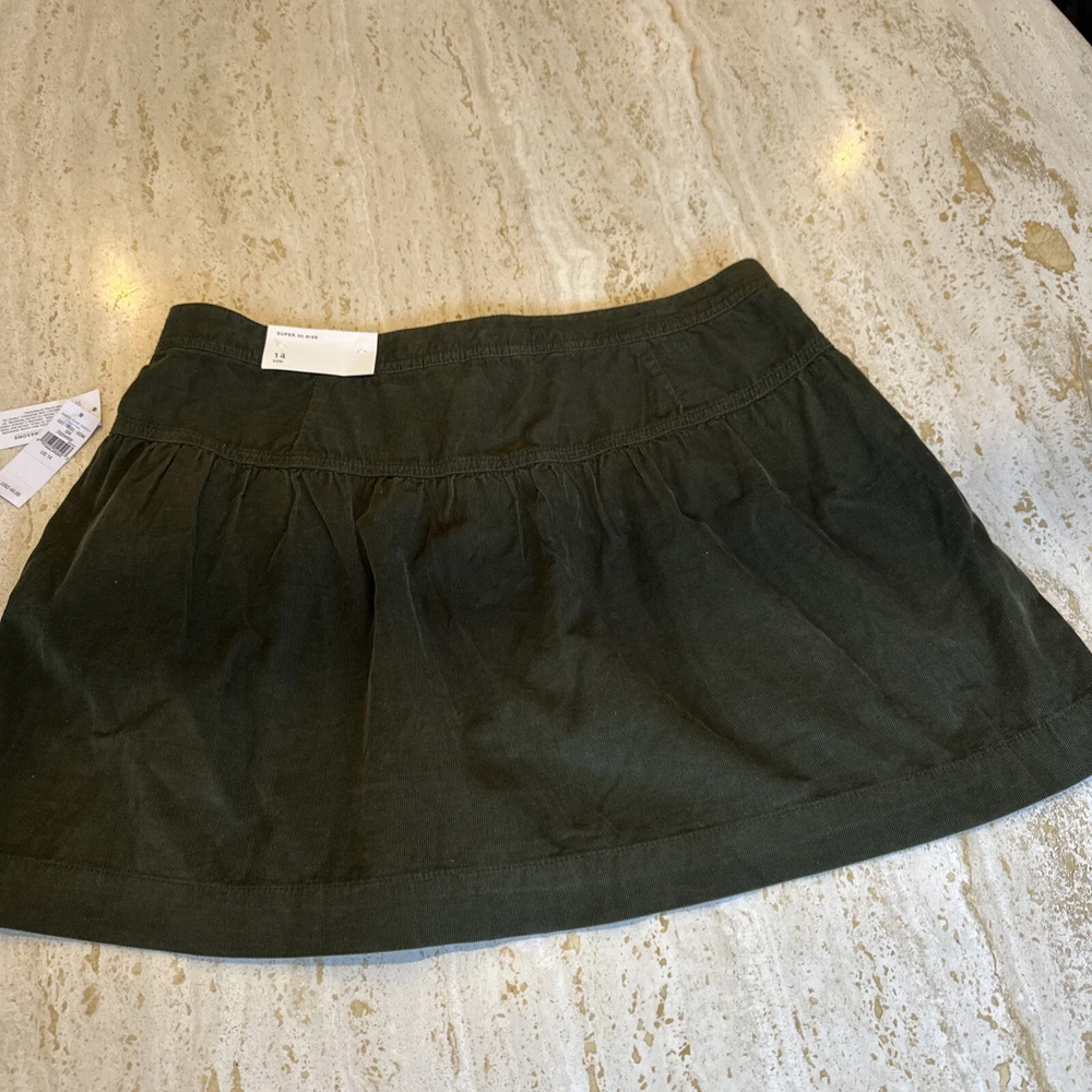 The American Eagle Super High Rise A-Line Corduroy Skirt in size 14 is a stylish and versatile addition to any wardrobe. This olive green skirt features a solid pattern with a button closure, crafted from comfortable corduroy fabric. The high rise and A-line silhouette offer a flattering fit, while the addition of pockets adds functionality to this fashionable piece. Perfect for casual or dressier occasions, this skirt from American Eagle Outfitters is a must-have for women looking for a chic and on-trend wardrobe staple.