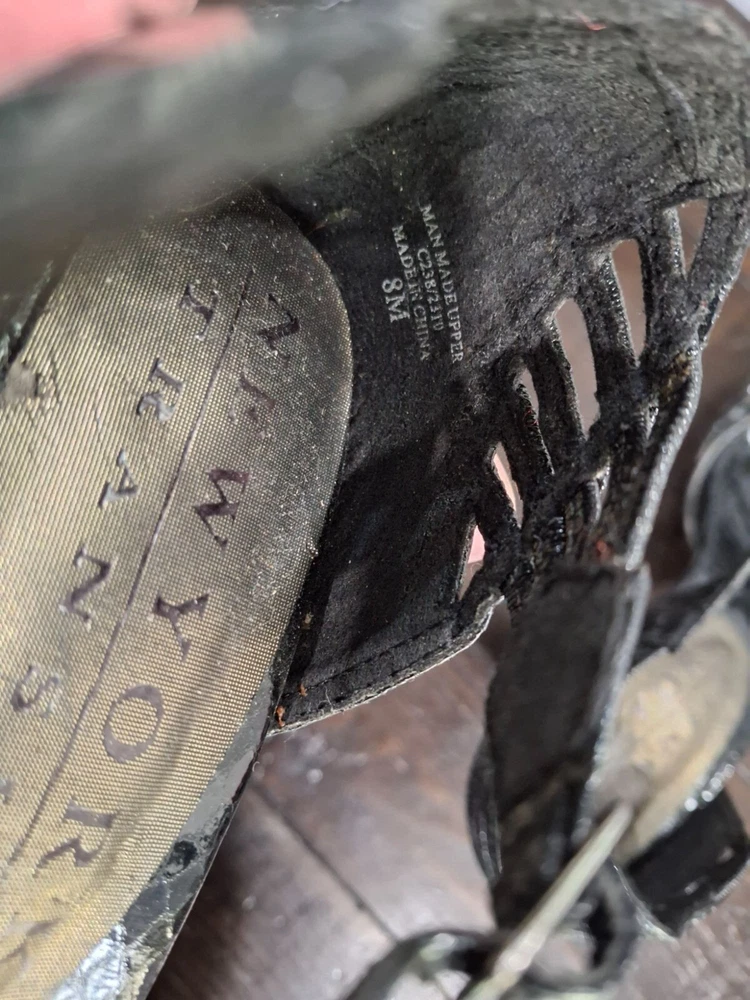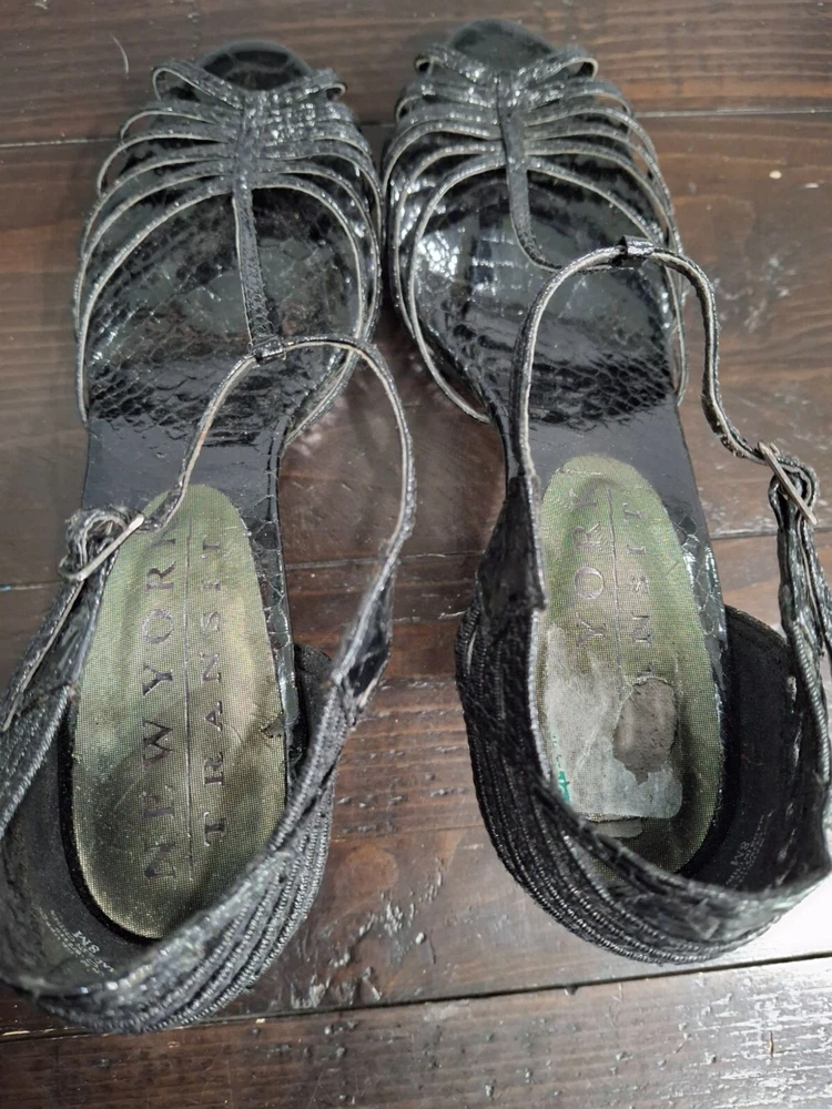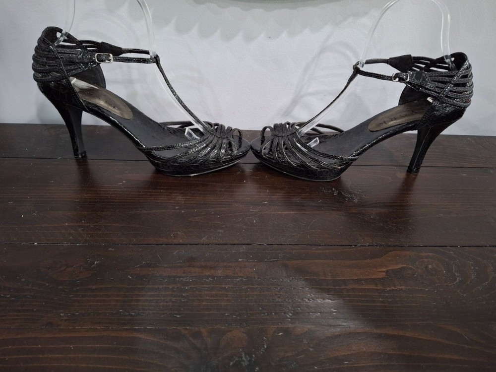 Pre-owned in excellent used condition. The only blemish is where a sticker was removed from the right inner sole (see Pictures). Add pizazz with these New York Transit metallic black strappy heels. These feature side buckle closure and a 3.5" heel. Features: • New York Transit • Black Metallic Faux Leather • 3.5" Heel • Excellent Used Condition • Women's size 8M • Strappy heel, Metallic Black Size: Womens 8 Condition: Pre-Owned Like New
