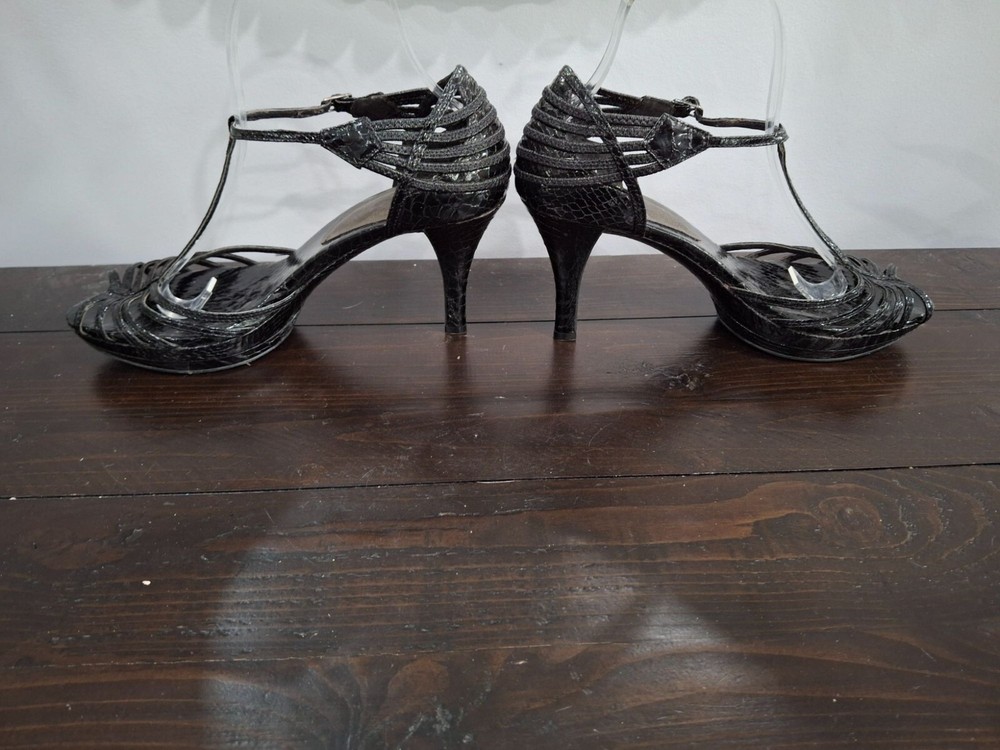 $ 136.42Moda Spana Black Leather Strappy Peep Toe Heels Size 9M Preowned