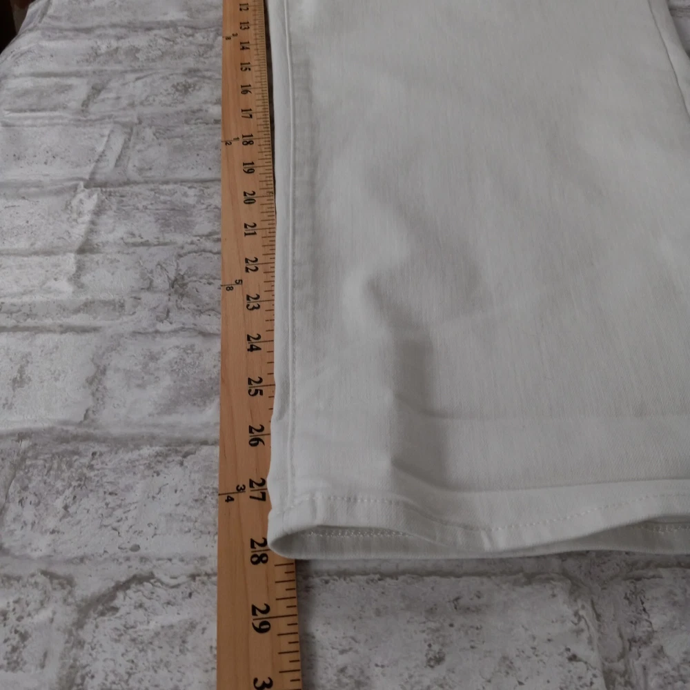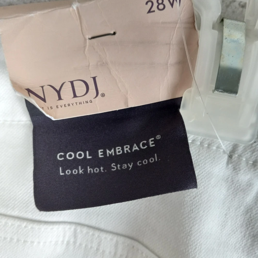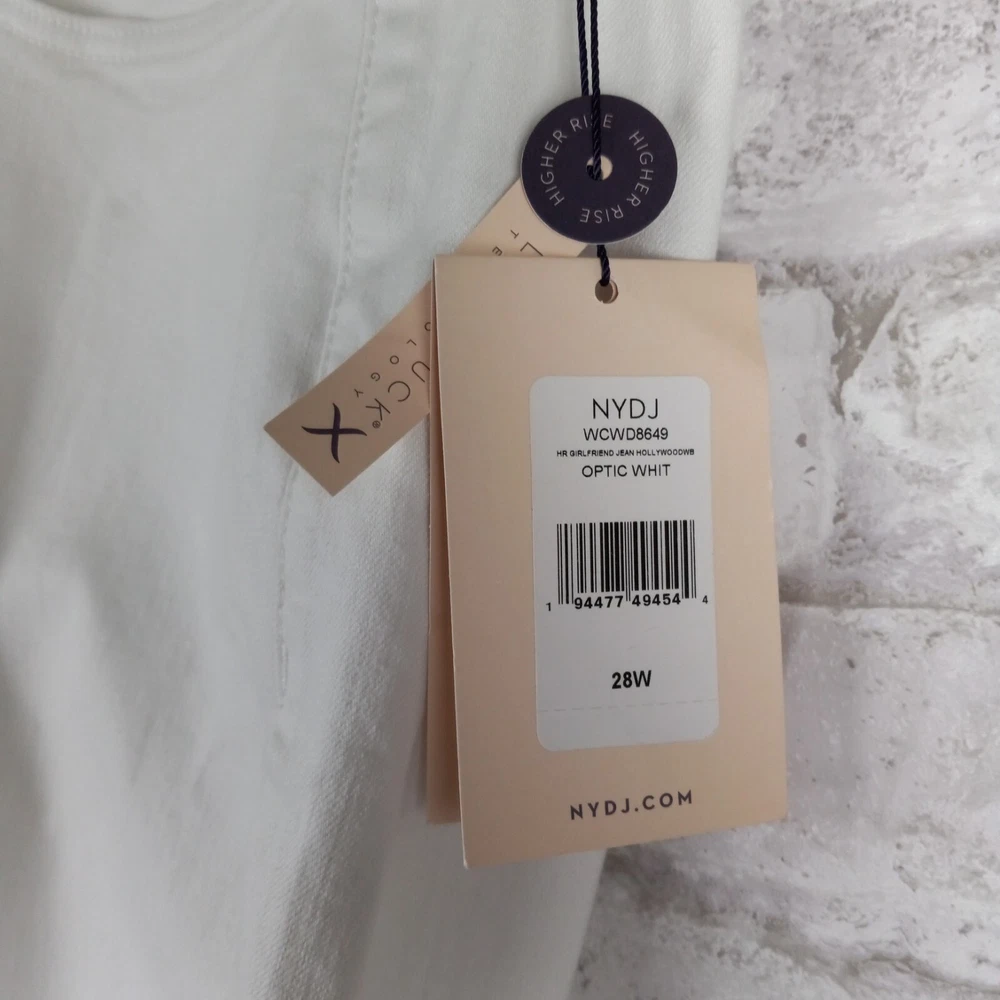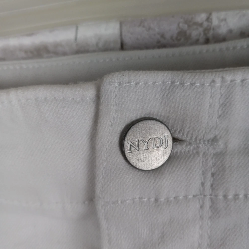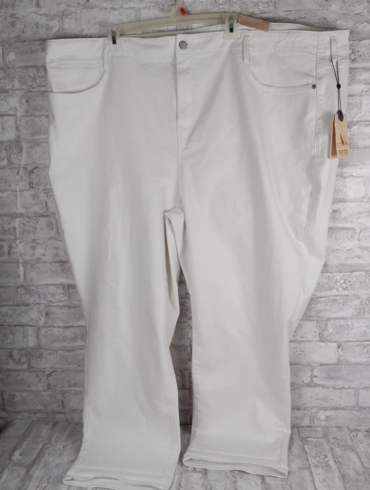 Elevate your summer style with these high-rise, plus-sized denim jeans from NYDJ. Featuring a solid white color and a 5-pocket design with button and zip closure, these jeans are perfect for a day at the beach or a casual outing. The cotton blend material is machine washable and offers a comfortable and stretchy fit, making them ideal for any occasion. The optic white cool embrace girlfriend model is a must-have for any fashion-forward woman who wants to look and feel her best. With a waist size of 50 inches and an inseam of 28 inches, these jeans are designed to fit and flatter. So why wait? Add these stylish jeans to your wardrobe today and experience the ultimate in comfort and style. See pics for details and measurements The bottoms of the jeans have a crease from the jeans being folded up at the ankles. The fold will come out with a wash.
