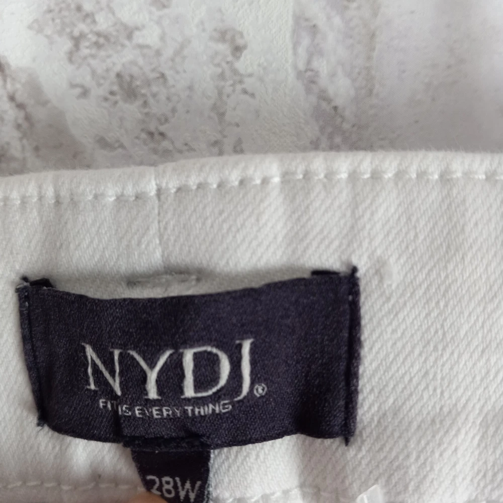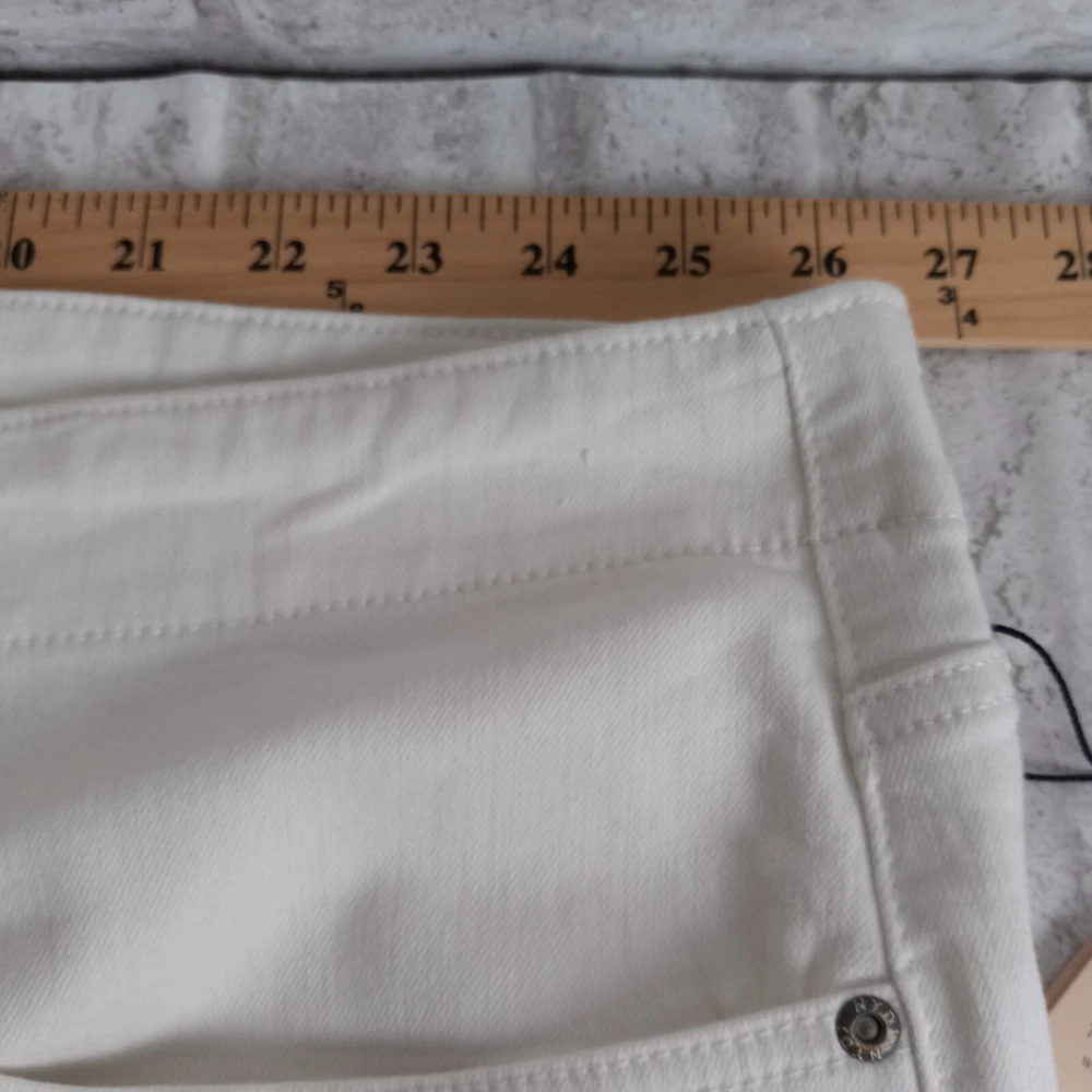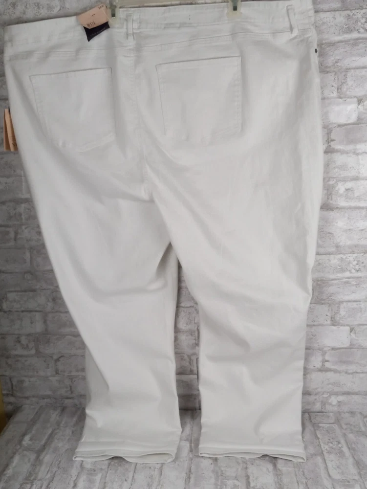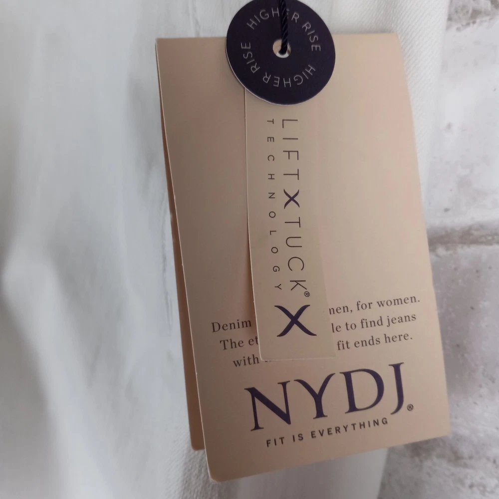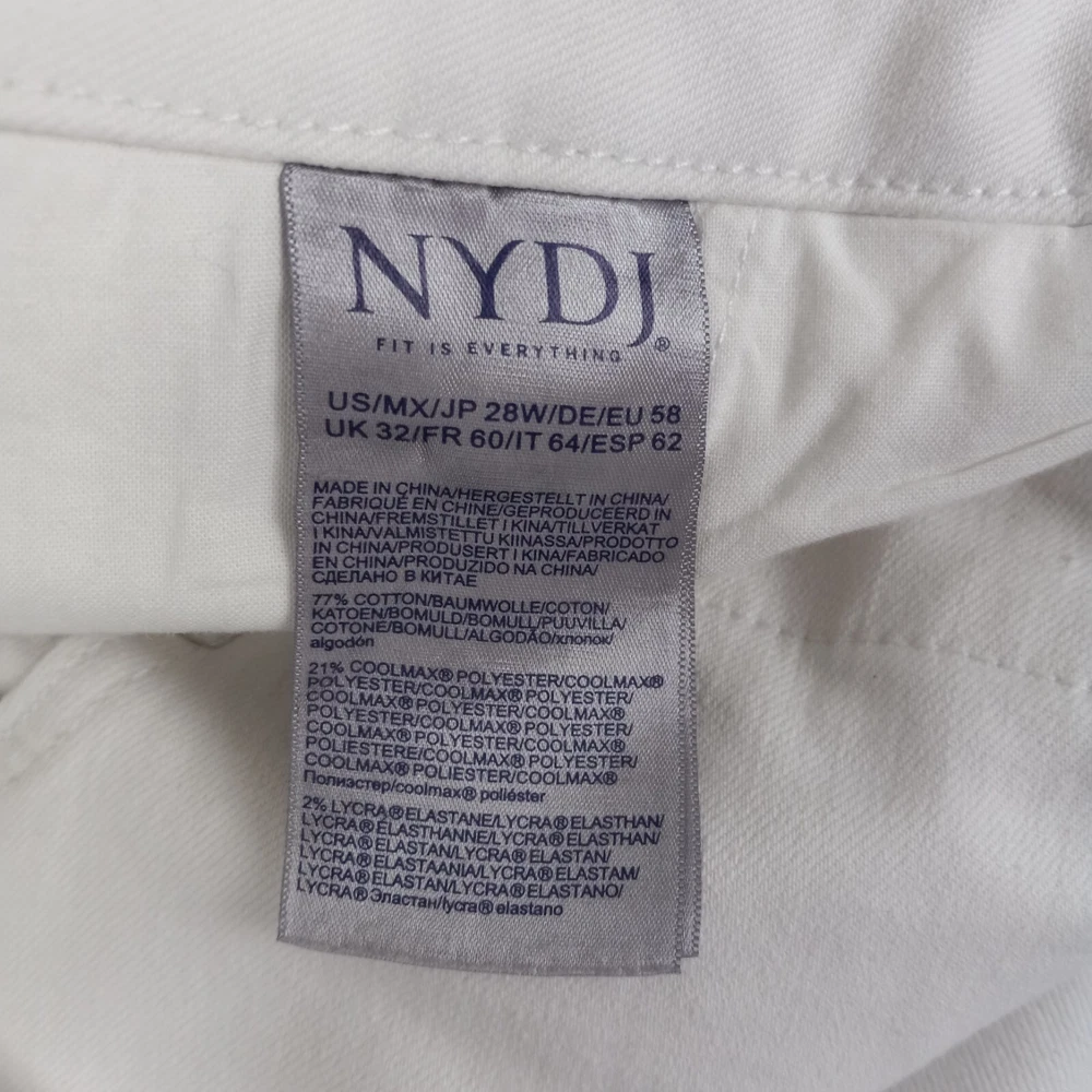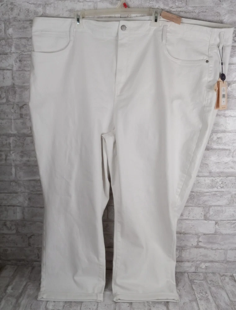 Elevate your summer style with these high-rise, plus-sized denim jeans from NYDJ. Featuring a solid white color and a 5-pocket design with button and zip closure, these jeans are perfect for a day at the beach or a casual outing. The cotton blend material is machine washable and offers a comfortable and stretchy fit, making them ideal for any occasion. The optic white cool embrace girlfriend model is a must-have for any fashion-forward woman who wants to look and feel her best. With a waist size of 50 inches and an inseam of 28 inches, these jeans are designed to fit and flatter. So why wait? Add these stylish jeans to your wardrobe today and experience the ultimate in comfort and style. See pics for details and measurements The bottoms of the jeans have a crease from the jeans being folded up at the ankles. The fold will come out with a wash.