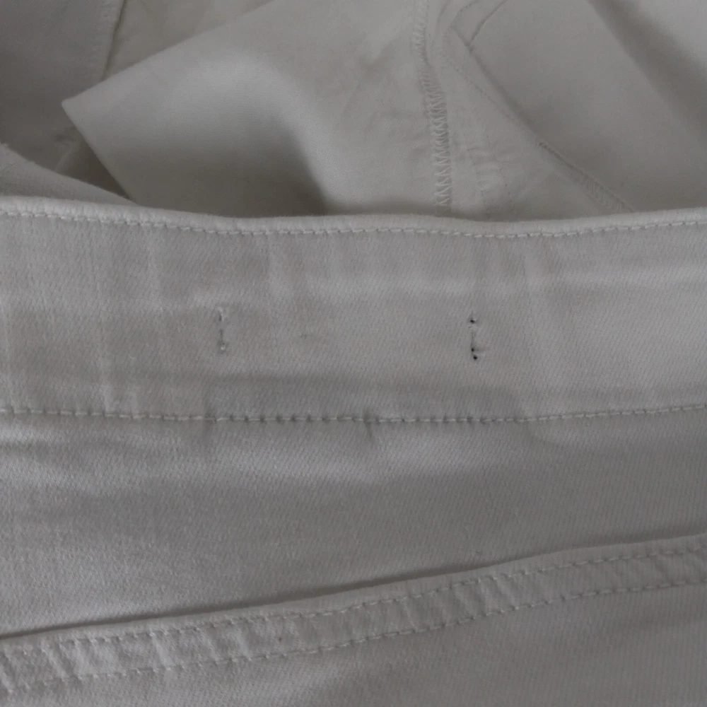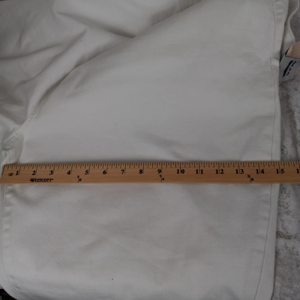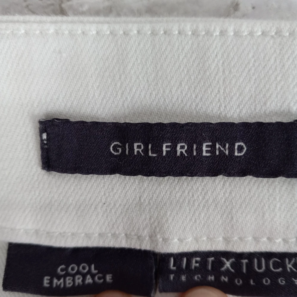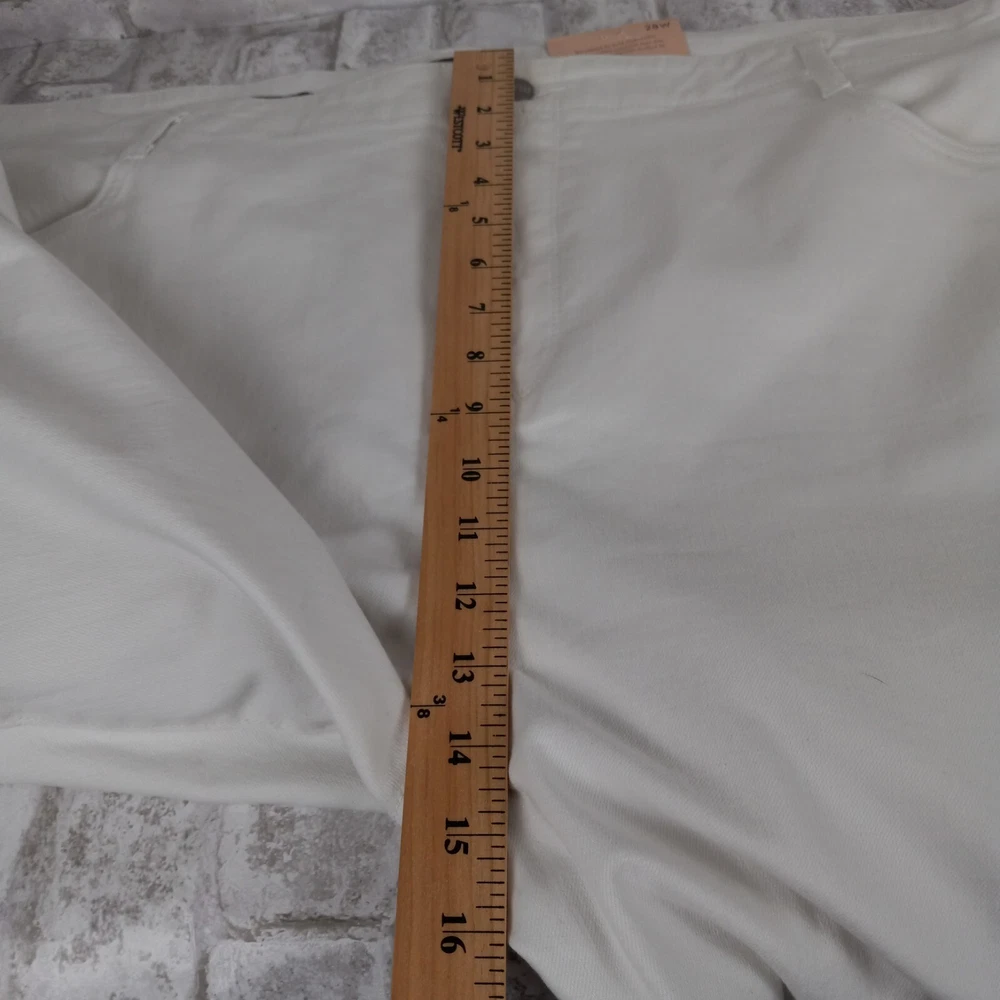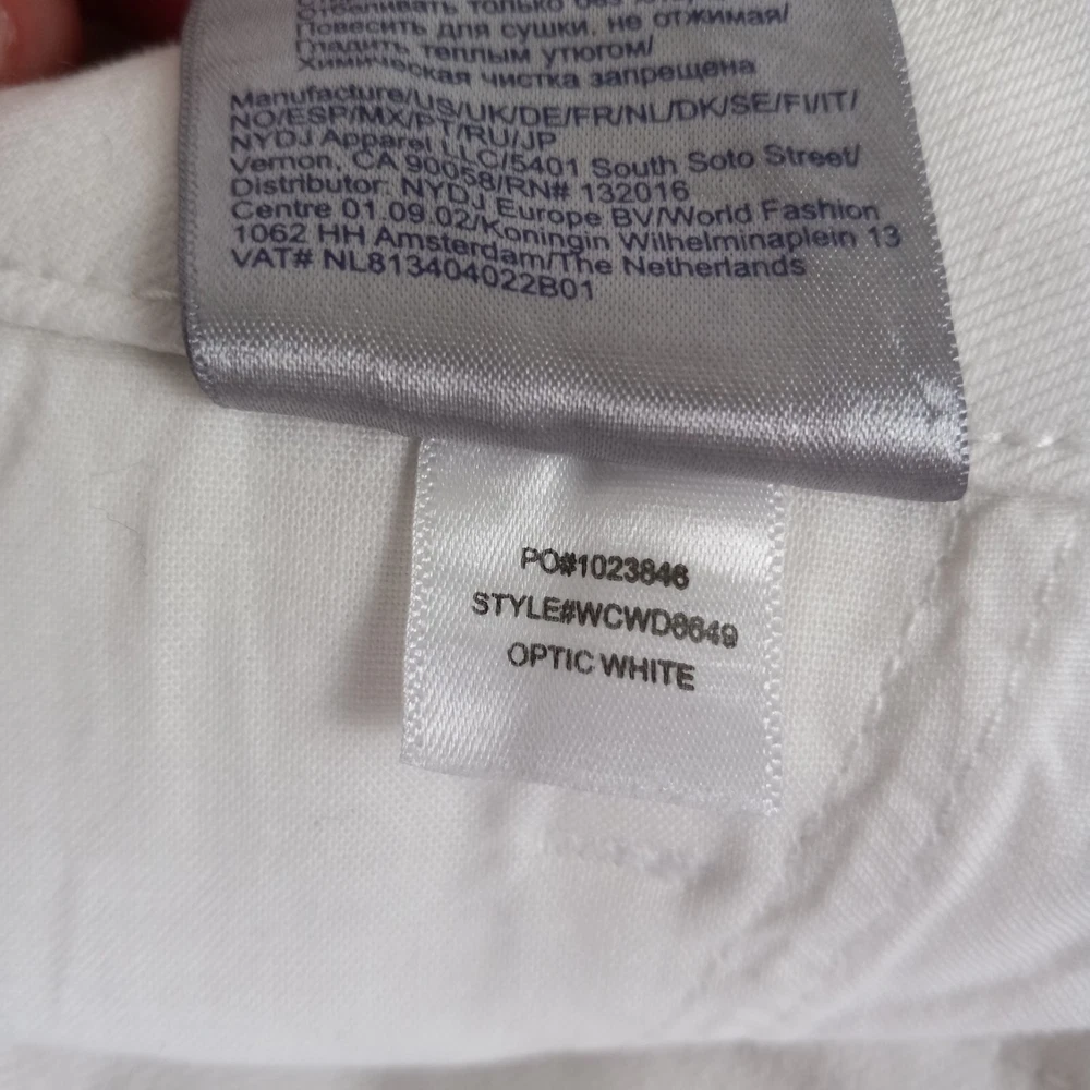 Elevate your summer style with these high-rise, plus-sized denim jeans from NYDJ. Featuring a solid white color and a 5-pocket design with button and zip closure, these jeans are perfect for a day at the beach or a casual outing. The cotton blend material is machine washable and offers a comfortable and stretchy fit, making them ideal for any occasion. The optic white cool embrace girlfriend model is a must-have for any fashion-forward woman who wants to look and feel her best. With a waist size of 50 inches and an inseam of 28 inches, these jeans are designed to fit and flatter. So why wait? Add these stylish jeans to your wardrobe today and experience the ultimate in comfort and style. See pics for details and measurements The bottoms of the jeans have a crease from the jeans being folded up at the ankles. The fold will come out with a wash.