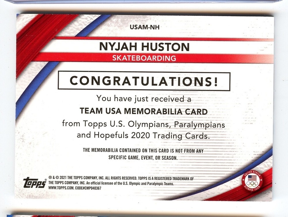 The product is a 2020 Topps sports trading card featuring professional skateboarder Nyjah Huston, representing Team USA in the Olympics. This specific card is a memorabilia relic card, denoted by the inclusion of a piece of memorabilia from Huston. The card number is USAM-NH, and it is part of the 2020 Topps USA Olympics set. This collectible item appeals to fans of skateboarding and sports trading cards, offering a unique piece of memorabilia from a prominent athlete.